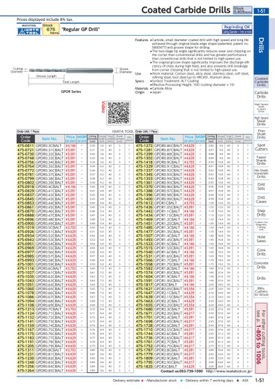PRICESDISPLAYEDINCLUDE8%TAX.VIDEOGPDRSERIESTOTALLENGTHGROOVELENGTHIWATATOOL"REGULARGPDRILL"REGRINDINGOKORDERCODEITEMNO.PRICE(PERPIECE)MSRP(PERPIECE)CUTTINGDIAMETER(MM)GROOVELENGTH(MM)TOTALLENGTH(MM)SHANKDIAMETER(MM)SPQ(PIECE)475-0811GPDR0.3CBALT¥4,166-0.303.64031475-0721GPDR0.31CBALT¥5,091-0.313.64031475-0730GPDR0.32CBALT¥5,091-0.323.64031475-0748GPDR0.33CBALT¥5,091-0.333.64031475-0756GPDR0.34CBALT¥5,091-0.343.64031475-0764GPDR0.35CBALT¥5,091-0.354.24031475-0772GPDR0.36CBALT¥5,091-0.364.24031475-0781GPDR0.37CBALT¥5,091-0.374.24031475-0799GPDR0.38CBALT¥5,091-0.384.24031475-0802GPDR0.39CBALT¥5,091-0.394.24031475-0918GPDR0.4CBALT¥4,166-0.404.84031475-0829GPDR0.41CBALT¥5,091-0.414.84031475-0837GPDR0.42CBALT¥5,091-0.424.84031475-0845GPDR0.43CBALT¥5,091-0.434.84031475-0853GPDR0.44CBALT¥5,091-0.444.84031475-0861GPDR0.45CBALT¥5,091-0.455.44031475-0870GPDR0.46CBALT¥5,091-0.465.44031475-0888GPDR0.47CBALT¥5,091-0.475.44031475-0896GPDR0.48CBALT¥5,091-0.485.44031475-0900GPDR0.49CBALT¥5,091-0.495.44031475-1019GPDR0.5CBALT¥3,703-0.506.04031475-0926GPDR0.51CBALT¥4,629-0.516.04031475-0934GPDR0.52CBALT¥4,629-0.526.04031475-0942GPDR0.53CBALT¥4,629-0.536.04031475-0951GPDR0.54CBALT¥4,629-0.546.04031475-0969GPDR0.55CBALT¥4,629-0.556.04031475-0977GPDR0.56CBALT¥4,629-0.566.04031475-0985GPDR0.57CBALT¥4,629-0.576.04031475-0993GPDR0.58CBALT¥4,629-0.586.04031475-1001GPDR0.59CBALT¥4,629-0.596.04031475-1116GPDR0.6CBALT¥3,703-0.607.24031475-1027GPDR0.61CBALT¥4,629-0.617.24031475-1035GPDR0.62CBALT¥4,629-0.627.24031475-1043GPDR0.63CBALT¥4,629-0.637.24031475-1051GPDR0.64CBALT¥4,629-0.647.24031475-1060GPDR0.65CBALT¥4,629-0.657.24031475-1078GPDR0.66CBALT¥4,629-0.667.24031475-1086GPDR0.67CBALT¥4,629-0.677.24031475-1094GPDR0.68CBALT¥4,629-0.687.24031475-1108GPDR0.69CBALT¥4,629-0.697.24031475-1213GPDR0.7CBALT¥3,703-0.708.44031475-1124GPDR0.71CBALT¥4,629-0.718.44031475-1132GPDR0.72CBALT¥4,629-0.728.44031475-1141GPDR0.73CBALT¥4,629-0.738.44031475-1159GPDR0.74CBALT¥4,629-0.748.44031475-1167GPDR0.75CBALT¥4,629-0.758.44031475-1175GPDR0.76CBALT¥4,629-0.768.44031475-1183GPDR0.77CBALT¥4,629-0.778.44031475-1191GPDR0.78CBALT¥4,629-0.788.44031475-1205GPDR0.79CBALT¥4,629-0.798.44031475-1311GPDR0.8CBALT¥3,703-0.809.64031475-1221GPDR0.81CBALT¥4,629-0.819.64031475-1230GPDR0.82CBALT¥4,629-0.829.64031475-1248GPDR0.83CBALT¥4,629-0.839.64031475-1256GPDR0.84CBALT¥4,629-0.849.64031475-1264GPDR0.85CBALT¥4,629-0.859.64031STOCK675ITEMSORDERUNIT:1PIECEIWATATOOLFEATURES●CARBIDE,SMALLDIAMETERCOATEDDRILLWITHHIGHSPEEDANDLONGLIFEACHIEVEDTHROUGHORIGINALBLADEEDGESHAPE(PATENTED:PATENTNO.5800477)ANDGROOVESHAPEFORDRILLING.●THETWO-STAGETIPANGLESIGNIFICANTLYREDUCESWEARANDCHIPPINGONTHECORNERTHANCONVENTIONALDRILLSANDHASGREATERPERFORMANCETHANCONVENTIONALDRILLSTHATISNOTLIMITEDTOHIGH-SPEEDUSE.●THEORIGINALGROOVESHAPESIGNIFICANTLYIMPROVESTHEDISCHARGEEFFI-CIENCYOFCHIPSDURINGHIGHFEED,ANDALSOPREVENTSDRILLBREAKAGEFROMCORNERCHIPPINGTHATISNOTLIMITEDTOHIGH-SPEEDUSE.USE●WORKMATERIAL:CARBONSTEEL,ALLOYSTEEL,STAINLESSSTEEL,SOFTSTEEL,REFININGSTEEL,TOOLSTEEL(UPTOHRC40),TITANIUMALLOY.SPECS●SURFACETREATMENT:ALTCOATING●EFFECTIVEPROCESSINGHEIGHT:10D(CUTTINGDIAMETERX10)MATERIALS●CARBIDEALLOYORIGIN●JAPANCUTTINGDIAMETER=1MMORMOREORDERCODEITEMNO.PRICE(PERPIECE)MSRP(PERPIECE)CUTTINGDIAMETER(MM)GROOVELENGTH(MM)TOTALLENGTH(MM)SHANKDIAMETER(MM)SPQ(PIECE)475-1272GPDR0.86CBALT¥4,629-0.869.64031475-1281GPDR0.87CBALT¥4,629-0.879.64031475-1299GPDR0.88CBALT¥4,629-0.889.64031475-1302GPDR0.89CBALT¥4,629-0.899.64031475-1418GPDR0.9CBALT¥3,703-0.9010.84031475-1329GPDR0.91CBALT¥4,629-0.9110.84031475-1337GPDR0.92CBALT¥4,629-0.9210.84031475-1345GPDR0.93CBALT¥4,629-0.9310.84031475-1353GPDR0.94CBALT¥4,629-0.9410.84031475-1361GPDR0.95CBALT¥4,629-0.9510.84031475-1370GPDR0.96CBALT¥4,629-0.9610.84031475-1388GPDR0.97CBALT¥4,629-0.9710.84031475-1396GPDR0.98CBALT¥4,629-0.9810.84031475-1400GPDR0.99CBALT¥4,629-0.9910.84031475-1612GPDR1CBALT¥3,703-1.0012.05031475-1426GPDR1.05CBALT¥5,091-1.0512.05031475-1442GPDR1.1CBALT¥4,166-1.1012.05031475-1434GPDR1.15CBALT¥5,091-1.1512.05031475-1469GPDR1.2CBALT¥4,166-1.2014.45031475-1451GPDR1.25CBALT¥5,091-1.2514.45031475-1485GPDR1.3CBALT¥4,166-1.3014.45031475-1477GPDR1.35CBALT¥5,091-1.3514.45031475-1507GPDR1.4CBALT¥4,166-1.4016.85031475-1493GPDR1.45CBALT¥5,091-1.4516.85031475-1523GPDR1.5CBALT¥4,166-1.5016.85031475-1515GPDR1.55CBALT¥5,091-1.5516.85031475-1540GPDR1.6CBALT¥4,166-1.6019.25031475-1531GPDR1.65CBALT¥5,091-1.6519.25031475-1566GPDR1.7CBALT¥4,166-1.7019.25031475-1558GPDR1.75CBALT¥5,091-1.7519.25031475-1582GPDR1.8CBALT¥4,166-1.8021.65031475-1574GPDR1.85CBALT¥5,091-1.8521.65031475-1604GPDR1.9CBALT¥4,166-1.9021.65031475-1591GPDR1.95CBALT¥5,091-1.9521.65031475-1817GPDR2CBALT¥4,166-2.0024.06031475-1621GPDR2.05CBALT¥5,554-2.0524.06031475-1647GPDR2.1CBALT¥4,629-2.1024.06031475-1639GPDR2.15CBALT¥5,554-2.1524.06031475-1663GPDR2.2CBALT¥4,629-2.2024.06031475-1655GPDR2.25CBALT¥5,554-2.2524.06031475-1680GPDR2.3CBALT¥5,091-2.3027.66041475-1671GPDR2.35CBALT¥6,017-2.3527.66041475-1701GPDR2.4CBALT¥5,091-2.4027.66041475-1698GPDR2.45CBALT¥6,017-2.4527.66041475-1728GPDR2.5CBALT¥5,091-2.5027.66041475-1710GPDR2.55CBALT¥6,017-2.5527.66041475-1744GPDR2.6CBALT¥5,091-2.6031.26041475-1736GPDR2.65CBALT¥6,017-2.6531.26041475-1761GPDR2.7CBALT¥5,091-2.7031.26041475-1752GPDR2.75CBALT¥6,017-2.7531.26041475-1787GPDR2.8CBALT¥5,091-2.8033.66041475-1779GPDR2.85CBALT¥6,017-2.8533.66041475-1809GPDR2.9CBALT¥5,091-2.9033.66041475-1795GPDR2.95CBALT¥6,017-2.9533.66041475-1825GPDR3CBALT¥4,629-3.0036.06041CONTACTUS:052-739-1090HTTP://WWW.IWATATOOL.CO.JP/ORDERUNIT:1PIECEDRILLSCOATEDCARBIDEDRILLSCARBIDEDRILLSHIGHSPEEDSTEELCOATEDDRILLSHIGHSPEEDSTEELDRILLSTHINSHAFTDRILLSSPOTCUTTERSTAPERSHANKDRILLSHEXSHANKIRONSMITHDRILLSDRILLSETSDRILLCASESSTEPDRILLSCUTTERSFORMAGNETICCUTTINGUNITHOLESAWSCOREDRILLSCONCRETEDRILLSDRILLSBITS,CUTTERSFORWOODCOATEDCARBIDEDRILLSSTOCK5,905ITEMS1-51*0101540*1-51FOROTHERCUTTINGTO