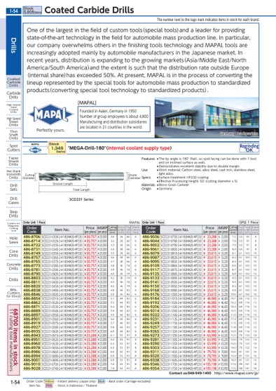 THENUMBERNEXTTOTHELOGOMARKINDICATESITEMSINSTOCKFOREACHBRAND.SCD231SERIESTOTALLENGTHGROOVELENGTHONEOFTHELARGESTINTHEFIELDOFCUSTOMTOOLS(SPECIALTOOLS)ANDALEADERFORPROVIDINGSTATE-OF-THE-ARTTECHNOLOGYINTHEFIELDFORAUTOMOBILEMASSPRODUCTIONLINE.INPARTICULAR,OURCOMPANYOVERWHELMSOTHERSINTHEFINISHINGTOOLSTECHNOLOGYANDMAPALTOOLSAREINCREASINGLYADOPTEDMAINLYBYAUTOMOBILEMANUFACTURERSINTHEJAPANESEMARKET.INRECENTYEARS,DISTRIBUTIONISEXPANDINGTOTHEGROWINGMARKETS(ASIA/MIDDLEEAST/NORTHAMERICA/SOUTHAMERICA)ANDTHEEXTENTISSUCHTHATTHEDISTRIBUTIONRATEOUTSIDEEUROPE(INTERNALSHARE)HASEXCEEDED50%.ATPRESENT,MAPALISINTHEPROCESSOFCONVERTINGTHELINEUPREPRESENTEDBYTHESPECIALTOOLSFORAUTOMOBILEMASSPRODUCTIONTOSTANDARDIZEDPRODUCTS(CONVERTINGSPECIALTOOLTECHNOLOGYTOSTANDARDIZEDPRODUCTS).PERFECTLYYOURS.FOUNDEDINAALEN,GERMANYIN1950NUMBEROFGROUPEMPLOYEESISABOUT4,800MANUFACTURINGANDDISTRIBUTIONSUBSIDIARIESARELOCATEDIN21COUNTRIESINTHEWORLD[MAPAL]GERMANYHEADQUARTERSCUTTINGDIAMETERSHANKDIAMETERMAPAL"MEGA-DRILL-180"(INTERNALCOOLANTSUPPLYTYPE)REGRINDINGOKORDERCODEITEMNO.PRICE(PERPIECE)MSRP(PERPIECE)CUTTINGDIAMETER(MM)GROOVELENGTH(MM)TOTALLENGTH(MM)SHANKDIAMETER(MM)486-8706SCD231-0300-2-4-180HA05-HP230¥20,757¥20,5003.028666486-8714SCD231-0320-2-4-180HA05-HP230¥20,757¥20,5003.228666486-8722SCD231-0330-2-4-180HA05-HP230¥20,757¥20,5003.328666486-8731SCD231-0340-2-4-180HA05-HP230¥20,757¥20,5003.428666486-8749SCD231-0350-2-4-180HA05-HP230¥20,757¥20,5003.528666486-8757SCD231-0360-2-4-180HA05-HP230¥20,757¥20,5003.628666486-8765SCD231-0370-2-4-180HA05-HP230¥20,757¥20,5003.728666486-8773SCD231-0380-2-4-180HA05-HP230¥20,757¥20,5003.836746486-8781SCD231-0390-2-4-180HA05-HP230¥20,757¥20,5003.936746486-8790SCD231-0400-2-4-180HA05-HP230¥20,757¥20,5004.036746486-8803SCD231-0420-2-4-180HA05-HP230¥20,757¥20,5004.236746486-8811SCD231-0430-2-4-180HA05-HP230¥20,757¥20,5004.336746486-8820SCD231-0450-2-4-180HA05-HP230¥20,757¥20,5004.536746486-8838SCD231-0480-2-4-180HA05-HP230¥20,757¥20,5004.844826486-8846SCD231-0500-2-4-180HA05-HP230¥20,757¥20,5005.044826486-8854SCD231-0510-2-4-180HA05-HP230¥20,757¥20,5005.144826486-8862SCD231-0520-2-4-180HA05-HP230¥20,757¥20,5005.244826486-8871SCD231-0530-2-4-180HA05-HP230¥20,757¥20,5005.344826486-8889SCD231-0540-2-4-180HA05-HP230¥20,757¥20,5005.444826486-8897SCD231-0550-2-4-180HA05-HP230¥20,757¥20,5005.544826486-8901SCD231-0560-2-4-180HA05-HP230¥20,757¥20,5005.644826486-8919SCD231-0570-2-4-180HA05-HP230¥20,757¥20,5005.744826486-8927SCD231-0580-2-4-180HA05-HP230¥20,757¥20,5005.844826486-8935SCD231-0600-2-4-180HA05-HP230¥20,757¥20,5006.044826486-8943SCD231-0610-2-4-180HA05-HP230¥23,288¥23,0006.153918486-8951SCD231-0620-2-4-180HA05-HP230¥23,288¥23,0006.253918486-8960SCD231-0630-2-4-180HA05-HP230¥23,288¥23,0006.353918486-8978SCD231-0650-2-4-180HA05-HP230¥23,288¥23,0006.553918486-8986SCD231-0660-2-4-180HA05-HP230¥23,288¥23,0006.653918486-8994SCD231-0680-2-4-180HA05-HP230¥23,288¥23,0006.853918486-9001SCD231-0690-2-4-180HA05-HP230¥23,288¥23,0006.953918486-9010SCD231-0700-2-4-180HA05-HP230¥23,288¥23,0007.053918486-9028SCD231-0740-2-4-180HA05-HP230¥23,288¥23,0007.453918STOCK1,349ITEMSORDERUNIT:1PIECEMAPALFEATURES●THETIPANGLEIS180°(FLAT),SOSPOTFACINGCANBEDONEWITH1TOOLANDONINCLINEDSURFACEASWELL.●DEMONSTRATESEXCELLENTSTABILITYDUETODOUBLEMARGIN.USE●WORKMATERIAL:CARBONSTEEL,ALLOYSTEEL,CASTIRON,STAINLESSSTEEL,LIGHTALLOY.SPECS●SURFACETREATMENT:HP230COATING●EFFECTIVEPROCESSINGHEIGHT:5D(CUTTINGDIAMETERX5)MATERIALS●MICROGRAINCARBIDEORIGIN●GERMANYORDERCODEITEMNO.PRICE(PERPIECE)MSRP(PERPIECE)CUTTINGDIAMETER(MM)GROOVELENGTH(MM)TOTALLENGTH(MM)SHANKDIAMETER(MM)486-9036SCD231-0750-2-4-180HA05-HP230¥23,288¥23,0007.553918486-9044SCD231-0780-2-4-180HA05-HP230¥23,288¥23,0007.853918486-9052SCD231-0790-2-4-180HA05-HP230¥23,288¥23,0007.953918486-9061SCD231-0800-2-4-180HA05-HP230¥23,288¥23,0008.053918486-9079SCD231-0810-2-4-180HA05-HP230¥33,615¥33,2008.16110310486-9087SCD231-0820-2-4-180HA05-HP230¥33,615¥33,2008.26110310486-9095SCD231-0850-2-4-180HA05-HP230¥33,615¥33,2008.56110310486-9109SCD231-0860-2-4-180HA05-HP230¥33,615¥33,2008.66110310486-9117SCD231-0870-2-4-180HA05-HP230¥33,615¥33,2008.76110310486-9125SCD231-0880-2-4-180HA05-HP230¥33,615¥33,2008.86110310486-9133SCD231-0900-2-4-180HA05-HP230¥33,615¥33,2009.06110310486-9141SCD231-0930-2-4-180HA05-HP230¥33,615¥33,2009.36110310486-9150SCD231-0950-2-4-180HA05-HP230¥33,615¥33,2009.56110310486-9168SCD231-0980-2-4-180HA05-HP230¥33,615¥33,2009.86110310486-9176SCD231-1000-2-4-180HA05-HP230¥33,615¥33,20010.06110310486-9184SCD231-1010-2-4-180HA05-HP230¥46,980¥46,40010.16911612486-9192SCD231-1020-2-4-180HA05-HP230¥46,980¥46,40010.26911612486-9206SCD231-1030-2-4-180HA05-HP230¥46,980¥46,40010.36911612486-9214SCD231-1050-2-4-180HA05-HP230¥46,980¥46,40010.56911612486-9222SCD231-1100-2-4-180HA05-HP230¥46,980¥46,40011.06911612486-9231SCD231-1120-2-4-180HA05-HP230¥46,980¥46,40011.26911612486-9249SCD231-1150-2-4-180HA05-HP230¥46,980¥46,40011.56911612486-9257SCD231-1180-2-4-180HA05-HP230¥46,980¥46,40011.86911612486-9265SCD231-1200-2-4-180HA05-HP230¥46,980¥46,40012.06911612486-9273SCD231-1250-2-4-180HA05-HP230¥63,990¥63,20012.57512214486-9281SCD231-1300-2-4-180HA05-HP230¥63,990¥63,20013.07512214486-9290SCD231-1350-2-4-180HA05-HP230¥63,990¥63,20013.57512214486-9303SCD231-1400-2-4-180HA05-HP230¥63,990¥63,20014.07512214486-9311SCD231-1450-2-4-180HA05-HP230¥79,785¥78,80014.58113116486-9320SCD231-1500-2-4-180HA05-HP230¥79,785¥78,80015.08113116486-9338SCD231-1600-2-4-180HA05-HP230¥79,785¥78,80016.08113116486-9346SCD231-1700-2-4-180HA05-HP230¥105,198¥103,90017.09914118486-9354SCD231-1750-2-4-180HA05-HP230¥105,198¥103,90017.59914118CONTACTUS:048-949-1400HTTP://WWW.MAPAL.COM/JP/SPQ:1PIECEORDERUNIT:1PIECEDRILLSCOATEDCARBIDEDRILLSCARBIDEDRILLSHIGHSPEEDSTEELCOATEDDRILLSHIGHSPEEDSTEELDRILLSTHINSHAFTDRILLSSPOTCUTTERSTAPERSHANKDRILLSHEXSHANKIRONSMITHDRILLSDRILLSETSDRILLCASESSTEPDRILLSCUTTERSFO