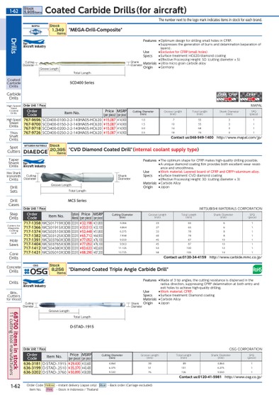 THENUMBERNEXTTOTHELOGOMARKINDICATESITEMSINSTOCKFOREACHBRAND.MCSSERIESTOTALLENGTHGROOVELENGTHTOTALLENGTHGROOVELENGTHD-STAD-.1915TOTALLENGTHGROOVELENGTHSCD400SERIESCUTTINGDIAMETERSHANKDIAMETERCUTTINGDIAMETERSHANKDIAMETERCUTTINGDIAMETERSHANKDIAMETERMAPAL"MEGA-DRILL-COMPOSITE"ORDERCODEITEMNO.PRICE(PERPIECE)MSRP(PERPIECE)CUTTINGDIAMETER(MM)GROOVELENGTH(MM)TOTALLENGTH(MM)SHANKDIAMETER(MM)SPQ(PIECE)767-9696SCD400-0100-2-2-140HA05-HC620¥15,087¥14,9001.075531767-9700SCD400-0150-2-2-140HA05-HC620¥15,087¥14,9001.5105531767-9718SCD400-0200-2-2-140HA05-HC620¥15,087¥14,9002.0146831767-9726SCD400-0250-2-2-140HA05-HC620¥15,087¥14,9002.5187431CONTACTUS:048-949-1400HTTP://WWW.MAPAL.COM/JP/MITSUBISHIMATERIALS"CVDDIAMONDCOATEDDRILL"(INTERNALCOOLANTSUPPLYTYPE)ORDERCODEITEMNO.OPTIONS(MATERIAL)PRICE(PERPIECE)MSRP(PERPIECE)CUTTINGDIAMETER(MM)GROOVELENGTH(MM)TOTALLENGTH(MM)SHANKDIAMETER(MM)SPQ(PIECE)717-1358MCS01719X3DBDD2010¥32,198¥31,8004.366236561717-1366MCS01915X3DBDD2010¥33,513¥33,1004.864276561717-1374MCS02510X3DBDD2010¥52,448¥51,8006.375337881717-1382MCS03125X3DBDD2010¥65,712¥64,9007.938407881717-1391MCS03760X3DBDD2010¥77,052¥76,1009.5504587101717-1404MCS03765X3DBDD2010¥77,052¥76,1009.5634587101717-1412MCS04380X3DBDD2010¥83,633¥82,60011.12553100121717-1421MCS05010X3DBDD2010¥88,290¥87,20012.72558105141CONTACTUS:0120-34-4159HTTP://WWW.CARBIDE.MMC.CO.JP/OSG"DIAMONDCOATEDTRIPLEANGLECARBIDEDRILL"ORDERCODEITEMNO.PRICE(PERPIECE)MSRP(PERPIECE)CUTTINGDIAMETER(MM)GROOVELENGTH(MM)TOTALLENGTH(MM)SHANKDIAMETER(MM)SPQ(PIECE)636-3181D-STAD-.1915¥29,430¥33,6004.86439894.8641636-3199D-STAD-.2510¥35,370¥40,4006.375511016.3751636-3202D-STAD-.3760¥50,895¥58,0009.550761269.5501CONTACTUS:0120-41-5981HTTP://WWW.OSG.CO.JP/STOCK8,256ITEMSSTOCK20,395ITEMSSTOCK1,349ITEMSORDERUNIT:1PIECEOSGCORPORATIONORDERUNIT:1PIECEMITSUBISHIMATERIALSCORPORATIONORDERUNIT:1PIECEMAPALFEATURES●OPTIMUMDESIGNFORDRILLINGSMALLHOLESINCFRP.●SUPPRESSESTHEGENERATIONOFBURRSANDDELAMINATION(SEPARATIONOFLAYERS).USE●EXCLUSIVEFORCFRP(SMALLHOLES)SPECS●SURFACETREATMENT:HC620/DIAMONDCOATING●EFFECTIVEPROCESSINGHEIGHT:5D(CUTTINGDIAMETERX5)MATERIALS●ULTRAMICROGRAINCARBIDEALLOYORIGIN●GERMANYFEATURES●THEOPTIMUMSHAPEFORCFRPMAKESHIGH-QUALITYDRILLINGPOSSIBLE.●AUNIQUEDIAMONDCOATINGFILMPROVIDESBOTHEXCELLENTWEARRESIST-ANCEANDSMOOTHNESS.USE●WORKMATERIAL:LAYEREDBOARDOFCFRPANDCRFP+ALUMINUMALLOY.SPECS●SURFACETREATMENT:CVDDIAMONDCOATING●EFFECTIVEPROCESSINGHEIGHT:3D(CUTTINGDIAMETERX3)MATERIALS●CARBIDEALLOYORIGIN●JAPANFEATURES●MADEOF3TIPANGLES,THECUTTINGRESISTANCEISDISPERSEDINTHERADIUSDIRECTION,SUPPRESSINGCFRPDELAMINATIONATBOTHENTRYANDEXITHOLESTOACHIEVEHIGH-QUALITYDRILLING.USE●WORKMATERIAL:CFRP.SPECS●SURFACETREATMENT:DIAMONDCOATINGMATERIALS●CARBIDEALLOYORIGIN●JAPANDRILLSCOATEDCARBIDEDRILLSCARBIDEDRILLSHIGHSPEEDSTEELCOATEDDRILLSHIGHSPEEDSTEELDRILLSTHINSHAFTDRILLSSPOTCUTTERSTAPERSHANKDRILLSHEXSHANKIRONSMITHDRILLSDRILLSETSDRILLCASESSTEPDRILLSCUTTERSFORMAGNETICCUTTINGUNITHOLESAWSCOREDRILLSCONCRETEDRILLSDRILLSBITS,CUTTERSFORWOODSTOCK5,905ITEMSCOATEDCARBIDEDRILLS(FORAIRCRAFT)1-62*0101610*1-6268700ITEMSINSTOCK11CUTTINGTOOLMANUFACTURERSORDERCODEYELLOW…INSTANTDELIVERY(JAPANONLY)BLUE…BACKORDER(CARRIAGEEXCLUDED)ITEMNO.PINK…STOCKININDONESIA/THAILAND