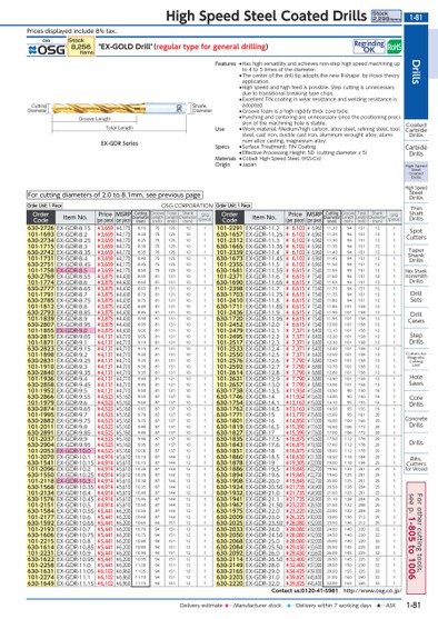 PRICESDISPLAYEDINCLUDE8%TAX.TOTALLENGTHGROOVELENGTHEX-GDRSERIESFORCUTTINGDIAMETERSOF2.0TO8.1MM,SEEPREVIOUSPAGECUTTINGDIAMETERSHANKDIAMETEROSG"EX-GOLDDRILL"(REGULARTYPEFORGENERALDRILLING)REGRINDINGOKSTOCK8,256ITEMSORDERUNIT:1PIECEOSGCORPORATIONORDERCODEITEMNO.PRICE(PERPIECE)MSRP(PERPIECE)CUTTINGDIAMETER(MM)GROOVELENGTH(MM)TOTALLENGTH(MM)SHANKDIAMETER(MM)SPQ(PIECE)630-2726EX-GDR-8.15¥3,659¥4,1708.1575125101101-1693EX-GDR-8.2¥3,659¥4,1708.2075125101630-2734EX-GDR-8.25¥3,659¥4,1708.2575125101101-1715EX-GDR-8.3¥3,659¥4,1708.3075125101630-2742EX-GDR-8.35¥3,659¥4,1708.3575125101101-1731EX-GDR-8.4¥3,659¥4,1708.4075125101630-2751EX-GDR-8.45¥3,659¥4,1708.4575125101101-1758EX-GDR-8.5¥3,659¥4,1708.5075125101630-2769EX-GDR-8.55¥3,875¥4,4308.5581131101101-1774EX-GDR-8.6¥3,875¥4,4308.6081131101630-2777EX-GDR-8.65¥3,875¥4,4308.6581131101101-1791EX-GDR-8.7¥3,875¥4,4308.7081131101630-2785EX-GDR-8.75¥3,875¥4,4308.7581131101101-1812EX-GDR-8.8¥3,875¥4,4308.8081131101630-2793EX-GDR-8.85¥3,875¥4,4308.8581131101101-1839EX-GDR-8.9¥3,875¥4,4308.9081131101630-2807EX-GDR-8.95¥3,875¥4,4308.9581131101101-1855EX-GDR-9.0¥3,875¥4,4309.0081131101630-2815EX-GDR-9.05¥4,131¥4,7109.0581131101101-1871EX-GDR-9.1¥4,131¥4,7109.1081131101630-2823EX-GDR-9.15¥4,131¥4,7109.1581131101101-1898EX-GDR-9.2¥4,131¥4,7109.2081131101630-2831EX-GDR-9.25¥4,131¥4,7109.2581131101101-1910EX-GDR-9.3¥4,131¥4,7109.3081131101630-2840EX-GDR-9.35¥4,131¥4,7109.3581131101101-1936EX-GDR-9.4¥4,131¥4,7109.4081131101630-2858EX-GDR-9.45¥4,131¥4,7109.4581131101101-1952EX-GDR-9.5¥4,131¥4,7109.5081131101630-2866EX-GDR-9.55¥4,523¥5,1609.5587137101101-1979EX-GDR-9.6¥4,523¥5,1609.6087137101630-2874EX-GDR-9.65¥4,523¥5,1609.6587137101101-1995EX-GDR-9.7¥4,523¥5,1609.7087137101630-2882EX-GDR-9.75¥4,523¥5,1609.7587137101101-2011EX-GDR-9.8¥4,523¥5,1609.8087137101630-2891EX-GDR-9.85¥4,523¥5,1609.8587137101101-2037EX-GDR-9.9¥4,523¥5,1609.9087137101630-2904EX-GDR-9.95¥4,523¥5,1609.9587137101101-2053EX-GDR-10.0¥4,523¥5,16010.0087137101101-2070EX-GDR-10.1¥4,914¥5,61010.1087144121630-1541EX-GDR-10.15¥4,914¥5,61010.1587144121101-2096EX-GDR-10.2¥4,914¥5,61010.2087144121630-1550EX-GDR-10.25¥4,914¥5,61010.2587144121101-2118EX-GDR-10.3¥4,914¥5,61010.3087144121630-1568EX-GDR-10.35¥4,914¥5,61010.3587144121101-2134EX-GDR-10.4¥4,914¥5,61010.4087144121630-1576EX-GDR-10.45¥4,914¥5,61010.4587144121101-2151EX-GDR-10.5¥4,914¥5,61010.5087144121630-1584EX-GDR-10.55¥5,441¥6,20010.5587144121101-2177EX-GDR-10.6¥5,441¥6,20010.6087144121630-1592EX-GDR-10.65¥5,441¥6,20010.6594151121101-2193EX-GDR-10.7¥5,441¥6,20010.7094151121630-1606EX-GDR-10.75¥5,441¥6,20010.7594151121101-2215EX-GDR-10.8¥5,441¥6,20010.8094151121630-1614EX-GDR-10.85¥5,441¥6,20010.8594151121101-2231EX-GDR-10.9¥5,441¥6,20010.9094151121630-1622EX-GDR-10.95¥5,441¥6,20010.9594151121101-2258EX-GDR-11.0¥5,441¥6,20011.0094151121630-1631EX-GDR-11.05¥6,102¥6,96011.0594151121101-2274EX-GDR-11.1¥6,102¥6,96011.1094151121630-1649EX-GDR-11.15¥6,102¥6,96011.1594151121FEATURES●HASHIGHVERSATILITYANDACHIEVESNON-STEPHIGHSPEEDMACHININGUPTO4TO5TIMESOFTHEDIAMETER.●THECENTEROFTHEDRILLTIPADOPTSTHENEWR-SHAPEBYHOSOITHEORYAPPLICATION.●HIGHSPEEDANDHIGHFEEDISPOSSIBLE.STEPCUTTINGISUNNECESSARYDUETOTRANSITIONALBREAKINGTYPECHIPS.●EXCELLENTTINCOATINGINWEARRESISTANCEANDWELDINGRESISTANCEISADOPTED.●GROOVEFOAMISAHIGHRIGIDITYTHICKCORETYPE.●PUNCHINGANDCENTERINGAREUNNECESSARYSINCETHEPOSITIONINGPRECI-SIONOFTHEMACHININGHOLEISSTABLE.USE●WORKMATERIAL:MEDIUM/HIGHCARBON,ALLOYSTEEL,REFININGSTEEL,TOOLSTEEL,CASTIRON,DUCTILECASTIRON,ALUMINUMWROUGHTALLOY,ALUMI-NUMALLOYCASTING,MAGNESIUMALLOY.SPECS●SURFACETREATMENT:TINCOATING●EFFECTIVEPROCESSINGHEIGHT:5D(CUTTINGDIAMETERX5)MATERIALS●COBALTHIGHSPEEDSTEEL(HSS-CO)ORIGIN●JAPANORDERUNIT:1PIECEORDERCODEITEMNO.PRICE(PERPIECE)MSRP(PERPIECE)CUTTINGDIAMETER(MM)GROOVELENGTH(MM)TOTALLENGTH(MM)SHANKDIAMETER(MM)SPQ(PIECE)101-2291EX-GDR-11.2¥6,102¥6,96011.2094151121630-1657EX-GDR-11.25¥6,102¥6,96011.2594151121101-2312EX-GDR-11.3¥6,102¥6,96011.3094151121630-1665EX-GDR-11.35¥6,102¥6,96011.3594151121101-2339EX-GDR-11.4¥6,102¥6,96011.4094151121630-1673EX-GDR-11.45¥6,102¥6,96011.4594151121101-2355EX-GDR-11.5¥6,102¥6,96011.5094151121630-1681EX-GDR-11.55¥6,615¥7,54011.5594151121101-2371EX-GDR-11.6¥6,615¥7,54011.6094151121630-1690EX-GDR-11.65¥6,615¥7,54011.6594151121101-2398EX-GDR-11.7¥6,615¥7,54011.7094151121630-1703EX-GDR-11.75¥6,615¥7,54011.7594151121101-2410EX-GDR-11.8¥6,615¥7,54011.8094151121630-1711EX-GDR-11.85¥6,615¥7,54011.85101158121101-2436EX-GDR-11.9¥6,615¥7,54011.90101158121630-1720EX-GDR-11.95¥6,615¥7,54011.95101158121101-2452EX-GDR-12.0¥6,615¥7,54012.00101158121101-2479EX-GDR-12.1¥7,371¥8,40012.10101158121101-2495EX-GDR-12.2¥7,371¥8,40012.20101158121101-2517EX-GDR-12.3¥7,371¥8,40012.30101158121101-2533EX-GDR-12.4¥7,371¥8,40012.40101158121101-2550EX-GDR-12.5¥7,371¥8,40012.50101158121101-2576EX-GDR-12.6¥7,790¥8,88012.60101158121101-2592EX-GDR-12.7¥7,790¥8,88012.70101158121101-2614EX-GDR-12.8¥7,790¥8,88012.80101158121101-2631EX-GDR-12.9¥7,790¥8,88012.90101158121101-2657EX-GDR-13.0¥7,790¥8,88013.00101158121630-1738EX-GDR-13.5¥11,934¥13,60013.5090150161630-1746EX-GDR-14¥11,934¥13,60014.0090150161630-1754EX-GDR-14.1¥13,163¥15,00014.1095155161630-1762EX-GDR-14.5¥13,163¥15,00014.5095155161630-1771EX-GDR-15¥13,770¥15,80015.0095161201630-1801EX-GDR-16¥14,850¥17,00016.00100166201630-1819EX-GDR-16.5¥15,390¥17,60016.50106172201630-1827EX-GDR-17¥15,390¥17,60017.00106172201630-1835EX-GDR-17.5¥16,875¥19,30017.50112178201630-1843EX-GDR-17.6¥16,875¥19,30017.60112178201630-1851EX-GDR-18¥16,875¥19,30018.00112178201630-1860EX-GDR-18.5¥18,630¥21,30018.50118184201630-1878EX-GDR-19¥19,305¥22,00019.00118194251630-1886EX-GDR-19.5¥19,845¥22,70019.50125201251630-1894EX-GDR-19.6¥19,845¥22,70019.60125201251630-1908EX-GDR-20.0¥19,845¥22,70020.001252012