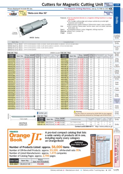 PRICESDISPLAYEDINCLUDE8%TAX.CUTTINGDIAMETERMX50SERIESITEMNO.COMPATIBLEMODELMX50-17.5TO35.0NITTOKOHKI(QA6500,A-5000,LO-3550A),IKURASEIKI(IS-LB40SW,IS-LB50SW),HITACHIKOKI(BM40M2)MX50-36.0TO40.0NITTOKOHKI(QA6500,A-5000),IKURASEIKI(IS-LB40SW,IS-LB50SW),HITACHIKOKI(BM40M2)MX50-41.0TO50.0NITTOKOHKI(QA6500,A-5000),IKURASEIKI(IS-LB50SW)MX50-51.0TO65.0NITTOKOHKI(QA6500)MXCP50-8(CENTERPIN)TOTALLENGTHDIAMETERPUBLISHEDONCEEVERY2YEARSAPRO-TOOLCOMPACTCATALOGTHATLISTSAWIDEVARIETYOFPRODUCTSALLINONE,INCLUDINGNEARLYEVERYCATEGORYONORANGE-BOOK!NUMBEROFPRODUCTSLISTED:APPROX.56,000ITEMSNUMBEROFOff-THE-SHELFPRODUCTS:APPROX.53,200,Off-THE-SHELFRATIO95%NUMBEROFLISTEDMANUFACTURERS:APPROX.1,419COMPANIESNUMBEROFCATALOGPAGES:APPROX.2,700PAGESORDERCODEITEMNO.PRICE(TAXNOTINCLUDED)858-5867OBJM2018E¥5,500●USETHECENTERPINPRODUCEDBYIKURASEIKIFORTHEMAGNETICDRILLINGMACHINESPRODUCEDBYOMIKOGYOANDHITACHIKOKI.WARNINGFORMAGNETICDRILLINGMACHINES,SEEP.5-198TO203UNIKA"META-COREMAX50"REGRINDINGOKORDERCODEITEMNO.PRICE(PERPIECE)MSRP(PERPIECE)CUTTINGDIAMETER(MM)MAXPROCESSEDSHEETTHICKNESS(MM)SPQ(PIECE)WEIGHT(G)448-8296MX50-17.5¥6,534¥8,80017.550187448-8300MX50-18.0¥6,534¥8,80018.050190448-8318MX50-19.0¥6,534¥8,80019.050194448-8326MX50-20.0¥6,534¥8,80020.050198448-8334MX50-21.0¥6,534¥8,80021.0501102448-8342MX50-21.5¥6,683¥9,00021.5501104448-8351MX50-22.0¥6,683¥9,00022.0501106448-8369MX50-22.5¥6,683¥9,00022.5501108448-8377MX50-23.0¥6,683¥9,00023.0501110448-8385MX50-23.5¥6,683¥9,00023.5501112448-8393MX50-24.0¥6,683¥9,00024.0501114448-8407MX50-24.5¥6,683¥9,00024.5501116448-8415MX50-25.0¥6,683¥9,00025.0501118448-8423MX50-25.5¥6,831¥9,20025.5501121448-8431MX50-26.0¥6,831¥9,20026.0501123448-8440MX50-26.5¥6,831¥9,20026.5501125448-8458MX50-27.0¥6,831¥9,20027.0501127448-8466MX50-28.0¥6,831¥9,20028.0501131448-8474MX50-28.5¥6,831¥9,20028.5501133448-8482MX50-29.0¥6,831¥9,20029.0501135448-8491MX50-30.0¥6,831¥9,20030.0501139448-8504MX50-31.0¥7,203¥9,70031.0501143448-8512MX50-32.0¥7,203¥9,70032.0501147448-8521MX50-33.0¥7,203¥9,70033.0501151448-8539MX50-34.0¥7,203¥9,70034.0501156448-8547MX50-35.0¥7,203¥9,70035.0501160448-8555MX50-36.0¥8,168¥11,00036.0501171448-8563MX50-37.0¥8,168¥11,00037.0501175ORDERCODEITEMNO.PRICE(PERPIECE)MSRP(PERPIECE)COMPATIBLEMODELTOTALLENGTH(MM)DIAMETER(MM)SPQ(PIECE)WEIGHT(G)448-8881MXCP50-8¥1,485¥2,000FOR17.5MMORMORE1128.0141835-8114MXCP50-8S¥1,485¥2,000FOR17.5MMORMORE(IKURASEIKI)1088.0142CONTACTUS:03-3864-8711HTTP://WWW.UNIKA.CO.JP/STOCK1,116ITEMSORDERUNIT:1PIECEORDERUNIT:1PIECEUNIKACO.LTDFEATURES●CANBEATTACHEDDIRECTLYTOAMAGNETICDRILLINGMACHINEINASINGLEOPERATION.●THE3-ANGLECUTTINGEDGEANDUNIQUECARBIDETIPPROVIDELIGHTSHARPNESSANDLONGLIFE.●HIGH-PRECISIONSPEEDDRILLINGOF50MM-THICKSTEELISALSOPOSSIBLE.USE●WORKMATERIAL:STEEPPLATE,SECTIONSTEEL,CASTIRONPLATE,STAINLESSSTEELPLATE,ETC.SPECS●COMPATIBLEELECTRICMOTOR:MAGNETICDRILLINGMACHINEMATERIALS●BLADEPART:CARBIDETIPORIGIN●JAPANCENTERPINORDERCODEITEMNO.PRICE(PERPIECE)MSRP(PERPIECE)CUTTINGDIAMETER(MM)MAXPROCESSEDSHEETTHICKNESS(MM)SPQ(PIECE)WEIGHT(G)448-8571MX50-38.0¥8,168¥11,00038.0501179448-8580MX50-39.0¥8,168¥11,00039.0501183448-8598MX50-40.0¥8,168¥11,00040.0501188448-8601MX50-41.0¥8,762¥11,80041.0501192448-8610MX50-42.0¥8,762¥11,80042.0501196448-8628MX50-43.0¥8,762¥11,80043.0501200448-8636MX50-44.0¥8,762¥11,80044.0501204448-8644MX50-45.0¥8,762¥11,80045.0501208448-8652MX50-46.0¥10,023¥13,50046.0501212448-8661MX50-47.0¥10,023¥13,50047.0501217448-8679MX50-48.0¥10,023¥13,50048.0501221448-8687MX50-49.0¥10,023¥13,50049.0501225448-8695MX50-50.0¥10,023¥13,50050.0501229448-8709MX50-51.0¥12,252¥16,50051.0501233448-8717MX50-52.0¥12,252¥16,50052.0501237448-8725MX50-53.0¥12,252¥16,50053.0501241448-8733MX50-54.0¥12,252¥16,50054.0501245448-8741MX50-55.0¥12,252¥16,50055.0501250448-8750MX50-56.0¥13,737¥18,50056.0501287448-8768MX50-57.0¥13,737¥18,50057.0501291448-8776MX50-58.0¥13,737¥18,50058.0501295448-8784MX50-59.0¥13,737¥18,50059.0501299448-8792MX50-60.0¥13,737¥18,50060.0501303448-8806MX50-61.0¥14,850¥20,00061.0501308448-8814MX50-62.0¥14,850¥20,00062.0501312448-8822MX50-63.0¥14,850¥20,00063.0501316448-8831MX50-64.0¥14,850¥20,00064.0501320448-8849MX50-65.0¥14,850¥20,00065.0501324ORDERUNIT:1PIECEDRILLSCOATEDCARBIDEDRILLSCARBIDEDRILLSHIGHSPEEDSTEELCOATEDDRILLSHIGHSPEEDSTEELDRILLSTHINSHAFTDRILLSSPOTCUTTERSTAPERSHANKDRILLSHEXSHANKIRONSMITHDRILLSDRILLSETSDRILLCASESSTEPDRILLSCUTTERSFORMAGNETICCUTTINGUNITHOLESAWSCOREDRILLSCONCRETEDRILLSDRILLSBITS,CUTTERSFORWOODCUTTERSFORMAGNETICCUTTINGUNITSTOCK728ITEMS1-171*0102450*1-171FOROTHERCUTTINGTOOLS,SEEP.1-805TO1006DELIVERYESTIMATE★…MANUFACTURERSTOCK★…DELIVERYWITHIN7WORKINGDAYS★…ASK