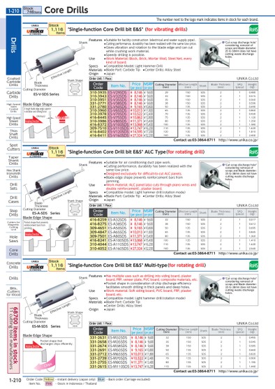 THENUMBERNEXTTOTHELOGOMARKINDICATESITEMSINSTOCKFOREACHBRAND.●"CUTSCRAPDISCHARGEHOLE"CONSIDERINGREMOVALOFSCRAPSANDBLADEDIAMETER:25TO38MMDOESNOTHAVECUTTINGWASTEDISCHARGEHOLES.●"CUTSCRAPDISCHARGEHOLE"CONSIDERINGREMOVALOFSCRAPSANDBLADEDIAMETER:25TO38MMDOESNOTHAVECUTTINGWASTEDISCHARGEHOLES.●"CUTSCRAPDISCHARGEHOLE"CONSIDERINGREMOVALOFSCRAPSANDBLADEDIAMETER:25TO38MMDOESNOTHAVECUTTINGWASTEDISCHARGEHOLES.ATOUGHBLADEEDGEANGLESUPERIORINVIBRATIONANDSTRIKINGFORCE.(MINUS)ROTATINGDIRECTIONBLADEEDGESHAPEVIBRATIONEFFECTIVELENGTHCUTTINGDIAMETERES-V-SDSSERIESSHANKBLADETHICKNESSSHANKSHAPESDSPOCKETSHAPETHATPREVENTSREINFORCEMENTBARSFROMJAMMING.ROTATINGDIRECTIONREINFORCEMENTBARBLADEEDGESHAPEEFFECTIVELENGTHCUTTINGDIAMETERES-A-SDSSERIESBLADETHICKNESSSHANKSHANKSHAPESDSPOCKETSHAPETHATDISCHARGESCHIPSEffiCIENTLY.ROTATINGDIRECTIONBLADEEDGESHAPECHIPSEFFECTIVELENGTHCUTTINGDIAMETERES-M-SDSSERIESBLADETHICKNESSSHANKSHANKSHAPESDSUNIKA"SINGLE-FUNCTIONCOREDRILLBITE&S"(FORVIBRATINGDRILLS)ORDERCODEITEMNO.PRICE(PERPIECE)MSRP(PERPIECE)CUTTINGDIAMETER(MM)EFFECTIVELENGTH(MM)SHANKBLADETHICKNESS(MM)SPQ(PIECE)WEIGHT(KG)310-3935ES-V29SDS¥8,146¥9,60029150SDS210.480310-3943ES-V32SDS¥8,146¥9,60032150SDS210.515310-3951ES-V35SDS¥8,146¥9,60035150SDS210.560331-2771ES-V38SDS¥8,146¥9,60038150SDS210.590331-2780ES-V50SDS¥9,165¥10,80050135SDS210.690310-3960ES-V65SDS¥10,013¥11,80065135SDS210.860310-3978ES-V70SDS¥10,522¥12,40070135SDS210.930416-8445ES-V75SDS¥10,862¥12,80075135SDS211.120310-3986ES-V80SDS¥11,371¥13,40080135SDS211.250416-8372ES-V100SDS¥13,068¥15,400100135SDS211.380309-7510ES-V110SDS¥13,747¥16,200110135SDS211.620416-8402ES-V120SDS¥14,595¥17,200120135SDS211.810416-8411ES-V160SDS¥27,324¥32,200160135SDS212.400CONTACTUS:03-3864-8711HTTP://WWW.UNIKA.CO.JP/UNIKA"SINGLE-FUNCTIONCOREDRILLBITE&S"ALCTYPE(FORROTATINGDRILL)ORDERCODEITEMNO.PRICE(PERPIECE)MSRP(PERPIECE)CUTTINGDIAMETER(MM)EFFECTIVELENGTH(MM)SHANKBLADETHICKNESS(MM)SPQ(PIECE)WEIGHT(KG)416-8259ES-A32SDS¥8,146¥9,60032150SDS210.517416-8275ES-A38SDS¥8,146¥9,60038150SDS210.612309-4651ES-A50SDS¥9,165¥10,80050135SDS210.695309-4847ES-A65SDS¥10,013¥11,80065135SDS210.845309-7501ES-A80SDS¥11,371¥13,40080135SDS211.260416-8241ES-A100SDS¥13,068¥15,400100135SDS211.410310-4044ES-A110SDS¥13,747¥16,200110135SDS211.620310-4052ES-A160SDS¥27,324¥32,200160135SDS212.540CONTACTUS:03-3864-8711HTTP://WWW.UNIKA.CO.JP/UNIKA"SINGLE-FUNCTIONCOREDRILLBITE&S"MULTI-TYPE(FORROTATINGDRILL)ORDERCODEITEMNO.PRICE(PERPIECE)MSRP(PERPIECE)CUTTINGDIAMETER(MM)EFFECTIVELENGTH(MM)SHANKBLADETHICKNESS(MM)SPQ(PIECE)WEIGHT(KG)331-2631ES-M32SDS¥8,146¥9,60032150SDS210.495331-2658ES-M35SDS¥8,146¥9,60035150SDS210.545331-2674ES-M38SDS¥8,146¥9,60038150SDS210.585331-2691ES-M50SDS¥9,165¥10,80050135SDS210.660331-2712ES-M65SDS¥10,013¥11,80065135SDS210.820331-2739ES-M70SDS¥10,522¥12,40070135SDS210.900331-2755ES-M80SDS¥11,371¥13,40080135SDS211.195331-2615ES-M110SDS¥13,747¥16,200110135SDS211.440CONTACTUS:03-3864-8711HTTP://WWW.UNIKA.CO.JP/STOCK1,116ITEMSSTOCK1,116ITEMSSTOCK1,116ITEMSORDERUNIT:1PIECEUNIKACO.LTDORDERUNIT:1PIECEUNIKACO.LTDORDERUNIT:1PIECEUNIKACO.LTDFEATURES●SUITABLEFORFACILITYCONSTRUCTION(ELECTRICALANDWATERSUPPLYPIPE).●CUTTINGPERFORMANCE,DURABILITYHASBEENREALIZEDWITHTHESAMELOWPRICE.●GIVESVIBRATIONANDROTATIONTOTHEBLADEEDGEANDCANCUTWHILECRUSHINGWORKMATERIAL.●SPEEDYDRILLINGISPOSSIBLE.USE●WORKMATERIAL:BLOCK,BRICK,MORTARWALL,STEELNET,EVERYKINDOFBOARD.SPECS●COMPATIBLEMODEL:LIGHTHAMMERDRILLMATERIALS●BLADEPART:CARBIDETIP●CENTERDRILLS:ALLOYSTEELORIGIN●JAPANFEATURES●SUITABLEFORAIRCONDITIONINGDUCTPIPEWORK.●CUTTINGPERFORMANCE,DURABILITYHASBEENREALIZEDWITHTHESAMELOWPRICE.●DESIGNEDEXCLUSIVELYFORDIFFICULT-TO-CUTALCPANELS.●BLADEEDGESHAPEPREVENTSREINFORCEMENTBARSFROMJAMMING.USE●WORKMATERIAL:ALCPANEL(ALSOCUTSTHROUGHPIANOWIRESANDDOUBLEREINFORCEMENT),PLASTERBOARD.SPECS●COMPATIBLEMODEL:LIGHTHAMMERDRILL(ROTATIONMODE)MATERIALS●BLADEPART:CARBIDETIP●CENTERDRILLS:ALLOYSTEELORIGIN●JAPANFEATURES●HASMULTIPLEUSESSUCHASDRILLINGINTOSIDINGBOARD,PLASTERBOARD,FRP,VENEERPLATE,PVCBOARD,COMPOSITEMATERIALS,ETC.●POCKETSHAPEINCONSIDERATIONOFCHIPDISCHARGEEFFICIENCYFACILITATESSMOOTHDRILLINGINTHICKPANELSANDDEEPHOLES.USE●WORKMATERIAL:SOFTSIDINGBOARD,PVCBOARD,FRP,PLASTERBOARD,ETC.SPECS●COMPATIBLEMODEL:LIGHTHAMMERDRILL(ROTATIONMODE)MATERIALS●BLADEPART:CARBIDETIP●CENTERDRILLS:ALLOYSTEELORIGIN●JAPANDRILLSCOATEDCARBIDEDRILLSCARBIDEDRILLSHIGHSPEEDSTEELCOATEDDRILLSHIGHSPEEDSTEELDRILLSTHINSHAFTDRILLSSPOTCUTTERSTAPERSHANKDRILLSHEXSHANKIRONSMITHDRILLSDRILLSETSDRILLCASESSTEPDRILLSCUTTERSFORMAGNETICCUTTINGUNITHOLESAWSCOREDRILLSCONCRETEDRILLSDRILLSBITS,CUTTERSFORWOODSTOCK746ITEMSCOREDRILLS1-210*0102820*1-21068700ITEMSINSTOCK11CUTTINGTOOLMANUFACTURERSORDERCODEYELLOW…INSTANTDELIVERY(JAPANONLY)BLUE…BACKORDER(CARRIAGEEXCLUDED)ITEMNO.PINK…STOCKININDONESIA/THAILAND