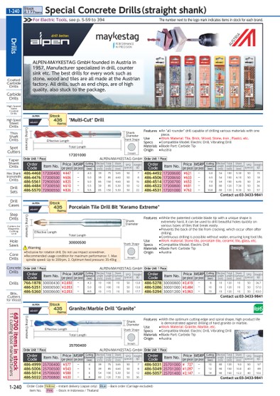 THENUMBERNEXTTOTHELOGOMARKINDICATESITEMSINSTOCKFOREACHBRAND.FORELECTRICTOOLS,SEEP.5-59TO394SHANKSHAPESTRAIGHT25700400CUTTINGDIAMETERTOTALLENGTHEFFECTIVELENGTHSHANKDIAMETEREXAMPLESHANKSHAPESTRAIGHT30000500CUTTINGDIAMETERTOTALLENGTHEFFECTIVELENGTHSHANKDIAMETEREXAMPLEALPEN-MAYKESTAGGMBHFOUNDEDINAUSTRIAIN1957,MANUFACTURERSPECIALIZEDINDRILL,COUNTERSINKETC.THEBESTDRILLSFOREVERYWORKSUCHASSTONE,WOODANDTILESAREALLMADEATTHEAUSTRIANFACTORY.ALLDRILLS,SUCHASENDCHIPS,AREOFHIGHQUALITY,ALSOSTUCKTOTHEPACKAGE.17201000CUTTINGDIAMETERTOTALLENGTHEFFECTIVELENGTHSHANKDIAMETERSHANKSHAPESTRAIGHT●EXCLUSIVEFORROTATIONDRILL.DONOTUSEIMPACTSCREWDRIVER.●RECOMMENDEDUSAGECONDITIONFORMAXIMUMPERFORMANCE:1.MAXSPINDLESPEED:UPTO200RPM,2.OPTIMUMFEEDPRESSURE:35-45KGWARNINGALPENGRANITE/MARBLEDRILL"GRANITE"ORDERCODEITEMNO.PRICE(PERPIECE)MSRP(PERPIECE)CUTTINGDIAMETER(MM)EFFECTIVELENGTH(MM)TOTALLENGTH(MM)SHANKDIAMETER(MM)SPQ(PIECE)WEIGHT(G)486-499925700400¥577-439753.65507486-500625700500¥543-539854.60508486-501425700600¥588-6541005.305012486-502225700800¥620-8801207.305036ALPENPORCELAINTILEDRILLBIT"KERAMOEXTREME"ORDERCODEITEMNO.PRICE(PERPIECE)MSRP(PERPIECE)CUTTINGDIAMETER(MM)EFFECTIVELENGTH(MM)TOTALLENGTH(MM)SHANKDIAMETER(MM)SPQ(PIECE)WEIGHT(G)766-187830000430¥2,650-4.310100105013.0486-525130000500¥2,053-5.010100105013.0486-526030000600¥2,053-6.010115105017.7STOCK435ITEMSSTOCK435ITEMSORDERUNIT:1PIECEALPEN-MAYKESTAGGMBHORDERUNIT:1PIECEALPEN-MAYKESTAGGMBHALPEN"MULTI-CUT"DRILLORDERCODEITEMNO.PRICE(PERPIECE)MSRP(PERPIECE)CUTTINGDIAMETER(MM)EFFECTIVELENGTH(MM)TOTALLENGTH(MM)SHANKDIAMETER(MM)SPQ(PIECE)WEIGHT(G)486-446817200400¥447-4.039753.65507486-447617200500¥606-5.039854.60508486-556172900500¥825-5.0851504.605015486-448417200550¥610-5.539855.305012486-557072900550¥826-5.5851505.305022STOCK435ITEMSORDERUNIT:1PIECEALPEN-MAYKESTAGGMBHFEATURES●WITHTHEOPTIMUMCUTTINGEDGEANDSPIRALSHAPE,HIGHPRODUCTLIFEISDEMONSTRATEDAGAINSTDRILLINGOFHARDGRANITEORMARBLE.USE●WORKMATERIAL:GRANITE,MARBLE,ETC.SPECS●COMPATIBLEMODEL:ELECTRICDRILL,VIBRATINGDRILLMATERIALS●BLADEPART:CARBIDETIPORIGIN●AUSTRIAFEATURES●WHILETHEPATENTEDCARBIDEBLADETIPWITHAUNIQUESHAPEISEXTREMELYHARD,ITCANBEUSEDTODRILLBEAUTIFULHOLESQUICKLYONVARIOUSTYPESOFTILESTHATBREAKEASILY.●PREVENTSTHEBACKOFTHETILEFROMCRACKING,WHICHOCCUROFTENAFTERDRILLING.●CONTINUOUSDRILLINGISPOSSIBLEWITHOUTWATER,ENSURINGLONGTOOLLIFE.USE●WORKMATERIAL:STONETILE,PORCELAINTILE,CERAMICTILE,GLASS,ETC.SPECS●COMPATIBLEMODEL:ELECTRICDRILLMATERIALS●BLADEPART:CARBIDETIPORIGIN●AUSTRIAFEATURES●AN"ALLROUNDER"DRILLCAPABLEOFDRILLINGVARIOUSMATERIALSWITHONEPIECE.USE●WORKMATERIAL:TILE,BRICK,WOOD,STONE,IRON,PLASTCI,ETC.SPECS●COMPATIBLEMODEL:ELECTRICDRILL,VIBRATINGDRILLMATERIALS●BLADEPART:CARBIDETIPORIGIN●AUSTRIAORDERCODEITEMNO.PRICE(PERPIECE)MSRP(PERPIECE)CUTTINGDIAMETER(MM)EFFECTIVELENGTH(MM)TOTALLENGTH(MM)SHANKDIAMETER(MM)SPQ(PIECE)WEIGHT(G)486-503125701000¥727-10801209.35057486-504925701200¥1,097-129015010.04089486-505725701400¥2,147-149015012.240103CONTACTUS:03-3433-9841ORDERCODEITEMNO.PRICE(PERPIECE)MSRP(PERPIECE)CUTTINGDIAMETER(MM)EFFECTIVELENGTH(MM)TOTALLENGTH(MM)SHANKDIAMETER(MM)SPQ(PIECE)WEIGHT(G)486-527830000800¥2,419-810120105036.7486-528630001000¥2,484-1010120105057.0486-529430001200¥3,963-1210120105083.0CONTACTUS:03-3433-9841ORDERUNIT:1PIECEORDERUNIT:1PIECEORDERCODEITEMNO.PRICE(PERPIECE)MSRP(PERPIECE)CUTTINGDIAMETER(MM)EFFECTIVELENGTH(MM)TOTALLENGTH(MM)SHANKDIAMETER(MM)SPQ(PIECE)WEIGHT(G)486-449217200600¥621-6.0541005.305015486-450617200650¥633-6.5541006.105018486-451417200700¥652-7.0541006.455024486-452217200800¥691-8.0801207.305036486-453117201000¥762-10.0801209.305057CONTACTUS:03-3433-9841ORDERUNIT:1PIECEDRILLSCOATEDCARBIDEDRILLSCARBIDEDRILLSHIGHSPEEDSTEELCOATEDDRILLSHIGHSPEEDSTEELDRILLSTHINSHAFTDRILLSSPOTCUTTERSTAPERSHANKDRILLSHEXSHANKIRONSMITHDRILLSDRILLSETSDRILLCASESSTEPDRILLSCUTTERSFORMAGNETICCUTTINGUNITHOLESAWSCOREDRILLSCONCRETEDRILLSDRILLSBITS,CUTTERSFORWOODSTOCK2,177ITEMSSPECIALCONCRETEDRILLS(STRAIGHTSHANK)1-240*0103100*1-24068700ITEMSINSTOCK11CUTTINGTOOLMANUFACTURERSORDERCODEYELLOW…INSTANTDELIVERY(JAPANONLY)BLUE…BACKORDER(CARRIAGEEXCLUDED)ITEMNO.PINK…STOCKININDONESIA/THAILAND