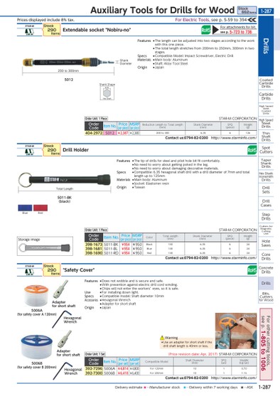 PRICESDISPLAYEDINCLUDE8%TAX.EXAMPLEHEXAGONALWRENCH5006A(FORSAFETYCOVERA120MM)ADAPTERFORSHORTSHAFTHEXAGONALWRENCH5006B(FORSAFETYCOVERB200MM)ADAPTERFORSHORTSHAFTTOTALLENGTH5011-BK(BLACK)BLUEREDSTORAGEIMAGE5012200TO300MMSHANKDIAMETERHEXSHAFT6.35SHANKSHAPEFORELECTRICTOOLS,SEEP.5-59TO394STAR-MEXTENDABLESOCKET"NOBIRU-NO"ORDERCODEITEMNO.PRICE(PERPIECE)MSRP(PERPIECE)REDUCTIONLENGTHTOTOTALLENGTH(MM)SHANKDIAMETER(MM)SPQ(PIECE)WEIGHT(G)404-29725012¥2,387¥2,380200TO3006.356126CONTACTUS:0794-82-0200HTTP://WWW.STARMINFO.COM/STAR-M"SAFETYCOVER"ORDERCODEITEMNO.PRICE(PERSET)MSRP(PERSET)COMPATIBLEMODELSHAFTDIAMETER(MM)SPQ(SET)WEIGHT(KG/SET)392-72965006A¥4,814¥4,800FOR120MM1010.70392-73005006B¥6,418¥6,400FOR200MM1011.15CONTACTUS:0794-82-0200HTTP://WWW.STARMINFO.COM/STOCK290ITEMSSTAR-MDRILLHOLDERORDERUNIT:1SET(PRICEREVISIONDATE:APR,2017)STAR-MCORPORATIONORDERCODEITEMNO.PRICE(PERPIECE)MSRP(PERPIECE)COLORTOTALLENGTH(MM)SHANKDIAMETER(MM)SPQ(PIECE)WEIGHT(G)398-16735011-BK¥954¥950BLACK1306.35624398-16815011-BL¥954¥950BLUE1306.35624398-16905011-RD¥954¥950RED1306.35624CONTACTUS:0794-82-0200HTTP://WWW.STARMINFO.COM/STOCK290ITEMSSTOCK290ITEMSORDERUNIT:1PIECESTAR-MCORPORATIONORDERUNIT:1PIECESTAR-MCORPORATIONFEATURES●THELENGTHCANBEADJUSTEDINTOTWOSTAGESACCORDINGTOTHEWORKWITHTHISONEPIECE.●THETOTALLENGTHSTRETCHESFROM200MMTO250MM,300MMINTWOSTAGES.SPECS●COMPATIBLEMODEL:IMPACTSCREWDRIVER,ELECTRICDRILLMATERIALS●MAINBODY:ALUMINUM●SHAFT:ALLOYTOOLSTEELORIGIN●JAPANFEATURES●THETIPOFDRILLSFORSTEELANDPILOTHOLEBITFITCOMFORTABLY.●NONEEDTOWORRYABOUTGETTINGPOKEDINTHELEG.●NONEEDTOWORRYABOUTDAMAGINGDECORATIVEMATERIALS.SPECS●COMPATIBLE:6.35HEXAGONALSHAFTDRILLWITHADRILLDIAMETEROF7MMANDTOTALLENGTHUPTO125MMMATERIALS●MAINBODY:ALUMINUM●SOCKET:ELASTOMERRESINORIGIN●TAIWANFORATTACHMENTSFORBIT,SEEP.5-723TO736FEATURES●DOESNOTWOBBLEANDISSECUREANDSAFE.●WITHPREVENTIONAGAINSTELECTRICDRILLCORDWINDING.●CHIPSWILLNOTENTERTHEWORKERS’EYES,SOITISSAFE.USE●FORINSTALLINGDOWNLIGHT.SPECS●COMPATIBLEMODEL:SHAFTDIAMETER10MMACCESSORIES●HEXAGONALWRENCH●ADAPTERFORSHORTSHAFTORIGIN●JAPAN●USEANADAPTERFORSHORTSHAFTIFTHEDRILLSHAFTLENGTHIS40MMORLESS.WARNINGDRILLSCOATEDCARBIDEDRILLSCARBIDEDRILLSHIGHSPEEDSTEELCOATEDDRILLSHIGHSPEEDSTEELDRILLSTHINSHAFTDRILLSSPOTCUTTERSTAPERSHANKDRILLSHEXSHANKIRONSMITHDRILLSDRILLSETSDRILLCASESSTEPDRILLSCUTTERSFORMAGNETICCUTTINGUNITHOLESAWSCOREDRILLSCONCRETEDRILLSDRILLSBITS,CUTTERSFORWOODAUXILIARYTOOLSFORDRILLSFORWOODSTOCK662ITEMS1-287*0103510*1-287FOROTHERCUTTINGTOOLS,SEEP.1-805TO1006DELIVERYESTIMATE★…MANUFACTURERSTOCK★…DELIVERYWITHIN7WORKINGDAYS★…ASK