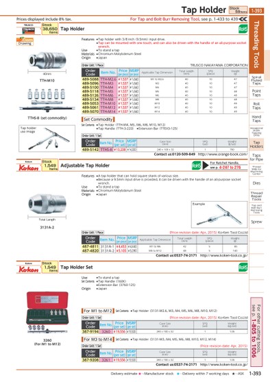 PRICESDISPLAYEDINCLUDE8%TAX.3260(FORM1TOM12)TTH-M1040MMTTHS-8(SETCOMMODITY)TAPHOLDERUSEIMAGE3131A-2TOTALLENGTHEXAMPLEFORTAPANDBOLTBURRREMOVINGTOOL,SEEP.1-433TO439TRUSCOTAPHOLDERORDERCODEITEMNO.PRICE(PERPIECE)MSRP(PERPIECE)APPLICABLETAPDIMENSIONTOTALLENGTH(MM)SPQ(PIECE)WEIGHT(G)489-5088TTH-M2.6¥1,537¥1,660M1TOM2.6401047489-5096TTH-M3¥1,537¥1,660M3401047489-5100TTH-M4¥1,537¥1,660M4401047489-5118TTH-M5¥1,537¥1,660M5401048489-5126TTH-M6¥1,537¥1,660M6401048489-5134TTH-M8¥1,537¥1,660M8401048489-5053TTH-M10¥1,537¥1,660M10401049489-5061TTH-M12¥1,537¥1,660M12401049489-5070TTH-M14¥1,537¥1,660M14401049ORDERCODEITEMNO.PRICE(PERSET)MSRP(PERSET)CASESIZE(MM)SPQ(SET)WEIGHT(G/SET)489-5142TTHS-8¥13,238¥14,300240X100X321700CONTACTUS:0120-509-849HTTP://WWW.ORANGE-BOOK.COM/KOKENADJUSTABLETAPHOLDERSTOCK1,549ITEMSORDERCODEITEMNO.PRICE(PERPIECE)MSRP(PERPIECE)APPLICABLETAPDIMENSIONTOTALLENGTH(MM)SPQ(PIECE)WEIGHT(G)487-48113131A-1¥4,453¥4,440M1TOM642585487-48203131A-2¥5,105¥5,090M5TOM12485140CONTACTUS:0537-74-2171HTTP://WWW.KOKEN-TOOL.CO.JP/STOCK38,650ITEMSORDERUNIT:1PIECE(PRICEREVISIONDATE:APR,2015)KO-KENTOOLCO.LTDORDERUNIT:1SETORDERUNIT:1PIECETRUSCONAKAYAMACORPORATIONKOKENTAPHOLDERSETSTOCK1,549ITEMSORDERCODEITEMNO.PRICE(PERSET)MSRP(PERSET)CASESIZE(MM)SPQ(SET)WEIGHT(KG/SET)387-91943260¥19,556¥19,500240X100X3211.05ORDERCODEITEMNO.PRICE(PERSET)MSRP(PERSET)CASESIZE(MM)SPQ(SET)WEIGHT(KG/SET)387-92083261¥19,556¥19,500240X100X3211.05CONTACTUS:0537-74-2171HTTP://WWW.KOKEN-TOOL.CO.JP/ORDERUNIT:1SET(PRICEREVISIONDATE:APR,2015)ORDERUNIT:1SET(PRICEREVISIONDATE:APR,2015)KO-KENTOOLCO.LTDFEATURES●TAPHOLDERWITH3/8INCH(9.5MM)INPUTDRIVE.●TAPCANBEMOUNTEDWITHONETOUCH,ANDCANALSOBEDRIVENWITHTHEHANDLEOFANALL-PURPOSESOCKETWRENCH.USE●TOSTANDATAPMATERIALS●CHROMIUMMOLYBDENUMSTEELORIGIN●JAPANSETCONTENTS●TAPHOLDER(TTH-M4,M5,M6,M8,M10,M12)●TAPHANDLE(TTH-3-220)●EXTENSIONBAR(TTEX3-125)SETCOMMODITYDRAWING.COMFEATURES●ATAPHOLDERTHATCANHOLDSQUARESHANKOFVARIOUSSIZE.●BECAUSEA9.5MMINPUTDRIVEISPROVIDED,ITCANBEDRIVENWITHTHEHANDLEOFANALL-PURPOSESOCKETWRENCH.USE●TOSTANDATAPMATERIALS●CHROMIUMMOLYBDENUMSTEELORIGIN●JAPANFORRATCHETHANDLE,SEEP.4-247TO276USE●TOSTANDATAPSETCONTENTS●TAPHANDLE(160K)●EXTENSIONBAR(3760-125)ORIGIN●JAPANSETCONTENTS●TAPHOLDER(3131-M2.6,M3,M4,M5,M6,M8,M10,M12)FORM1TOM12SETCONTENTS●TAPHOLDER(3131-M3,M4,M5,M6,M8,M10,M12,M14)FORM3TOM14THREADINGTOOLSSPIRALFLUTEDTAPSPOINTTAPSROLLTAPSHANDTAPSHEXAGONALSHANKTAPPINGDRILLSTAPHOLDERSTAPSFORPIPETHREADMILLSFORMACHININGCENTERDIESTHREADREPAIRTOOLSTAPANDBOLTBURRREMOVINGTOOLSSPREWTAPHOLDERSTOCK58ITEMS1-393*0104500*1-393FOROTHERCUTTINGTOOLS,SEEP.1-805TO1006DELIVERYESTIMATE★…MANUFACTURERSTOCK★…DELIVERYWITHIN7WORKINGDAYS★…ASK