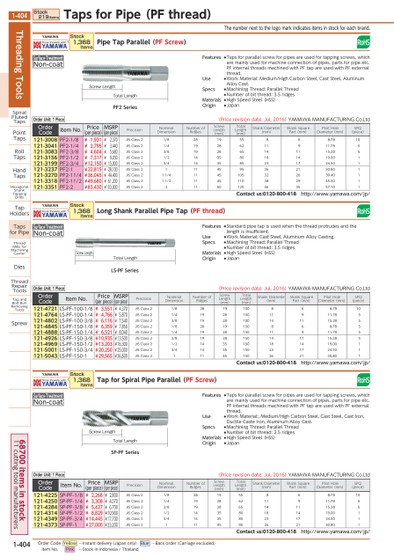 THENUMBERNEXTTOTHELOGOMARKINDICATESITEMSINSTOCKFOREACHBRAND.SURFACETREATMENTNON-COATPF2SERIESTOTALLENGTHSCREWLENGTHSURFACETREATMENTNON-COATSP-PFSERIESTOTALLENGTHSCREWLENGTHSURFACETREATMENTNON-COATLS-PFSERIESTOTALLENGTHSCREWLENGTHYAMAWAPIPETAPPARALLEL(PFSCREW)STOCK1,368ITEMSORDERUNIT:1PIECE(PRICEREVISIONDATE:JUL,2016)YAMAWAMANUFACTURINGCO.LTDORDERCODEITEMNO.PRICE(PERPIECE)MSRP(PERPIECE)PRECISIONNOMINALDIMENSIONNUMBEROFRIDGESSCREWLENGTH(MM)TOTALLENGTH(MM)SHANKDIAMETER(MM)SHANKSQUAREPART(MM)PILOTHOLEDIAMETER(MM)SPQ(PIECE)121-3008PF2-1/8¥1,931¥2,370JISCLASS21/8281955868.7810121-3041PF2-1/4¥2,795¥3,440JISCLASS21/419286211911.785121-3083PF2-3/8¥4,604¥5,680JISCLASS23/8192865141115.285121-3156PF2-1/2¥7,317¥9,030JISCLASS21/2143580181419.001121-3199PF2-3/4¥12,150¥15,000JISCLASS23/4143585231724.501121-3237PF2-1¥22,815¥28,100JISCLASS21114595262130.801121-3270PF2-11/4¥36,045¥44,400JISCLASS211/41145105322639.401121-3318PF2-11/2¥49,680¥61,200JISCLASS211/21145110382945.301121-3351PF2-2¥83,430¥103,000JISCLASS221150120463557.101CONTACTUS:0120-800-418HTTP://WWW.YAMAWA.COM/JP/YAMAWALONGSHANKPARALLELPIPETAP(PFTHREAD)STOCK1,368ITEMSORDERUNIT:1PIECE(PRICEREVISIONDATE:JUL,2016)YAMAWAMANUFACTURINGCO.LTDORDERCODEITEMNO.PRICE(PERPIECE)MSRP(PERPIECE)PRECISIONNOMINALDIMENSIONNUMBEROFRIDGESSCREWLENGTH(MM)TOTALLENGTH(MM)SHANKDIAMETER(MM)SHANKSQUAREPART(MM)PILOTHOLEDIAMETER(MM)SPQ(PIECE)121-4721LS-PF-100-1/8¥3,551¥4,370JISCLASS21/82819100868.7810121-4764LS-PF-100-1/4¥4,766¥5,870JISCLASS21/4192810011911.785121-4802LS-PF-100-3/8¥6,116¥7,540JISCLASS23/81928100141115.285121-4845LS-PF-150-1/8¥6,359¥7,850JISCLASS21/82819150868.785121-4888LS-PF-150-1/4¥6,521¥8,040JISCLASS21/4192815011911.785121-4926LS-PF-150-3/8¥10,935¥13,500JISCLASS23/81928150141115.285121-4969LS-PF-150-1/2¥13,203¥16,300JISCLASS21/21435150181419.001121-5001LS-PF-150-3/4¥20,250¥25,000JISCLASS23/41435150231724.501121-5043LS-PF-150-1¥29,565¥36,500JISCLASS211145150262130.801CONTACTUS:0120-800-418HTTP://WWW.YAMAWA.COM/JP/YAMAWATAPFORSPIRALPIPEPARALLEL(PFSCREW)STOCK1,368ITEMSORDERUNIT:1PIECE(PRICEREVISIONDATE:JUL,2016)YAMAWAMANUFACTURINGCO.LTDORDERCODEITEMNO.PRICE(PERPIECE)MSRP(PERPIECE)PRECISIONNOMINALDIMENSIONNUMBEROFRIDGESSCREWLENGTH(MM)TOTALLENGTH(MM)SHANKDIAMETER(MM)SHANKSQUAREPART(MM)PILOTHOLEDIAMETER(MM)SPQ(PIECE)121-4225SP-PF-1/8¥2,268¥2,800JISCLASS21/8281955868.7810121-4250SP-PF-1/4¥3,308¥4,070JISCLASS21/419286211911.785121-4284SP-PF-3/8¥5,427¥6,700JISCLASS23/8192865141115.285121-4314SP-PF-1/2¥8,829¥10,900JISCLASS21/2143580181419.001121-4349SP-PF-3/4¥14,445¥17,700JISCLASS23/4143585231724.501121-4373SP-PF-1¥27,000¥33,200JISCLASS21114595262130.801CONTACTUS:0120-800-418HTTP://WWW.YAMAWA.COM/JP/FEATURES●TAPSFORPARALLELSCREWFORPIPESAREUSEDFORTAPPINGSCREWS,WHICHAREMAINLYUSEDFORMACHINECONNECTIONOFPIPES,PARTSFORPIPEETC.PFINTERNALTHREADSMACHINEDWITHPFTAPAREUSEDWITHPFEXTERNALTHREAD.USE●WORKMATERIAL:MEDIUM/HIGHCARBONSTEEL,CASTSTEEL,ALUMINUMALLOYCAST.SPECS●MACHININGTHREAD:PARALLELTHREAD●NUMBEROFBITTHREAD:3.5RIDGESMATERIALS●HIGHSPEEDSTEEL(HSS)ORIGIN●JAPANFEATURES●STANDARDPIPETAPISUSEDWHENTHETHREADPROTRUDESANDTHELENGTHISINSUFFICIENT.USE●WORKMATERIAL:CASTSTEEL,ALUMINUMALLOYCASTING.SPECS●MACHININGTHREAD:PARALLELTHREAD●NUMBEROFBITTHREAD:3.5RIDGESMATERIALS●HIGHSPEEDSTEEL(HSS)ORIGIN●JAPANFEATURES●TAPSFORPARALLELSCREWFORPIPESAREUSEDFORTAPPINGSCREWS,WHICHAREMAINLYUSEDFORMACHINECONNECTIONOFPIPES,PARTSFORPIPEETC.PFINTERNALTHREADSMACHINEDWITHPFTAPAREUSEDWITHPFEXTERNALTHREAD.USE●WORKMATERIAL:,MEDIUM/HIGHCARBONSTEEL,CASTSTEEL,CASTIRON,DUCTILECASTEIRON,ALUMINUMALLOYCAST.SPECS●MACHININGTHREAD:PARALLELTHREAD●NUMBEROFBITTHREAD:2.5RIDGESMATERIALS●HIGHSPEEDSTEEL(HSS)ORIGIN●JAPANTHREADINGTOOLSSPIRALFLUTEDTAPSPOINTTAPSROLLTAPSHANDTAPSHEXAGONALSHANKTAPPINGDRILLSTAPHOLDERSTAPSFORPIPETHREADMILLSFORMACHININGCENTERDIESTHREADREPAIRTOOLSTAPANDBOLTBURRREMOVINGTOOLSSPREWSTOCK219ITEMSTAPSFORPIPE(PFTHREAD)1-404*0104570*1-40468700ITEMSINSTOCK11CUTTINGTOOLMANUFACTURERSORDERCODEYELLOW…INSTANTDELIVERY(JAPANONLY)BLUE…BACKORDER(CARRIAGEEXCLUDED)ITEMNO.PINK…STOCKININDONESIA/THAILAND