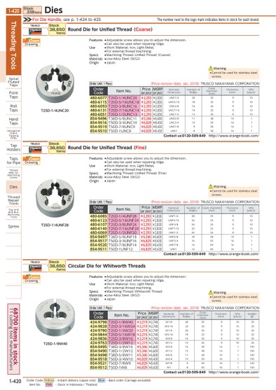 THENUMBERNEXTTOTHELOGOMARKINDICATESITEMSINSTOCKFOREACHBRAND.FORDIEHANDLE,SEEP.1-424TO425T25D-1/8W40T25D-1/4UNC20T25D-1/4UNF28●CANNOTBEUSEDFORSTAINLESSSTEELSCREWS.WARNING●CANNOTBEUSEDFORSTAINLESSSTEELSCREWS.WARNING●CANNOTBEUSEDFORSTAINLESSSTEELSCREWS.WARNINGTRUSCOROUNDDIEFORUNIFIEDTHREAD(COARSE)STOCK38,650ITEMSORDERUNIT:1PIECE(PRICEREVISIONDATE:JAN,2018)TRUSCONAKAYAMACORPORATIONORDERCODEITEMNO.PRICE(PERPIECE)MSRP(PERPIECE)NOMINALDIMENSIONNUMBEROFRIDGESOUTERDIAMETER(MM)THICKNESS(MM)SPQ(PIECE)480-6077T25D-1/4UNC20¥2,293¥2,830UNC1/42025910480-6115T25D-5/16UNC18¥2,293¥2,830UNC5/161825910480-6093T25D-3/8UNC16¥2,293¥2,830UNC3/81625910480-6131T25D-7/16UNC14¥2,293¥2,830UNC7/161425910480-6051T25D-1/2UNC13¥2,293¥2,830UNC1/21325910854-9496T38D-5/8UNC11¥5,346¥6,600UNC5/81138141854-9516T50D-3/4UNC10¥6,829¥8,430UNC3/41050161854-9519T50D-7/8UNC9¥6,829¥8,430UNC7/8950161854-9510T50D-1UNC8¥6,829¥8,430UNC1850161CONTACTUS:0120-509-849HTTP://WWW.ORANGE-BOOK.COM/TRUSCOROUNDDIEFORUNIFIEDTHREAD(FINE)STOCK38,650ITEMSORDERUNIT:1PIECE(PRICEREVISIONDATE:JAN,2018)TRUSCONAKAYAMACORPORATIONORDERCODEITEMNO.PRICE(PERPIECE)MSRP(PERPIECE)NOMINALDIMENSIONNUMBEROFRIDGESOUTERDIAMETER(MM)THICKNESS(MM)SPQ(PIECE)480-6085T25D-1/4UNF28¥2,293¥2,830UNF1/42825910480-6123T25D-5/16UNF24¥2,293¥2,830UNF5/162425910480-6107T25D-3/8UNF24¥2,293¥2,830UNF3/82425910480-6140T25D-7/16UNF20¥2,293¥2,830UNF7/162025910480-6069T25D-1/2UNF20¥2,293¥2,830UNF1/22025910854-9497T38D-5/8UNF18¥5,346¥6,600UNF5/81838141854-9517T50D-3/4UNF16¥6,829¥8,430UNF3/41650161854-9520T50D-7/8UNF14¥6,829¥8,430UNF7/81450161854-9511T50D-1UNF12¥6,829¥8,430UNF11250161CONTACTUS:0120-509-849HTTP://WWW.ORANGE-BOOK.COM/TRUSCOCIRCULARDIEFORWHITWORTHTHREADSSTOCK38,650ITEMSORDERUNIT:1PIECE(PRICEREVISIONDATE:JAN,2018)TRUSCONAKAYAMACORPORATIONORDERCODEITEMNO.PRICE(PERPIECE)MSRP(PERPIECE)NOMINALDIMENSIONNUMBEROFRIDGESOUTERDIAMETER(MM)THICKNESS(MM)SPQ(PIECE)WEIGHT(G)424-9798T25D-1/8W40¥2,219¥2,740W1/8402591025424-9828T25D-3/16W24¥2,219¥2,740W3/16242591025424-9780T25D-1/4W20¥2,219¥2,740W1/4202591025424-9844T25D-5/16W18¥2,219¥2,740W5/16182591025424-9836T25D-3/8W16¥2,219¥2,740W3/8162591025424-9763T25D-1/2W12¥2,219¥2,740W1/2122591025854-9495T38D-3/8W16¥5,346¥6,600W3/81638141100854-9490T38D-1/2W12¥5,346¥6,600W1/21238141100854-9498T38D-5/8W11¥5,346¥6,600W5/81138141100854-9518T50D-3/4W10¥6,829¥8,430W3/41050161150854-9521T50D-7/8W9¥6,829¥8,430W7/8950161150854-9512T50D-1W8¥6,829¥8,430W1850161150CONTACTUS:0120-509-849HTTP://WWW.ORANGE-BOOK.COM/DRAWING.COMFEATURES●ADJUSTABLESCREWALLOWSYOUTOADJUSTTHEDIMENSION.●CANALSOBEUSEDWHENREPAIRINGRIDGE.USE●WORKMATERIAL:IRON,LIGHTMETAL.●FOREXTERNALTHREADMACHINING.SPECS●MACHININGTHREAD:UNIFIEDTHREAD(COARSE)MATERIALS●LOW-ALLOYSTEEL(SKS2)ORIGIN●JAPANDRAWING.COMFEATURES●ADJUSTABLESCREWALLOWSYOUTOADJUSTTHEDIMENSION.●CANALSOBEUSEDWHENREPAIRINGRIDGE.USE●WORKMATERIAL:IRON,LIGHTMETAL.●FOREXTERNALTHREADMACHINING.SPECS●MACHININGTHREAD:UNIFIEDTHREAD(FINE)MATERIALS●LOW-ALLOYSTEEL(SKS2)ORIGIN●JAPANDRAWING.COMFEATURES●ADJUSTABLESCREWALLOWSYOUTOADJUSTTHEDIMENSION.●CANALSOBEUSEDWHENREPAIRINGRIDGE.USE●WORKMATERIAL:IRON,LIGHTMETAL.●FOREXTERNALTHREADMACHINING.SPECS●MACHININGTHREAD:WHITWORTHTHREADMATERIALS●LOW-ALLOYSTEEL(SKS2)ORIGIN●JAPANTHREADINGTOOLSSPIRALFLUTEDTAPSPOINTTAPSROLLTAPSHANDTAPSHEXAGONALSHANKTAPPINGDRILLSTAPHOLDERSTAPSFORPIPETHREADMILLSFORMACHININGCENTERDIESTHREADREPAIRTOOLSTAPANDBOLTBURRREMOVINGTOOLSSPREWSTOCK338ITEMSDIES1-420*0104750*1-42068700ITEMSINSTOCK11CUTTINGTOOLMANUFACTURERSORDERCODEYELLOW…INSTANTDELIVERY(JAPANONLY)BLUE…BACKORDER(CARRIAGEEXCLUDED)ITEMNO.PINK…STOCKININDONESIA/THAILAND
