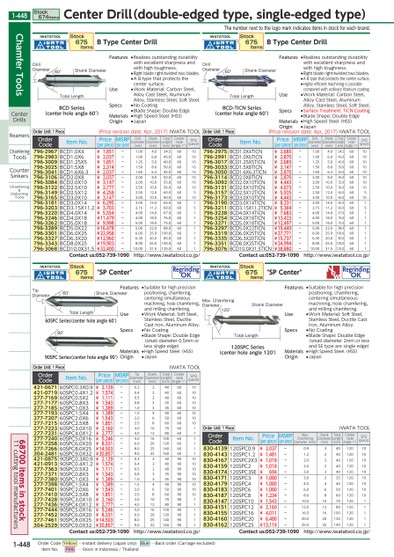 THENUMBERNEXTTOTHELOGOMARKINDICATESITEMSINSTOCKFOREACHBRAND.90SPCSERIES(CENTERHOLEANGLE90°)90°SHANKDIAMETER60SPCSERIES(CENTERHOLEANGLE60°)TOTALLENGTH60°TIPDIAMETERBCDSERIES(CENTERHOLEANGLE60°)SHANKDIAMETER60°TOTALLENGTHDRILLDIAMETERSHANKDIAMETERBCD-TICNSERIES(CENTERHOLEANGLE60°)TOTALLENGTHDRILLDIAMETER60°SHANKDIAMETER120SPCSERIES(CENTERHOLEANGLE120°)TOTALLENGTHMAX.CHAMFERINGDIAMETER120°IWATATOOLBTYPECENTERDRILLORDERCODEITEMNO.PRICE(PERPIECE)MSRP(PERPIECE)DRILLDIAMETER(MM)SHANKDIAMETER(MM)TOTALLENGTH(MM)CENTERHOLEANGLE(°)SPQ(PIECE)796-2967BCD1.0X4¥1,851-1.004.034.56010796-2983BCD1.0X6¥2,037-1.006.045.06010796-3009BCD1.25X5¥1,851-1.255.040.06010796-3025BCD1.5X8¥2,314-1.508.050.06010796-3041BCD1.6X6.3¥2,037-1.606.345.06010796-3106BCD2.0X8¥2,037-2.008.050.06010796-3084BCD2.0X10¥3,147-2.0010.055.06010796-3122BCD2.5X10¥2,777-2.5010.056.06010796-3149BCD2.5X12¥4,258-2.5012.060.0605796-3165BCD3.0X10¥3,147-3.0010.060.06010796-3181BCD3.0X14¥6,295-3.0014.065.0601796-3203BCD3.15X11.2¥3,703-3.1511.260.0605796-3220BCD4.0X14¥5,554-4.0014.067.0601796-3246BCD4.0X18¥11,479-4.0018.076.0601796-3262BCD5.0X18¥9,998-5.0018.075.0601796-3289BCD5.0X22¥16,478-5.0022.088.0601796-3301BCD6.0X25¥22,958-6.0025.0100.0601796-3327BCD6.3X20¥12,960-6.3020.080.0601796-3343BCD8.0X25¥19,903-8.0025.0100.0601796-3068BCD10.0X31.5¥32,400-10.0031.5125.0601CONTACTUS:052-739-1090HTTP://WWW.IWATATOOL.CO.JP/IWATATOOL"SPCENTER"REGRINDINGOKORDERCODEITEMNO.PRICE(PERPIECE)MSRP(PERPIECE)TIPDIAMETER(MM)SHANKDIAMETER(MM)TOTALLENGTH(MM)CENTERHOLEANGLE(°)SPQ(PIECE)421-067160SPC0.3X0.9¥2,129-0.33406010421-071960SPC0.4X1.2¥1,574-0.43406010277-716960SPC0.5X2¥1,111-0.52406010277-717760SPC0.8X3¥1,543-0.83356010277-718560SPC1.0X3¥1,389-1.03356010277-719360SPC1.5X4¥1,389-1.54406010277-720760SPC2.0X6¥1,543-2.06506010277-721560SPC2.5X8¥1,851-2.58606010277-722360SPC3.0X10¥2,160-3.01070601277-723160SPC4.0X12¥2,777-4.01280601277-724060SPC5.0X16¥5,246-5.016100601277-725860SPC6.0X20¥8,331-6.020120601277-726660SPC8.0X25¥14,503-8.025140601304-248160SPC9.0X32¥30,857-9.032160601421-087590SPC0.3X0.9¥2,129-0.33409010421-091390SPC0.4X1.2¥1,574-0.43409010277-736390SPC0.5X2¥1,111-0.52409010277-737190SPC0.8X3¥1,543-0.83359010277-738090SPC1.0X3¥1,389-1.03359010277-739890SPC1.5X4¥1,389-1.54409010277-740190SPC2.0X6¥1,543-2.06509010277-741090SPC2.5X8¥1,851-2.58609010277-742890SPC3.0X10¥2,160-3.01070901277-743690SPC4.0X12¥2,777-4.01280901277-744490SPC5.0X16¥5,246-5.016100901277-745290SPC6.0X20¥8,331-6.020120901277-746190SPC8.0X25¥14,503-8.025140901304-252990SPC9.0X32¥30,857-9.032160901CONTACTUS:052-739-1090HTTP://WWW.IWATATOOL.CO.JP/STOCK675ITEMSSTOCK675ITEMSORDERUNIT:1PIECEIWATATOOLORDERUNIT:1PIECE(PRICEREVISIONDATE:APR,2017)IWATATOOLFEATURES●REALIZESOUTSTANDINGDURABILITYWITHEXCELLENTSHARPNESSANDWITHHIGHTOUGHNESS.●RIGHTBLADERIGHT-TWISTEDTWOBLADES.●ABTYPETHATPROTECTSTHECENTERSURFACE.USE●WORKMATERIAL:CARBONSTEEL,ALLOYCASTSTEEL,ALUMINUMALLOY,STAINLESSSTEEL,SOFTSTEEL.SPECS●NOCOATING●BLADESHAPE:DOUBLEEDGEMATERIALS●HIGHSPEEDSTEEL(HSS)ORIGIN●JAPANFEATURES●SUITABLEFORHIGHPRECISIONPOSITIONING,CHAMFERING,CENTERINGSIMULTANEOUSMACHINING,HOLECHAMFERING,ANDMILLINGCHAMFERING.USE●WORKMATERIAL:SOFTSTEEL,STAINLESSSTEEL,DUCTILECASTIRON,ALUMINUMALLOY.SPECS●NOCOATING●BLADESHAPE:DOUBLEEDGE(SMALLDIAMETER0.5MMORLESSSINGLEEDGE)MATERIALS●HIGHSPEEDSTEEL(HSS)ORIGIN●JAPANIWATATOOLBTYPECENTERDRILLORDERCODEITEMNO.PRICE(PERPIECE)MSRP(PERPIECE)DRILLDIAMETER(MM)SHANKDIAMETER(MM)TOTALLENGTH(MM)CENTERHOLEANGLE(°)SPQ(PIECE)796-2975BCD1.0X4TICN¥2,685-1.004.034.56010796-2991BCD1.0X6TICN¥2,870-1.006.045.06010796-3017BCD1.25X5TICN¥2,685-1.255.040.06010796-3033BCD1.5X8TICN¥3,147-1.508.050.06010796-3050BCD1.6X6.3TICN¥2,870-1.606.345.06010796-3114BCD2.0X8TICN¥2,870-2.008.050.06010796-3092BCD2.0X10TICN¥4,443-2.0010.055.06010796-3131BCD2.5X10TICN¥4,073-2.5010.056.06010796-3157BCD2.5X12TICN¥5,925-2.5012.060.0605796-3173BCD3.0X10TICN¥4,443-3.0010.060.06010796-3190BCD3.0X14TICN¥8,331-3.0014.065.0601796-3211BCD3.15X11.2TICN¥5,369-3.1511.260.0605796-3238BCD4.0X14TICN¥7,683-4.0014.067.0601796-3254BCD4.0X18TICN¥13,423-4.0018.076.0601796-3271BCD5.0X18TICN¥12,497-5.0018.075.0601796-3297BCD5.0X22TICN¥19,440-5.0022.088.0601796-3319BCD6.0X25TICN¥27,771-6.0025.0100.0601796-3335BCD6.3X20TICN¥15,737-6.3020.080.0601796-3351BCD8.0X25TICN¥24,994-8.0025.0100.0601796-3076BCD10.0X31.5TICN¥38,880-10.0031.5125.0601CONTACTUS:052-739-1090HTTP://WWW.IWATATOOL.CO.JP/STOCK675ITEMSORDERUNIT:1PIECE(PRICEREVISIONDATE:APR,2017)IWATATOOLIWATATOOL"SPCENTER"REGRINDINGOKSTOCK675ITEMSORDERUNIT:1PIECEIWATATOOLORDERCODEITEMNO.PRICE(PERPIECE)MSRP(PERPIECE)MAX.CHAMFERINGDIAMETER(MM)SHANKDIAMETER(MM)TOTALLENGTH(MM)CENTERHOLEANGLE(°)SPQ(PIECE)830-4139120SPC0.9¥2,037-0.934012010830-4143120SPC1.2¥1,481-1.234012010830-4167120SPC2X3¥1,018-2.034012010830-4159120SPC2¥1,018-2.024012010830-4174120SPC3SE¥694-3.034012010830-4171120SPC3¥1,080-3.033512010830-4179120SPC4¥1,080-4.044012010830-4183120SPC6¥1,080-6.065012010830-4187120SPC8¥1,234-8.086012010830-4147120SPC10¥1,543-10.010701201830-4151120SPC12¥2,160-12.012801201830-4155120SPC16¥4,011-16.0161001201830-4160120SPC20¥6,480-20.0201201201830-4162120SPC25¥13,114-25.0251401201CONTACTUS:052-739-1090HTTP://WWW.IWATATOOL.CO.JP/FEATURES●REALIZESOUTSTANDINGDURABILITYWITHEXCELLENTSHARPNESSANDWITHHIGHTOUGHNESS.●RIGHTBLADERIGHT-TWISTEDTWOBLADES.●ABTYPETHATPROTECTSTHECENTERSURFACE.●HIGHLYEFFICIENTMACHININGISPOSSIBLECOMPAREDWITHORDINARYTITANIUMCOATING.USE●WORKMATERIAL:CARBONSTEEL,ALLOYCASTSTEEL,ALUMINUMALLOY,STAINLESSSTEEL,SOFTSTEEL.SPECS●SURFACETREATMENT:TICNCOATING●BLADESHAPE:DOUBLEEDGEMATERIALS●HIGHSPEEDSTEEL(HSS)ORIGIN●JAPANFEATURES●SUITABLEFORHIGHPRECISIONPOSITIONING,CHAMFERING,CENTERINGSIMULTANEOUSMACHINING,HOLECHAMFERING,ANDMILLINGCHAMFERING.USE●WORKMATERIAL:SOFTSTEEL,STAINLESSSTEEL,DUCTILECASTIRON,ALUMINUMALLOY.SPECS●NOCOATING●BLADESHAPE:DOUBLEEDGE(SMALLDIAMETER2MMORLESSANDSE