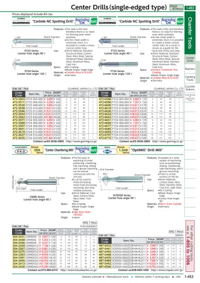 PRICESDISPLAYEDINCLUDE8%TAX.90°TOTALLENGTH0723SERIES(CENTERHOLEANGLE90°)SHANKDIAMETER0724SERIES(CENTERHOLEANGLE120°)120°90°TOTALLENGTHF723SERIES(CENTERHOLEANGLE90°)SHANKDIAMETERF724SERIES(CENTERHOLEANGLE120°)120°CM90SERIES(CENTERHOLEANGLE90°)TOTALLENGTH90°SHANKDIAMETERDRILLDIAMETERDRILLLENGTHSHANKDIAMETERDRILLDIAMETERTOTALLENGTHSCM350SERIES(CENTERHOLEANGLE90°)90°GUHRING"CARBIDENCSPOTTINGDRILL"REGRINDINGOKORDERCODEITEMNO.PRICE(PERPIECE)MSRP(PERPIECE)SHANKDIAMETER(MM)TOTALLENGTH(MM)CENTERHOLEANGLE(°)SPQ(PIECE)472-35030723005.000¥6,000¥6,350562901472-35110723006.000¥6,256¥6,620666901472-35200723008.000¥9,856¥10,430879901472-35380723010.000¥14,412¥15,2501089901472-35460723012.000¥19,212¥20,33012102901472-35540723016.000¥33,614¥35,57016115901472-35620723020.000¥61,860¥65,46020131901472-35710724005.000¥6,000¥6,3505621201472-35890724006.000¥6,256¥6,6206661201472-35970724008.000¥9,856¥10,4308791201472-36010724010.000¥14,412¥15,25010891201472-36190724012.000¥19,212¥20,330121021201472-36270724016.000¥33,614¥35,570161151201472-36350724020.000¥61,860¥65,460201311201CONTACTUS:03-3536-2800HTTP://WWW.GUHRING.CO.JP/ORDERUNIT:1PIECEGUHRINGJAPANCO.LTDFUKUDASEIKO"CENTERCHAMFERINGMILL"REGRINDINGOKORDERCODEITEMNO.PRICE(PERPIECE)MSRP(PERPIECE)SHANKDIAMETER(MM)TOTALLENGTH(MM)CENTERHOLEANGLE(°)DRILLDIAMETER(MM)DRILLLENGTH(MM)304-2421CM90X4¥4,827¥5,50087590411304-2448CM90X6¥5,352¥6,100108590613304-2456CM90X8¥6,231¥7,1001210090819304-2359CM90X10¥7,196¥8,20016120901022304-2367CM90X12¥10,881¥12,40016125901226304-2375CM90X16¥16,322¥18,60020145901632304-2383CM90X20¥18,954¥21,60025165902038304-2391CM90X25¥22,902¥26,10032170902545304-2405CM90X30¥39,576¥45,10032175903045304-2413CM90X35¥51,159¥58,30032180903550304-2430CM90X40¥75,290¥85,80042200904060CONTACTUS:072-984-6741HTTP://WWW.FUKUDASEIKO.CO.JP/STOCK358ITEMSORDERUNIT:1PIECEFUKUDASEIKOSPQ:1PIECEFEATURES●THEWEBISTHINANDTHEREFORETHEREISNONEEDFORTHINNINGEVENWHENPOLISHED.●ASTHECHISELWIDTHISEXTREMELYSHORT,ITISPOSSIBLETOCREATEASHARPCONICALCENTERHOLE.USE●WORKMATERIAL:STANDARDSTRUCTURALSTEEL,CARBONSTEEL,ALLOYSTEEL,SPECIALHARDENEDSTEEL,STAINLESSSTEEL,ALUMINUMALLOY,CASTIRON.SPECS●NOCOATING●BLADESHAPE:SINGLEEDGEMATERIALS●CARBIDEALLOY(K10/K20)ORIGIN●GERMANYFEATURES●THEFIVETYPESOFMACHININGOFCENTERPOSITIONING,CHAMFERING,SIDEMACHINING,DRILLING,ANDVGROOVEMACHININGCANBEWORKEDCONTINUOUSLYWITHTHISONETOOL.●ITCANBEUSEDFORMETALPROCESSING,METALMOLDPROCESSING,MACHINING,ANDOTHERMULTIPLEPURPOSES.USE●WORKMATERIAL:CASTSTEEL,CARBONSTEEL,ALLOYSTEEL,TOOLSTEEL.SPECS●NOCOATING●BLADESHAPE:SINGLEEDGEMATERIALS●HIGHALLOYSTEEL(SKH56)ORIGIN●JAPANGUHRING"CARBIDENCSPOTTINGDRILL"REGRINDINGOKORDERCODEITEMNO.PRICE(PERPIECE)MSRP(PERPIECE)SHANKDIAMETER(MM)TOTALLENGTH(MM)CENTERHOLEANGLE(°)SPQ(PIECE)472-6588F723005.000¥6,965¥7,370562901472-6596F723006.000¥7,201¥7,620666901472-6600F723008.000¥16,811¥17,790879901472-6618F723010.000¥19,212¥20,3301089901472-6626F723012.000¥24,013¥25,41012102901472-6634F723016.000¥38,424¥40,66016115901472-6642F723020.000¥69,637¥73,69020131901472-6651F724005.000¥6,965¥7,3705621201472-6669F724006.000¥7,201¥7,6206661201472-6677F724008.000¥16,811¥17,7908791201472-6685F724010.000¥19,212¥20,33010891201472-6693F724012.000¥24,013¥25,410121021201472-6707F724016.000¥38,424¥40,660161151201472-6715F724020.000¥69,637¥73,690201311201CONTACTUS:03-3536-2800HTTP://WWW.GUHRING.CO.JP/ORDERUNIT:1PIECEGUHRINGJAPANCO.LTDMAPAL"OPTIMILL®DRILLMILL"STOCK1,349ITEMSORDERUNIT:1PIECEMAPALORDERCODEITEMNO.PRICE(PERPIECE)MSRP(PERPIECE)SHANKDIAMETER(MM)TOTALLENGTH(MM)DRILLDIAMETER(MM)487-0433SCM350-0300Z02R-HA-HU211¥3,948¥3,9006573487-0441SCM350-0400Z02R-HA-HU211¥3,948¥3,9006574487-0450SCM350-0500Z02R-HA-HU211¥3,948¥3,9006575487-0468SCM350-0600Z02R-HA-HU211¥3,948¥3,9006576487-0476SCM350-0800Z02R-HA-HU211¥5,367¥5,3008638487-0484SCM350-1000Z02R-HA-HU211¥7,695¥7,600107210487-0492SCM350-1200Z02R-HA-HU211¥10,023¥9,900128312487-0506SCM350-1600Z02R-HA-HU211¥14,783¥14,600169216CONTACTUS:048-949-1400HTTP://WWW.MAPAL.COM/JP/SPQ:1PIECEFEATURES●THEWEBISTHINANDTHEREFORETHEREISNONEEDFORTHINNINGEVENWHENPOLISHED.●ASTHECHISELWIDTHISEXTREMELYSHORT,ITISPOSSIBLETOCREATEASHARPCONICALCENTERHOLE.ASARESULT,ITSERVESASAGUIDEFORTHETWISTDRILLOFTHENEXTSTEP.USE●WORKMATERIAL:STANDARDSTRUCTURALSTEEL,CARBONSTEEL,ALLOYSTEEL,SPECIALHARDENEDSTEEL,STAINLESSSTEEL,ALUMINUMALLOY,CASTIRON.SPECS●SURFACETREATMENT:FIRECOATING●BLADESHAPE:SINGLEEDGEMATERIALS●CARBIDEALLOY(K10/K20)ORIGIN●GERMANYFEATURES●CAPABLEOFAWIDEVARIETYOFMACHININGSUCHASPOSITIONING,DRILLING,CHAMFERING,SIDEMACHINING,ANDVGROOVEMACHINING.●THEREISNOFLATPORTIONONTHETIP.USE●WORKMATERIAL:CARBONSTEEL,ALLOYSTEEL,STAINLESSSTEEL,CASTIRON,LIGHTALLOY.SPECS●NOCOATING●BLADESHAPE:SINGLEEDGE●CENTERHOLEANGLE:90°MATERIALS●MICROGRAINCARBIDEORIGIN●GERMANYCHAMFERTOOLSCENTERDRILLSREAMERSCHAMFERINGTOOLSCOUNTERSINKERSCHAMFERING&DEBURRINGTOOLSCENTERDRILLS(SINGLE-EDGEDTYPE)STOCK674ITEMS1-453*0105042*1-453FOROTHERCUTTINGTOOLS,SEEP.1-805TO1006DELIVERYESTIMATE★…MANUFACTURERSTOCK★…DELIVERYWITHIN7WORKINGDAYS★…ASK