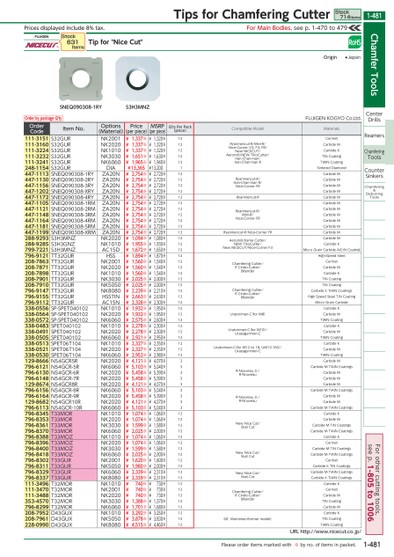 PRICESDISPLAYEDINCLUDE8%TAX.SNEQ090308-1RYS3H3MNZFORMAINBODIES,SEEP.1-470TO479FUJIGENTIPFOR"NICECUT"STOCK631ITEMSORDERBYPACKAGEQ'TYFUJIGENKOGYOCO.LTD.ORDERCODEITEMNO.OPTIONS(MATERIAL)PRICE(PERPIECE)MSRP(PERPIECE)Q'TYPERPACK(PIECE)COMPATIBLEMODELMATERIALS111-3151S32GURNK2001¥1,337※¥1,320※12RYANMENCUT-R/MINI-R/NICE-CORNERV3,F3,FR/NEWNICECUT/AEROMILL/NEWTIKOCUTTER/HAN-CHAN-MAN/HAN-CHAN-MANRCERMET111-3160S32GURNK2020¥1,337※¥1,320※12CARBIDEM111-3224S32GURNK1010¥1,337※¥1,320※12CARBIDEK111-3232S32GURNK3030¥1,651※¥1,630※12TINCOATING111-3241S32GURNK6060¥1,965※¥1,940※12TIAINCOATING248-1154S32GURDIA¥13,365¥13,2001SINTEREDDIAMOND447-1113SNEQ090308-1RYZA20N¥2,754※¥2,720※12RYANMENCUT-R/HAN-CHAN-MANR/NICE-CORNERFRCARBIDEM447-1130SNEQ090308-2RYZA20N¥2,754※¥2,720※12CARBIDEM447-1156SNEQ090308-3RYZA20N¥2,754※¥2,720※12CARBIDEM447-1202SNEQ090308-XRYZA20N¥2,754※¥2,720※12CARBIDEM447-1172SNEQ090308-4RYZA20N¥2,754※¥2,720※12RYANMENCUT-RCARBIDEM447-1105SNEQ090308-1RMZA20N¥2,754※¥2,720※12RYANMENCUT-R/MINI-R/NICE-CORNERFRCARBIDEM447-1121SNEQ090308-2RMZA20N¥2,754※¥2,720※12CARBIDEM447-1148SNEQ090308-3RMZA20N¥2,754※¥2,720※12CARBIDEM447-1164SNEQ090308-4RMZA20N¥2,754※¥2,720※12CARBIDEM447-1181SNEQ090308-5RMZA20N¥2,754※¥2,720※12CARBIDEM447-1199SNEQ090308-XRMZA20N¥2,754※¥2,720※12RYANMENCUT-R/NICE-CORNERFRCARBIDEM288-9293S3H3MNZNK2020¥1,094※¥1,080※12AEROMILL/KAMECUTTER/NEWTIKOCUTTER/NEWNICECUT/NICE-CORNERF3CARBIDEM288-9285S3H3GNZNK1010¥1,955※¥1,930※12CARBIDEK799-7221S3H3MNZAC15D¥1,672※¥1,650※12MICROGRAINCARBIDEALCRNCOATING796-9121TT32GURHSS¥1,894※¥1,870※12CHAMFERINGCUTTER/RCINDO-CUTTER/BITENDERHIGH-SPEEDSTEEL208-7863TT32GURNK2001¥1,560※¥1,540※12CERMET208-7871TT32GURNK2020¥1,560※¥1,540※12CARBIDEM208-7898TT32GURNK1010¥1,560※¥1,540※12CARBIDEK208-7901TT32GURNK3030¥2,025※¥2,000※12TINCOATING208-7910TT32GURNK5050¥2,025※¥2,000※12CHAMFERINGCUTTER/RCINDO-CUTTER/BITENDERTINCOATING796-9147TT32GURNK8080¥2,239※¥2,210※12CARBIDEKTIALNCOATINGS796-9155TT32GURHSSTIN¥2,663※¥2,630※12HIGHSPEEDSTEELTINCOATING796-9112TT32GURAC15N¥2,328※¥2,300※12MICROGRAINCARBIDE338-0556SP-SPET040102NK1010¥1,932※¥1,950※12URATORIMEN-C(FORM8)CARBIDEK338-0564SP-SPET040102NK2020¥1,932※¥1,950※12CARBIDEM338-0572SP-SPET040102NK6060¥2,575※¥2,600※12TIAINCOATING338-0483SPET040102NK1010¥2,278※¥2,300※12URATORIMEN-C(FORM10)/URAZAGURIMEN-CCARBIDEK338-0491SPET040102NK2020¥2,278※¥2,300※12CARBIDEM338-0505SPET040102NK6060¥2,921※¥2,950※12TIAINCOATING338-0513SPET06T104NK1010¥2,327※¥2,350※12URATORIMEN-C(FORM12TO18,UM12-16S)/URAZAGURIMEN-CCARBIDEK338-0521SPET06T104NK2020¥2,327※¥2,350※12CARBIDEM338-0530SPET06T104NK6060¥2,952※¥2,980※12TIAINCOATING129-8666N54GCR5RNK2020¥4,121※¥4,070※3R-NOUVEAUJR./R-NOUVEAUCARBIDEM796-6121N54GCR-5RNK6060¥5,103※¥5,040※3CARBIDEMTIALNCOATINGS796-6130N54GCR-6RNK2020¥5,458※¥5,390※3CARBIDEM796-6148N54GCR-7RNK2020¥5,458※¥5,390※3CARBIDEM129-8674N54GCR8RNK2020¥4,121※¥4,070※3CARBIDEM796-6156N54GCR-8RNK6060¥5,103※¥5,040※3R-NOUVEAUJR./R-NOUVEAUCARBIDEMTIALNCOATINGS796-6164N54GCR-9RNK2020¥5,458※¥5,390※3CARBIDEM129-8682N54GCR10RNK2020¥4,121※¥4,070※3CARBIDEM796-6113N54GCR-10RNK6060¥5,103※¥5,040※3CARBIDEMTIALNCOATINGS796-8345T33MORNK1010¥1,074※¥1,060※12NEWNICECUT/SKATCUTCARBIDEK796-8353T33MORNK2020¥1,074※¥1,060※12CARBIDEM796-8361T33MORNK3030¥1,599※¥1,580※12CARBIDEMTINCOATINGS796-8370T33MORNK6060¥2,025※¥2,000※12CARBIDEMTIALNCOATINGS796-8388T33MOZNK1010¥1,074※¥1,060※12CARBIDEK796-8396T33MOZNK2020¥1,074※¥1,060※12NEWNICECUT/SKATCUTCERMET796-8400T33MOZNK3030¥1,599※¥1,580※12CARBIDEMTINCOATINGS796-8418T33MOZNK6060¥2,025※¥2,000※12CARBIDEMTIALNCOATINGS796-8302T33GURNK2001¥1,620※¥1,600※12CERMET796-8311T33GURNK5050¥1,980※¥2,000※12CARBIDEKTINCOATINGS796-8329T33GURNK6060¥2,339※¥2,310※12NEWNICECUT/SKATCUTCARBIDEMTIALNCOATINGS796-8337T33GURNK8080¥2,339※¥2,310※12CARBIDEKTIALNCOATINGS111-3496T32MORNK1010¥740※¥730※12CHAMFERINGCUTTER/RCINDO-CUTTER/BITENDERCARBIDEK111-3470T32MORNK2001¥740※¥730※12CERMET111-3488T32MORNK2020¥740※¥730※12CARBIDEM353-4570T32MORNK3030¥1,388※¥1,370※12TINCOATING796-8299T32MORNK6060¥1,701※¥1,680※12CARBIDEM208-7952D43GUXNK1010¥3,292※¥3,250※1260°MOMIMEN(FORMERMODEL)CARBIDEK208-7961D43GUXNK5050¥3,878※¥3,830※12TINCOATING228-0990D43GUXNK8080¥4,515※¥4,460※12TIAINCOATINGURLHTTP://WWW.NICECUT.CO.JP/ORIGIN●JAPANCHAMFERTOOLSCENTERDRILLSREAMERSCHAMFERINGTOOLSCOUNTERSINKERSCHAMFERING&DEBURRINGTOOLSTIPSFORCHAMFERINGCUTTERSTOCK714ITEMS1-481*0105270*1-481FOROTHERCUTTINGTOOLS,SEEP.1-805TO1006PLEASEORDERITEMSMARKEDWITH※BYNO.OFITEMSINPACKET.