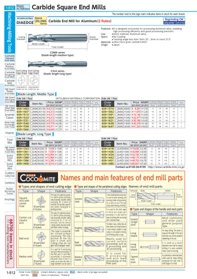 THENUMBERNEXTTOTHELOGOMARKINDICATESITEMSINSTOCKFOREACHBRAND.TOTALLENGTHC2MASERIES(BLADELENGTHMEDIUMTYPE)CUTTINGDIAMETERSHANKDIAMETERBLADELENGTHC2LASERIES(BLADELENGTHLONGTYPE)CUTTINGDIAMETER≧3CENTERCUT:YESCUTTINGDIAMETER<3CENTERCUT:YESNAMESANDMAINFEATURESOFENDMILLPARTS●TYPESANDSHAPESOFENDCUTTINGEDGETYPESHAPEFEATURESSQUAREENDWITHCENTERHOLE(EXAMPLE)4FLUTESTHISTYPEISFORGENERALPURPOSE.ITISUSEDFORGROOVEPROCESSING,SIDEPROCESSING,SHOULDERCUTTINGPROCESSING,ETC.ITCANNOTCUTVERTICALLYBUTGRINDINGSUPPORTSBOTHCENTERS,HAVINGGOODRE-GRINDINGPRECISION.CENTERCUTSQUAREEND(EXAMPLE)4FLUTESTHISTYPEISFORGENERALPURPOSE.ITISUSEDFORGROOVEPROCESSING,SIDEPROCESSING,SHOULDERCUTTINGPROCESSING,ETC.ITCANCUTVERTICALLY,ANDTHEVERTICALCUTTINGPROPERTYBECOMESBETTERWITHFEWERNUMBEROFBLADES.BALLEND(EXAMPLE)4FLUTESTHISTYPEISESSENTIALFORCURVEDSURFACEPROCESSING.THECHIPPOCKETATTHETIPPARTISSMALLANDCUTTINGCHIPSDONOTGETDISCHARGEDWELL.RADIUSEND(EXAMPLE)2FLUTESITISUSEDFORRPROCESSINGANDPICKFEEDPROCESSINGOFTHEFILLETPART.INPICKFEEDPROCESSING,ITPROCESSESEFFICIENTLYEVENIFTHERISSMALL,ASANENDMILLWITHALARGEDIAMETERCANBEUSED.●TYPESANDSHAPESOFTHEPERIPHERALCUTTINGEDGESTYPESHAPEFEATURESSTANDARD(STRAIGHTSHANK)MOSTCOMMONLYANDWIDEUSEDGENERALPURPOSETYPE.LONGSHANKFORDEEPDRILLING.THESHANKISLONGANDTHELENGTHOFTHEPARTTHATSTICKSOUTCANBEADJUSTEDDEPENDINGONTHEUSE.LONGNECKSHANKITISUSEDASASMALLDIAMETERENDMILLFORDEEPDRILLING.ITISALSOSUITABLEWHENUSEDFORBORING.TAPEREDNECKSHANKITSPOTENTIALISDEMONSTRATEDWHENUSEDFORDEEPDRILLINGALONGSIDETHEWALLWITHADRAFTANGLEOFAMOLD.●TYPESANDSHAPESOFTHEHANDLEANDNECKPARTSTYPESHAPEFEATURESSTANDARDBLADEAMOSTVERSATILEGENERALPURPOSETYPE.ITISUSEDFORGROOVEPROCESSING,SIDEPROCESSING,SHOULDERCUTTINGPROCESSING,ETC.ASWELLASFORANYOFTHEROUGHCUTTING,MEDIUMFINISHING,ANDFINISHING.TAPEREDBLADEITISUSEDFORTHEDRAFTANGLEOFMOLDSANDSPIGOTPARTPROCESSING.ITISALSOUSEDFORTAPERPROCESSINGAFTERPROCESSINGWITHASTANDARDBLADE.ROUGHINGBLADETHEBLADEISWAVY,CUTTINGCHIPSAREFINELYDIVIDED,ANDCUTTINGRESISTANCEISSMALL,MAKINGITSUITABLEFORROUGHCUTTING.ITISNOTSUITABLEFORFINISHING,ASTHEFINISHINGSURFACEISROUGH.BALLBLADEMAINLYUSEDFORCURVEDSURFACEPROCESSING,SUCHASRPROCESSINGAND3DPROCESSING.RADIUSBLADEITISUSEDFORRPROCESSINGANDPICKFEEDPROCESSINGOFTHEFILLETPART.CUTTINGDIAMETERBODYSHANKSHANKDIAMETERBLADELENGTHTWISTINGANGLETOTALLENGTHNAMESOFENDMILLPARTSENDCUTTINGEDGESHAPEENDCUTTINGEDGESHAPEMITSUBISHIMATERIALSCARBIDEENDMILLFORALUMINUM(2FLUTES)REGRINDINGOKORDERCODEITEMNO.PRICE(PERPIECE)MSRP(PERPIECE)CUTTINGDIAMETER(MM)BLADELENGTH(MM)TOTALLENGTH(MM)SHANKDIAMETER(MM)SPQ(PIECE)659-1353C2LAD0200¥7,529¥8,5802.094041659-1361C2LAD0250¥7,529¥8,5802.5124041659-1370C2LAD0300¥10,004¥11,4003.0206061659-1388C2LAD0400¥10,968¥12,5004.0256061659-1396C2LAD0500¥12,285¥14,0005.0307061659-1400C2LAD0600¥13,514¥15,4006.0307061ORDERCODEITEMNO.PRICE(PERPIECE)MSRP(PERPIECE)CUTTINGDIAMETER(MM)BLADELENGTH(MM)TOTALLENGTH(MM)SHANKDIAMETER(MM)SPQ(PIECE)659-1493C2MAD0100¥4,212¥4,8001.02.54041659-1507C2MAD0150¥4,212¥4,8001.54.04041659-1515C2MAD0200¥4,212¥4,8002.06.04041659-1523C2MAD0250¥4,212¥4,8002.58.04041659-1531C2MAD0300¥5,212¥5,9403.08.04561659-1540C2MAD0400¥5,774¥6,5804.011.04561659-1558C2MAD0500¥6,371¥7,2605.013.05061659-1566C2MAD0600¥6,643¥7,5706.013.05061STOCK20,395ITEMSORDERUNIT:1PIECEMITSUBISHIMATERIALSCORPORATIONORDERUNIT:1PIECEFEATURES●ITISDESIGNEDEXCLUSIVELYFORPROCESSINGALUMINUMALLOY,ENABLINGHIGHPROCESSINGEFFICIENCYANDGOODPROCESSINGPRECISION.USE●WORKMATERIAL:ALUMINUMALLOY.SPECS●NOCOATING●TWISTINGANGLELESSTHAN3MM30°,3MMORMORE37.5°MATERIALS●ULTRAMICROGRAINCARBIDE(UWC)ORIGIN●JAPANBLADELENGTH:MIDDLETYPEBLADELENGTH:LONGTYPECUTTINGDIAMETER=2MMORMOREORDERCODEITEMNO.PRICE(PERPIECE)MSRP(PERPIECE)CUTTINGDIAMETER(MM)BLADELENGTH(MM)TOTALLENGTH(MM)SHANKDIAMETER(MM)SPQ(PIECE)659-1418C2LAD0800¥19,656¥22,4008409081659-1426C2LAD1000¥25,008¥28,5001050100101659-1434C2LAD1200¥32,730¥37,3001250110121659-1442C2LAD1400¥48,174¥54,9001470130161659-1451C2LAD1500¥49,755¥56,7001570130161659-1485C2LAD2000¥85,557¥97,5002070140201CONTACTUS:0120-34-4159HTTP://WWW.CARBIDE.MMC.CO.JP/ORDERCODEITEMNO.PRICE(PERPIECE)MSRP(PERPIECE)CUTTINGDIAMETER(MM)BLADELENGTH(MM)TOTALLENGTH(MM)SHANKDIAMETER(MM)SPQ(PIECE)659-1574C2MAD0800¥9,391¥10,7008196081659-1582C2MAD1000¥11,670¥13,300102270101659-1591C2MAD1200¥16,146¥18,400122675121659-1604C2MAD1400¥22,377¥25,500142675121659-1621C2MAD1600¥30,186¥34,400163290161659-1639C2MAD1800¥45,279¥51,600183290161659-1647C2MAD2000¥51,333¥58,5002038100201ORDERUNIT:1PIECEORDERUNIT:1PIECEMACHINING・MILLINGTOOLSCARBIDESQUAREENDMILLSCARBIDERADIUSENDMILLSCARBIDEROUGHINGENDMILLSCARBIDEBALLENDMILLSHIGHSPEEDSTEELENDMILLSHIGHSPEEDSTEELROUGHINGENDMILLSHIGHSPEEDSTEELBALLENDMILLSENDMILLCASESBLADEEDGEEXCHANGEUNITTOOLSINSERTSTOOLBITSHIGHSPEEDTIPPEDTOOLBITSSOLIDTOOLBITSSOLIDTOOLBITSCUTTERS(CUTTINGTOOLS)COUNTERBORESROLLERBURNISHINGTOOLSKNURLINGSSTOCK4,722ITEMSCARBIDESQUAREENDMILLS1-512*0100062*1-51268700ITEMSINSTOCK11CUTTINGTOOLMANUFACTURERSORDERCODEYELLOW…INSTANTDELIVERY(JAPANONLY)BLUE…BACKORDER(CARRIAGEEXCLUDED)ITEMNO.PINK…STOCKININDONESIA/THAILAND