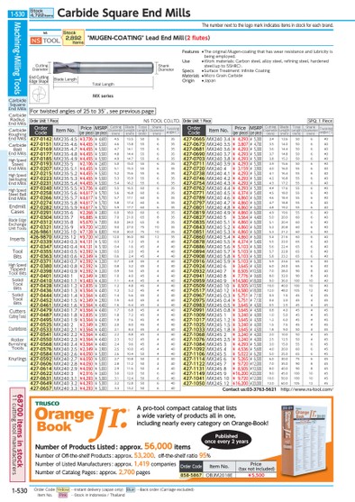 THENUMBERNEXTTOTHELOGOMARKINDICATESITEMSINSTOCKFOREACHBRAND.TOTALLENGTHMXSERIESCUTTINGDIAMETERSHANKDIAMETERBLADELENGTHFORTWISTEDANGLESOF25TO35°,SEEPREVIOUSPAGEAPRO-TOOLCOMPACTCATALOGTHATLISTSAWIDEVARIETYOFPRODUCTSALLINONE,INCLUDINGNEARLYEVERYCATEGORYONORANGE-BOOK!NUMBEROFPRODUCTSLISTED:APPROX.56,000ITEMSNUMBEROFOff-THE-SHELFPRODUCTS:APPROX.53,200,Off-THE-SHELFRATIO95%NUMBEROFLISTEDMANUFACTURERS:APPROX.1,419COMPANIESNUMBEROFCATALOGPAGES:APPROX.2,700PAGESORDERCODEITEMNO.PRICE(TAXNOTINCLUDED)858-5867OBJM2018E¥5,500PUBLISHEDONCEEVERY2YEARSENDCUTTINGEDGESHAPENS"MUGEN-COATING"LEADENDMILL(2FLUTES)STOCK2,892ITEMSORDERUNIT:1PIECENSTOOLCO.LTD.ORDERCODEITEMNO.PRICE(PERPIECE)MSRP(PERPIECE)CUTTINGDIAMETER(MM)BLADELENGTH(MM)TOTALLENGTH(MM)SHANKDIAMETER(MM)TWISTINGANGLE(°)427-0142MX2354.5¥3,726¥4,6004.513.550635427-0151MX2354.6¥4,455¥5,5004.613.855635427-0169MX2354.7¥4,455¥5,5004.714.155635427-0177MX2354.8¥4,455¥5,5004.814.455635427-0185MX2354.9¥4,455¥5,5004.914.755635427-0193MX2355¥2,106¥2,6005.015.055635427-0207MX2355.1¥4,455¥5,5005.115.355635427-0215MX2355.2¥4,455¥5,5005.215.655635427-0223MX2355.3¥4,455¥5,5005.315.955635427-0231MX2355.4¥4,455¥5,5005.416.255635427-0240MX2355.5¥3,726¥4,6005.516.560635427-0258MX2355.6¥4,617¥5,7005.616.860635427-0266MX2355.7¥4,617¥5,7005.717.160635427-0274MX2355.8¥4,617¥5,7005.817.460635427-0282MX2355.9¥4,617¥5,7005.917.760635427-0291MX2356¥2,268¥2,8006.018.060635427-0304MX2357¥6,885¥8,5007.021.065835427-0312MX2358¥5,670¥7,0008.024.065835427-0321MX2359¥9,720¥12,0009.027.0751035426-9861MX23510¥7,128¥8,80010.030.0751035426-9870MX23512¥9,720¥12,00012.036.0801235427-0339MX2400.3¥4,131¥5,1000.31.245440427-0347MX2400.4¥4,131¥5,1000.41.645440427-0355MX2400.5¥2,592¥3,2000.52.045440427-0363MX2400.6¥2,349¥2,9000.62.445440427-0371MX2400.7¥2,592¥3,2000.72.845440427-0380MX2400.8¥2,592¥3,2000.83.245440427-0398MX2400.9¥2,592¥3,2000.93.645440427-0401MX2401¥2,349¥2,9001.04.045440427-0410MX2401.1¥3,483¥4,3001.14.445440427-0428MX2401.2¥2,835¥3,5001.24.845440427-0436MX2401.3¥3,564¥4,4001.35.245440427-0444MX2401.4¥3,564¥4,4001.45.645440427-0452MX2401.5¥2,349¥2,9001.56.045440427-0461MX2401.6¥3,564¥4,4001.66.445440427-0479MX2401.7¥3,564¥4,4001.76.845440427-0487MX2401.8¥2,835¥3,5001.87.245440427-0495MX2401.9¥3,564¥4,4001.97.645440427-0525MX2402¥2,349¥2,9002.08.045440427-0533MX2402.1¥3,564¥4,4002.18.445440427-0541MX2402.2¥3,564¥4,4002.28.845440427-0550MX2402.3¥3,564¥4,4002.39.245440427-0568MX2402.4¥3,564¥4,4002.49.645440427-0576MX2402.5¥2,349¥2,9002.510.045440427-0584MX2402.6¥4,050¥5,0002.610.450440427-0592MX2402.7¥4,050¥5,0002.710.850440427-0606MX2402.8¥4,050¥5,0002.811.250440427-0614MX2402.9¥4,050¥5,0002.911.650440427-0622MX2403¥2,916¥3,6003.012.050640427-0631MX2403.1¥4,293¥5,3003.112.450640427-0649MX2403.2¥4,293¥5,3003.212.850640427-0657MX2403.3¥4,293¥5,3003.313.250640FEATURES●THEORIGINALMUGEN-COATINGTHATHASWEARRESISTANCEANDLUBRICITYISBEINGEMPLOYED.USE●WORKMATERIALS:CARBONSTEEL,ALLOYSTEEL,REFININGSTEEL,HARDENEDSTEEL(UPTO55HRC).SPECS●SURFACETREATMENT:INFINITECOATINGMATERIALS●MICROGRAINCARBIDEORIGIN●JAPANORDERUNIT:1PIECEORDERCODEITEMNO.PRICE(PERPIECE)MSRP(PERPIECE)CUTTINGDIAMETER(MM)BLADELENGTH(MM)TOTALLENGTH(MM)SHANKDIAMETER(MM)TWISTINGANGLE(°)427-0665MX2403.4¥4,293¥5,3003.413.650640427-0673MX2403.5¥3,807¥4,7003.514.050640427-0681MX2403.6¥4,293¥5,3003.614.450640427-0690MX2403.7¥4,293¥5,3003.714.850640427-0703MX2403.8¥4,293¥5,3003.815.250640427-0711MX2403.9¥4,293¥5,3003.915.650640427-0720MX2404¥3,159¥3,9004.016.055640427-0738MX2404.1¥4,293¥5,3004.116.455640427-0746MX2404.2¥4,293¥5,3004.216.855640427-0754MX2404.3¥4,293¥5,3004.317.255640427-0762MX2404.4¥4,293¥5,3004.417.655640427-0771MX2404.5¥4,374¥5,4004.518.055640427-0789MX2404.6¥4,860¥6,0004.618.455640427-0797MX2404.7¥4,860¥6,0004.718.855640427-0801MX2404.8¥4,860¥6,0004.819.255640427-0819MX2404.9¥4,860¥6,0004.919.655640427-0827MX2405¥3,564¥4,4005.020.060640427-0835MX2405.1¥4,860¥6,0005.120.460640427-0843MX2405.2¥4,860¥6,0005.220.860640427-0851MX2405.3¥4,860¥6,0005.321.260640427-0860MX2405.4¥4,860¥6,0005.421.660640427-0878MX2405.5¥4,374¥5,4005.522.065640427-0886MX2405.6¥5,103¥6,3005.622.465640427-0894MX2405.7¥5,103¥6,3005.722.865640427-0908MX2405.8¥5,103¥6,3005.823.265640427-0916MX2405.9¥5,103¥6,3005.923.665640427-0924MX2406¥3,645¥4,5006.024.065640427-0932MX2407¥8,505¥10,5007.028.090840427-0941MX2408¥7,776¥9,6008.032.090840427-0959MX2409¥14,580¥18,0009.036.01001040427-0509MX24010¥8,505¥10,50010.040.01001040427-0517MX24012¥14,580¥18,00012.048.01051240427-0967MX2450.3¥5,751¥7,1000.31.545445427-0975MX2450.4¥5,751¥7,1000.42.045445427-0983MX2450.5¥3,645¥4,5000.52.545445427-0991MX2450.8¥3,645¥4,5000.84.045445427-1009MX2451¥3,240¥4,0001.05.045445427-1017MX2451.2¥3,645¥4,5001.26.045445427-1025MX2451.5¥3,240¥4,0001.57.545445427-1033MX2451.8¥3,645¥4,5001.89.050445427-1068MX2452¥3,240¥4,0002.010.050445427-1076MX2452.5¥3,240¥4,0002.512.550445427-1084MX2453¥4,293¥5,3003.015.055645427-1092MX2454¥4,536¥5,6004.020.060645427-1106MX2455¥5,022¥6,2005.025.065645427-1114MX2456¥5,265¥6,5006.030.075645427-1122MX2457¥9,720¥12,0007.035.090845427-1131MX2458¥8,505¥10,5008.040.090845427-1149MX2459¥16,200¥20,0009.045.01001045427-1041MX24510¥9,720¥12,00010.050.01001045427-1050MX24512¥16,200¥20,00012.060.01051245CONTACTUS:03-3763-5621HTTP://WWW.NS-TOOL.COM/SPQ:1PIECEMACHINING・MILLINGTOOLSCARBIDESQUAREENDMILLSCARBIDERADIUSENDMILLSCARBIDEROUGHINGENDMILLSCARBIDEBALLENDMILLSHIGHSPEEDSTEELENDMILLSHIGHSPEEDSTEELROUGHINGENDMILLSHIGHSPEEDSTEELBALLENDMILLSENDMILLCASESBLADEEDGEEXCHANGEUNITTOOLSINSERTSTOOLBITSHIGHSPEEDTIPPEDTOOLBITSSOLIDTOOLBITSSOLIDTOOLBITSCUTTERS(CUTTINGTOOLS)COUNTERBORESROLLERBURNISHINGTOOLSKNURLINGSSTOCK4,722ITEMSCARBIDESQUAREENDMILLS1-530*C004007*1-53068700ITEMSINSTOCK11CUTTINGTOOLMANUFACTURERSORDERCODEYELLOW…INSTANTDELIVERY(JAPANONLY)BLUE…B