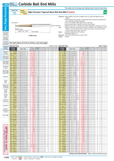 THENUMBERNEXTTOTHELOGOMARKINDICATESITEMSINSTOCKFOREACHBRAND.TOTALLENGTHLENGTHEXCL.HEADBLADELENGTHSHANKDIAMETERBALLRADIUSHTNBSERIESFORBALLRADIUSOF0.75TO2.0MM,SEENEXTPAGEUNIONTOOLHIGHPRECISIONTAPEREDNECKBALLENDMILL(2FLUTES)STOCK4,071ITEMSORDERUNIT:1PIECEUNIONTOOLORDERCODEITEMNO.PRICE(PERPIECE)MSRP(PERPIECE)BALLRADIUS(MM)BLADELENGTH(MM)LENGTHEXCL.HEAD(MM)TOTALLENGTH(MM)SHANKDIAMETER(MM)341-5929HTNB20020151¥10,109¥11,5200.100.161.5504304-9388HTNB20020152¥10,109¥11,5200.100.161.5504430-5213HTNB20020153¥10,109¥11,5200.100.161.5504341-5937HTNB20020201¥10,636¥12,1200.100.162.0504304-9400HTNB20020202¥10,636¥12,1200.100.162.0504304-9418HTNB20020203¥10,636¥12,1200.100.162.0504341-5945HTNB20020301¥12,636¥14,4000.100.163.0504304-9426HTNB20020302¥12,636¥14,4000.100.163.0504304-9434HTNB20020303¥12,636¥14,4000.100.163.0504341-5953HTNB20030201¥10,109¥11,5200.150.242.0504304-9442HTNB20030202¥10,109¥11,5200.150.242.0504304-9451HTNB20030203¥10,109¥11,5200.150.242.0504341-5961HTNB20030301¥10,636¥12,1200.150.243.0504304-9469HTNB20030302¥10,636¥12,1200.150.243.0504304-9477HTNB20030303¥10,636¥12,1200.150.243.0504341-5970HTNB20040301¥7,792¥8,8800.200.323.0504304-9485HTNB20040302¥7,792¥8,8800.200.323.0504304-9493HTNB20040303¥7,792¥8,8800.200.323.0504341-5988HTNB20040401¥7,792¥8,8800.200.324.0504304-9507HTNB20040402¥7,792¥8,8800.200.324.0504304-9515HTNB20040403¥7,792¥8,8800.200.324.0504341-5996HTNB20040601¥8,424¥9,6000.200.326.0504304-9523HTNB20040602¥8,424¥9,6000.200.326.0504304-9531HTNB20040603¥8,424¥9,6000.200.326.0504341-6003HTNB20050401¥7,371¥8,4000.250.404.0504341-6011HTNB20050402¥7,371¥8,4000.250.404.0504341-6020HTNB20050403¥7,582¥8,6400.250.404.0504341-6038HTNB20050601¥7,792¥8,8800.250.406.0504341-6046HTNB20050602¥7,792¥8,8800.250.406.0504341-6054HTNB20050603¥7,792¥8,8800.250.406.0504341-6062HTNB20050801¥7,792¥8,8800.250.408.0504341-6071HTNB20050802¥7,792¥8,8800.250.408.0504341-6089HTNB20050803¥7,792¥8,8800.250.408.0504341-6097HTNB20051001¥8,424¥9,6000.250.4010.0504341-6101HTNB20051002¥8,424¥9,6000.250.4010.0504341-6119HTNB20051003¥8,424¥9,6000.250.4010.0504341-6127HTNB20060401¥7,266¥8,2800.300.484.0504304-9540HTNB20060402¥7,266¥8,2800.300.484.0504304-9558HTNB20060403¥7,266¥8,2800.300.484.0504341-6135HTNB20060601¥7,477¥8,5200.300.486.0504304-9566HTNB20060602¥7,477¥8,5200.300.486.0504304-9574HTNB20060603¥7,477¥8,5200.300.486.0504341-6143HTNB20060801¥7,477¥8,5200.300.488.0504304-9582HTNB20060802¥7,477¥8,5200.300.488.0504304-9591HTNB20060803¥7,477¥8,5200.300.488.0504341-6151HTNB20061001¥7,582¥8,6400.300.4810.0504304-9604HTNB20061002¥7,582¥8,6400.300.4810.0504304-9612HTNB20061003¥7,582¥8,6400.300.4810.0504341-6160HTNB20061201¥8,213¥9,3600.300.4812.0504304-9621HTNB20061202¥8,213¥9,3600.300.4812.0504304-9639HTNB20061203¥8,213¥9,3600.300.4812.0504820-2840HTNB2006-140-2¥8,213¥9,3600.300.4814.0504341-6178HTNB20061601¥8,213¥9,3600.300.4816.0504304-9647HTNB20061602¥8,213¥9,3600.300.4816.0504304-9655HTNB20061603¥8,213¥9,3600.300.4816.0504820-2876HTNB2006-200-1¥10,968¥12,5000.300.4820.0504820-2877HTNB2006-200-2¥10,968¥12,5000.300.4820.0504820-2841HTNB2008-060-1¥7,792¥8,8800.400.646.0504820-2843HTNB2008-060-2¥7,792¥8,8800.400.646.0504820-2845HTNB2008-060-3¥7,792¥8,8800.400.646.0504FEATURES●HIGHRIGIDITYHASBEENENABLEDWITHANIMPROVEDTAPEREDNECKSHAPE.●HMCOATINGTHATENABLESOUTSTANDINGHEATRESISTANCETEMPERATUREANDLUBRICITYISBEINGEMPLOYED.●ITCANCUT65HRCHIGHSPEEDSTEELMATERIALS.●UNPRECEDENTEDLYLONGLIFEHASBECOMEPOSSIBLE.●HIGHRPRECISIONIS±0.005ANDOUTERDIAMETERCROSSINGIS0/-0.015.USE●WORKMATERIALS:HARDENEDSTEEL(UPTO55HRC)(UPTO60HRC)(UPTO65HRC),PRE-HARDENEDSTEEL,COPPER(WETTYPEISRECOMMENDED),CARBONSTEEL,ALLOYSTEEL,CASTIRON.SPECS●SURFACETREATMENT:HMCOATING●TWISTINGANGLE:30°MATERIALS●ULTRA-FINEPARTICLEALLOY(SUPERMG)ORIGIN●JAPANORDERUNIT:1PIECEORDERCODEITEMNO.PRICE(PERPIECE)MSRP(PERPIECE)BALLRADIUS(MM)BLADELENGTH(MM)LENGTHEXCL.HEAD(MM)TOTALLENGTH(MM)SHANKDIAMETER(MM)341-6186HTNB20080801¥7,792¥8,8800.400.648504341-6194HTNB20080802¥7,792¥8,8800.400.648504341-6208HTNB20080803¥7,792¥8,8800.400.648504341-6216HTNB20081201¥8,213¥9,3600.400.6412604341-6224HTNB20081202¥8,213¥9,3600.400.6412604341-6232HTNB20081203¥8,213¥9,3600.400.6412604820-2842HTNB2008-160-1¥10,092¥11,5000.400.6416604820-2844HTNB2008-160-2¥10,092¥11,5000.400.6416604820-2846HTNB2008-160-3¥10,092¥11,5000.400.6416604820-2847HTNB2010-060-1¥6,634¥7,5600.500.806504820-2849HTNB2010-060-2¥6,634¥7,5600.500.806504820-2853HTNB2010-060-3¥6,634¥7,5600.500.806504341-6241HTNB20100801¥6,634¥7,5600.500.808504304-9663HTNB20100802¥6,634¥7,5600.500.808504304-9671HTNB20100803¥6,634¥7,5600.500.808504820-2848HTNB2010-100-1¥6,634¥7,5600.500.8010504820-2850HTNB2010-100-2¥6,634¥7,5600.500.8010504820-2854HTNB2010-100-3¥6,634¥7,5600.500.8010504341-6259HTNB20101201¥6,634¥7,5600.500.8012504304-9680HTNB20101202¥6,634¥7,5600.500.8012504304-9698HTNB20101203¥6,634¥7,5600.500.8012504820-2851HTNB2010-140-2¥6,634¥7,5600.500.8014504341-6267HTNB20101601¥6,634¥7,5600.500.8016504304-9701HTNB20101602¥6,634¥7,5600.500.8016504304-9710HTNB20101603¥6,634¥7,5600.500.8016504820-2852HTNB2010-180-2¥6,634¥7,5600.500.8018504341-6275HTNB2010-200-1¥8,424¥9,6000.500.8020604341-6283HTNB2010-200-2¥8,424¥9,6000.500.8020604341-6291HTNB2010-200-3¥8,424¥9,6000.500.8020604341-6305HTNB20102201¥8,424¥9,6000.500.8022604304-9728HTNB20102202¥8,424¥9,6000.500.8022604304-9736HTNB20102203¥8,424¥9,6000.500.8022604341-6313HTNB20102601¥8,845¥10,0800.500.8026654304-9744HTNB20102602¥8,845¥10,0800.500.8026654304-9752HTNB20102603¥8,845¥10,0800.500.8026654341-6321HTNB20103201¥9,266¥10,5600.500.8032704304-9761HTNB20103202¥9,266¥10,5600.500.8032704304-9779HTNB20103203¥9,266¥10,5600.500.8032704341-6330HTNB20103601¥9,688¥11,0400.500.8036804304-9787HTNB20103602¥9,688¥11,0400.500.8036804304-9795HTNB20103603¥9,688¥11,0400.500.8036804341-6348HTNB