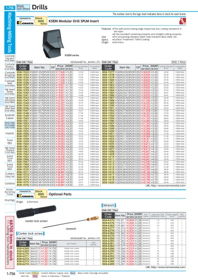 THENUMBERNEXTTOTHELOGOMARKINDICATESITEMSINSTOCKFOREACHBRAND.KSEMSERIES(CENTERLOCKSCREW)(WRENCH)KENNAMETALKSEMMODULARDRILLSPLMINSERTORDERUNIT:1PIECEKENNAMETALJAPANLTD.ORDERCODEITEMNO.OPPRICE(PERPIECE)MSRP(PERPIECE)CUTTINGDIAMETER(MM)COMPATIBLEBODY858-1532KSEM1250SPLMKCMS35¥17,626¥19,20012.50KSEMTYPE858-1533KSEM1270SPLMKCMS35¥17,626¥19,20012.70KSEMTYPE858-1534KSEM1300SPLMKCMS35¥17,626¥19,20013.00KSEMTYPE858-1535KSEM1350SPLMKCMS35¥17,626¥19,20013.50KSEMTYPE858-1536KSEM1400SPLMKCMS35¥17,626¥19,20014.00KSEMTYPE858-1537KSEM1429SPLMKCMS35¥19,921¥21,70014.29KSEMTYPE858-1538KSEM1450SPLMKCMS35¥19,921¥21,70014.50KSEMTYPE858-1539KSEM1500SPLMKCMS35¥19,921¥21,70015.00KSEMTYPE858-1540KSEM1550SPLMKCMS35¥19,921¥21,70015.50KSEMTYPE858-1541KSEM1588SPLMKCMS35¥19,921¥21,70015.88KSEMTYPE858-1542KSEM1600SPLMKCMS35¥19,921¥21,70016.00KSEMTYPE858-1543KSEM1609SPLMKCMS35¥22,307¥24,30016.09KSEMTYPE858-1544KSEM1615SPLMKCMS35¥22,307¥24,30016.15KSEMTYPE858-1545KSEM1627SPLMKCMS35¥22,307¥24,30016.27KSEMTYPE858-1546KSEM1650SPLMKCMS35¥22,307¥24,30016.50KSEMTYPE858-1547KSEM1667SPLMKCMS35¥22,307¥24,30016.67KSEMTYPE858-1548KSEM1700SPLMKCMS35¥22,307¥24,30017.00KSEMTYPE858-1549KSEM1746SPLMKCMS35¥22,307¥24,30017.46KSEMTYPE858-1550KSEM1750SPLMKCMS35¥22,307¥24,30017.50KSEMTYPE858-1551KSEM1800SPLMKCMS35¥22,307¥24,30018.00KSEMTYPE858-1552KSEM1830SPLMKCMS35¥23,225¥25,30018.30KSEMTYPE858-1553KSEM1850SPLMKCMS35¥24,052¥26,20018.50KSEMTYPE858-1554KSEM1900SPLMKCMS35¥24,052¥26,20019.00KSEMTYPE858-1555KSEM1905SPLMKCMS35¥24,052¥26,20019.05KSEMTYPE858-1556KSEM1920SPLMKCMS35¥24,052¥26,20019.20KSEMTYPE858-1557KSEM1923SPLMKCMS35¥24,052¥26,20019.23KSEMTYPE858-1558KSEM1925SPLMKCMS35¥24,052¥26,20019.25KSEMTYPE858-1559KSEM1927SPLMKCMS35¥24,052¥26,20019.27KSEMTYPE858-1560KSEM1935SPLMKCMS35¥24,052¥26,20019.35KSEMTYPE858-1561KSEM1945SPLMKCMS35¥24,052¥26,20019.45KSEMTYPE858-1562KSEM1950SPLMKCMS35¥24,052¥26,20019.50KSEMTYPE858-1563KSEM1984SPLMKCMS35¥24,052¥26,20019.84KSEMTYPE858-1564KSEM2000SPLMKCMS35¥24,052¥26,20020.00KSEMTYPE858-1565KSEM2024SPLMKCMS35¥24,235¥26,40020.24KSEMTYPE858-1566KSEM2050SPLMKCMS35¥24,970¥27,20020.50KSEMTYPE858-1567KSEM2064SPLMKCMS35¥24,970¥27,20020.64KSEMTYPE858-1568KSEM2100SPLMKCMS35¥24,970¥27,20021.00KSEMTYPE858-1569KSEM2150SPLMKCMS35¥24,970¥27,20021.50KSEMTYPE858-1570KSEM2200SPLMKCMS35¥24,970¥27,20022.00KSEMTYPE858-1571KSEM2223SPLMKCMS35¥26,897¥29,30022.23KSEMTYPE858-1572KSEM2250SPLMKCMS35¥26,347¥28,70022.50KSEMTYPE858-1573KSEM2300SPLMKCMS35¥26,897¥29,30023.00KSEMTYPE858-1574KSEM2350SPLMKCMS35¥26,347¥28,70023.50KSEMTYPE858-1575KSEM2381SPLMKCMS35¥26,897¥29,30023.81KSEMTYPE858-1576KSEM2400SPLMKCMS35¥26,897¥29,30024.00KSEMTYPEKENNAMETALOPTIONALPARTSORDERUNIT:1PIECEKENNAMETALJAPANLTD.ORDERCODEITEMNO.PRICE(PERPIECE)MSRP(PERPIECE)ITEMNAMESPQ(PIECE)858-6268364.010¥1,521¥1,760CENTERLOCKSCREW1858-6269364.011¥1,521¥1,760CENTERLOCKSCREW1858-6270364.012¥1,521¥1,760CENTERLOCKSCREW1858-6271364.013¥1,521¥1,760CENTERLOCKSCREW1858-6272364.015¥1,521¥1,760CENTERLOCKSCREW1858-6273364.016¥1,521¥1,760CENTERLOCKSCREW1858-6274364.017¥1,521¥1,760CENTERLOCKSCREW1STOCK895ITEMSSTOCK895ITEMSFEATURES●THESPLITPOINT(CUTTINGEDGESHAPE)HASLOWCUTTINGRESISTANCEINTHISTYPE.●ITHASEXCELLENTCENTERINGPROPERTYANDSTRAIGHTCUTTINGPROPERTY.USE●FORPROCESSINGSTAINLESSSTEEL,HEATRESISTANTALLOYSTEEL,ETC.SPECS●SURFACETREATMENT:TIALNCOATINGORIGIN●GERMANYORIGIN●GERMANYCENTERLOCKSCREWORDERUNIT:1PIECEORDERCODEITEMNO.PRICE(PERPIECE)MSRP(PERPIECE)ITEMNAMEOPPOSITESIDEDIMENSION(MM)SHAFTLENGTH(MM)SPQ(PIECE)858-6275170.27¥2,834¥3,280WRENCH1.51851858-6276170.271¥2,834¥3,280WRENCH1.52251858-6283170.281¥3,319¥3,840WRENCH1.52971858-6277170.272¥2,834¥3,280WRENCH22101858-6278170.273¥2,834¥3,280WRENCH22601858-6284170.282¥3,319¥3,840WRENCH23431858-6279170.274¥2,834¥3,280WRENCH2.52401858-6280170.275¥2,834¥3,280WRENCH2.52951858-6285170.283¥3,319¥3,840WRENCH2.53931858-6281170.276¥2,834¥3,280WRENCH32651858-6282170.277¥3,319¥3,280WRENCH33301858-6286170.284¥3,319¥3,840WRENCH34391858-6290170.294¥2,834¥3,280WRENCHT51561858-6291170.295¥2,834¥3,280WRENCHT51881858-6292170.296¥2,834¥3,280WRENCHT52901858-6287170.289¥2,834¥3,280WRENCHT61561858-6288170.290¥2,834¥3,280WRENCHT61881858-6289170.291¥2,834¥3,280WRENCHT62901URLHTTP://WWW.KENNAMETAL.COM/ORDERUNIT:1PIECEORDERCODEITEMNO.OPPRICE(PERPIECE)MSRP(PERPIECE)CUTTINGDIAMETER(MM)COMPATIBLEBODY858-1577KSEM2450SPLMKCMS35¥28,825¥31,40024.50KSEMTYPE858-1578KSEM2500SPLMKCMS35¥29,835¥32,50025.00KSEMTYPE858-1579KSEM2525SPLMKCMS35¥28,825¥31,40025.25KSEMTYPE858-1580KSEM2530SPLMKCMS35¥28,825¥31,40025.30KSEMTYPE858-1581KSEM2540SPLMKCMS35¥29,835¥32,50025.40KSEMTYPE858-1582KSEM2550SPLMKCMS35¥28,825¥31,40025.50KSEMTYPE858-1583KSEM2560SPLMKCMS35¥29,835¥32,50025.60KSEMTYPE858-1584KSEM2565SPLMKCMS35¥29,835¥32,50025.65KSEMTYPE858-1585KSEM2567SPLMKCMS35¥29,835¥32,50025.67KSEMTYPE858-1586KSEM2581SPLMKCMS35¥29,835¥32,50025.81KSEMTYPE858-1587KSEM2600SPLMKCMS35¥29,835¥32,50026.00KSEMTYPE858-1588KSEM2619SPLMKCMS35¥31,028¥33,80026.19KSEMTYPE858-1589KSEM2630SPLMKCMS35¥30,202¥32,90026.30KSEMTYPE858-1590KSEM2650SPLMKCMS35¥30,202¥32,90026.50KSEMTYPE858-1591KSEM2659SPLMKCMS35¥30,202¥32,90026.59KSEMTYPE858-1592KSEM2700SPLMKCMS35¥31,028¥33,80027.00KSEMTYPE858-1593KSEM2750SPLMKCMS35¥30,202¥32,90027.50KSEMTYPE858-1594KSEM2800SPLMKCMS35¥30,202¥32,90028.00KSEMTYPE858-1595KSEM2850SPLMKCMS35¥31,763¥34,60028.50KSEMTYPE858-1596KSEM2858SPLMKCMS35¥32,956¥35,90028.58KSEMTYPE858-1597KSEM2900SPLMKCMS35¥31,763¥34,60029.00KSEMTYPE858-1598KSEM2950SPLMKCMS35¥32,956¥35,90029.50KSEMTYPE858-1599KSEM3000SPLMKCMS35¥32,956¥35,90030.00KSEMTYPE858-1600KSEM3050SPLMKCMS35¥35,068¥38,20030.50KSEMTYPE858-1601KSEM3100SPLMKCMS35¥35,068¥38,20031.00KSEMTYPE858-1602KSEM3150SPLMKCMS35¥35,068¥38,20031.50KSEMTYPE858-1603KSEM3175SPLMKCMS35¥36,261¥39,50031.75KSEMTYPE858-1604KSEM3200SPLMKCMS35¥36,261¥39,50032.00KSEMTYPE858-1605KSEM3
