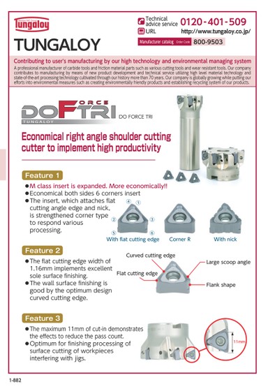 1-882*S108820*0120-401-509TUNGALOYURLHTTP://WWW.TUNGALOY.CO.JP/ORDERCODE800-9503MANUFACTURERCATALOGAPROFESSIONALMANUFACTUREROFCARBIDETOOLSANDFRICTIONMATERIALPARTSSUCHASVARIOUSCUTTINGTOOLSANDWEARRESISTANTTOOLS.OURCOMPANYCONTRIBUTESTOMANUFACTURINGBYMEANSOFNEWPRODUCTDEVELOPMENTANDTECHNICALSERVICEUTILIZINGHIGHLEVELMATERIALTECHNOLOGYANDSTATE-OF-THE-ARTPROCESSINGTECHNOLOGYCULTIVATEDTHROUGHOURHISTORYMORETHAN70YEARS.OURCOMPANYISGLOBALLYGROWINGWHILEPUTTINGOUREffORTSINTOENVIRONMENTALMEASURESSUCHASCREATINGENVIRONMENTALLYFRIENDLYPRODUCTSANDESTABLISHINGRECYCLINGSYSTEMOFOURPRODUCTS.CONTRIBUTINGTOUSER'SMANUFACTURINGBYOURHIGHTECHNOLOGYANDENVIRONMENTALMANAGINGSYSTEMECONOMICALRIGHTANGLESHOULDERCUTTINGCUTTERTOIMPLEMENTHIGHPRODUCTIVITY●MCLASSINSERTISEXPANDED.MOREECONOMICALLY!!●ECONOMICALBOTHSIDES6CORNERSINSERT●THEINSERT,WHICHATTACHESFLATCUTTINGANGLEEDGEANDNICK,ISSTRENGTHENEDCORNERTYPETORESPONDVARIOUSPROCESSING.WITHFLATCUTTINGEDGECURVEDCUTTINGEDGELARGESCOOPANGLEFLANKSHAPEFLATCUTTINGEDGECORNERR11MMWITHNICK①④②③⑤⑥DOFORCETRIFEATURE1●THEFLATCUTTINGEDGEWIDTHOF1.16MMIMPLEMENTSEXCELLENTSOLESURFACEFINISHING.●THEWALLSURFACEFINISHINGISGOODBYTHEOPTIMUMDESIGNCURVEDCUTTINGEDGE.FEATURE2●THEMAXIMUM11MMOFCUT-INDEMONSTRATESTHEEFFECTSTOREDUCETHEPASSCOUNT.●OPTIMUMFORFINISHINGPROCESSINGOFSURFACECUTTINGOFWORKPIECESINTERFERINGWITHJIGS.FEATURE3TECHNICALADVICESERVICE