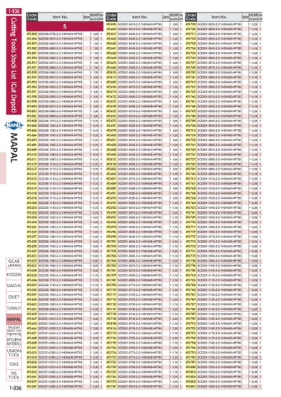 1-9361-936CUTTINGTOOLSSTOCKLIST(CUTDEPOT)MAPALORDERCODEITEMNO.OPTIONSMSRP(PERPIECE)ORDERUNITORDERCODEITEMNO.OPTIONSMSRP(PERPIECE)ORDERUNITORDERCODEITEMNO.OPTIONSMSRP(PERPIECE)ORDERUNITISCARJAPANKYOCERASANDVIKDIJETTUNGALOYMAPALMITSUBISHIHITACHITOOLENGINEERINGMITSUBISHIMATERIALSUNIONTOOLOSGNSTOOL492-7290SCD351-0820-2-2-140HA04-HP765¥13,2001492-7303SCD351-0820-2-2-140HA06-HP765¥14,1001492-7311SCD351-0830-2-2-140HA04-HP765¥13,2001492-7320SCD351-0830-2-2-140HA06-HP765¥14,1001492-7338SCD351-0840-2-2-140HA04-HP765¥13,2001492-7346SCD351-0840-2-2-140HA06-HP765¥14,1001492-7354SCD351-0860-2-2-140HA04-HP765¥13,2001492-7362SCD351-0860-2-2-140HA06-HP765¥14,1001492-7371SCD351-0870-2-2-140HA04-HP765¥13,2001492-7389SCD351-0870-2-2-140HA06-HP765¥14,1001492-7397SCD351-0880-2-2-140HA04-HP765¥13,2001492-7401SCD351-0880-2-2-140HA06-HP765¥14,1001492-7419SCD351-0890-2-2-140HA04-HP765¥13,2001492-7427SCD351-0890-2-2-140HA06-HP765¥14,1001492-7435SCD351-0910-2-2-140HA04-HP765¥13,2001492-7443SCD351-0910-2-2-140HA06-HP765¥14,1001492-7451SCD351-0920-2-2-140HA04-HP765¥13,2001492-7460SCD351-0920-2-2-140HA06-HP765¥14,1001492-7478SCD351-0930-2-2-140HA04-HP765¥13,2001492-7486SCD351-0930-2-2-140HA06-HP765¥14,1001492-7494SCD351-0940-2-2-140HA04-HP765¥13,2001492-7508SCD351-0940-2-2-140HA06-HP765¥14,1001492-7516SCD351-0950-2-2-140HA04-HP765¥13,2001492-7524SCD351-0950-2-2-140HA06-HP765¥14,1001492-7532SCD351-0960-2-2-140HA04-HP765¥13,2001492-7541SCD351-0960-2-2-140HA06-HP765¥14,1001492-7559SCD351-0970-2-2-140HA04-HP765¥13,2001492-7567SCD351-0970-2-2-140HA06-HP765¥14,1001492-7575SCD351-0980-2-2-140HA04-HP765¥13,2001492-7583SCD351-0980-2-2-140HA06-HP765¥14,1001492-7591SCD351-0990-2-2-140HA04-HP765¥13,2001492-7605SCD351-0990-2-2-140HA06-HP765¥14,1001492-7613SCD351-1010-2-2-140HA04-HP765¥18,8001492-7621SCD351-1010-2-2-140HA06-HP765¥20,5001492-7630SCD351-1020-2-2-140HA04-HP765¥18,8001492-7648SCD351-1020-2-2-140HA06-HP765¥20,5001492-7656SCD351-1030-2-2-140HA04-HP765¥18,8001492-7664SCD351-1030-2-2-140HA06-HP765¥20,5001492-7672SCD351-1040-2-2-140HA04-HP765¥18,8001492-7681SCD351-1040-2-2-140HA06-HP765¥20,5001492-7699SCD351-1050-2-2-140HA04-HP765¥18,8001492-7702SCD351-1050-2-2-140HA06-HP765¥20,5001492-7711SCD351-1060-2-2-140HA04-HP765¥18,8001492-7729SCD351-1060-2-2-140HA06-HP765¥20,5001492-7737SCD351-1070-2-2-140HA04-HP765¥18,8001492-7745SCD351-1070-2-2-140HA06-HP765¥20,5001492-7753SCD351-1080-2-2-140HA04-HP765¥18,8001492-7761SCD351-1080-2-2-140HA06-HP765¥20,5001492-7770SCD351-1090-2-2-140HA04-HP765¥18,8001492-7788SCD351-1090-2-2-140HA06-HP765¥20,5001492-7796SCD351-1100-2-2-140HA04-HP765¥18,8001492-7800SCD351-1100-2-2-140HA06-HP765¥20,5001492-7818SCD351-1110-2-2-140HA04-HP765¥18,8001492-7826SCD351-1110-2-2-140HA06-HP765¥20,5001492-7834SCD351-1120-2-2-140HA04-HP765¥18,8001492-7842SCD351-1120-2-2-140HA06-HP765¥20,5001492-7851SCD351-1130-2-2-140HA04-HP765¥18,8001492-7869SCD351-1130-2-2-140HA06-HP765¥20,5001492-7877SCD351-1140-2-2-140HA04-HP765¥18,8001492-7885SCD351-1140-2-2-140HA06-HP765¥20,5001492-7893SCD351-1150-2-2-140HA04-HP765¥18,8001492-7907SCD351-1150-2-2-140HA06-HP765¥20,5001492-7915SCD351-1160-2-2-140HA04-HP765¥18,8001492-7923SCD351-1160-2-2-140HA06-HP765¥20,5001492-7931SCD351-1170-2-2-140HA04-HP765¥18,8001492-7940SCD351-1170-2-2-140HA06-HP765¥20,5001492-7958SCD351-1180-2-2-140HA04-HP765¥18,8001492-7966SCD351-1180-2-2-140HA06-HP765¥20,5001492-7974SCD351-1190-2-2-140HA04-HP765¥18,8001492-7982SCD351-1190-2-2-140HA06-HP765¥20,5001492-7991SCD351-1200-2-2-140HA04-HP765¥18,8001492-8008SCD351-1200-2-2-140HA06-HP765¥20,5001492-8016SCD351-1250-2-2-140HA04-HP765¥26,4001492-8024SCD351-1250-2-2-140HA06-HP765¥27,6001492-8032SCD351-1280-2-2-140HA04-HP765¥26,4001492-8041SCD351-1280-2-2-140HA06-HP765¥27,6001492-6595SCD351-0410-2-2-140HA04-HP765¥8,6001492-6609SCD351-0410-2-2-140HA06-HP765¥11,0001492-6617SCD351-0430-2-2-140HA04-HP765¥8,6001492-6625SCD351-0430-2-2-140HA06-HP765¥11,0001492-6633SCD351-0440-2-2-140HA04-HP765¥8,6001492-6641SCD351-0440-2-2-140HA06-HP765¥11,0001492-6650SCD351-0450-2-2-140HA04-HP765¥8,6001492-6668SCD351-0450-2-2-140HA06-HP765¥11,0001492-6676SCD351-0460-2-2-140HA04-HP765¥8,6001492-6684SCD351-0460-2-2-140HA06-HP765¥11,0001492-8105SCD351-0465-2-2-140HA04-HP765¥8,6001492-8113SCD351-0465-2-2-140HA06-HP765¥11,0001492-6692SCD351-0470-2-2-140HA04-HP765¥8,6001492-6706SCD351-0470-2-2-140HA06-HP765¥11,0001492-6714SCD351-0480-2-2-140HA04-HP765¥8,6001492-6722SCD351-0480-2-2-140HA06-HP765¥11,0001492-6731SCD351-0490-2-2-140HA04-HP765¥8,6001492-6749SCD351-0490-2-2-140HA06-HP765¥11,0001492-6757SCD351-0510-2-2-140HA04-HP765¥8,6001492-6765SCD351-0510-2-2-140HA06-HP765¥11,0001492-6773SCD351-0520-2-2-140HA04-HP765¥8,6001492-6781SCD351-0520-2-2-140HA06-HP765¥11,0001492-6790SCD351-0530-2-2-140HA04-HP765¥8,6001492-6803SCD351-0530-2-2-140HA06-HP765¥11,0001492-6811SCD351-0540-2-2-140HA04-HP765¥8,6001492-6820SCD351-0540-2-2-140HA06-HP765¥11,0001492-6838SCD351-0550-2-2-140HA04-HP765¥8,6001492-6846SCD351-0550-2-2-140HA06-HP765¥11,0001492-8121SCD351-0555-2-2-140HA04-HP765¥8,6001492-8130SCD351-0555-2-2-140HA06-HP765¥11,0001492-6854SCD351-0560-2-2-140HA04-HP765¥8,6001492-6862SCD351-0560-2-2-140HA06-HP765¥11,0001492-6871SCD351-0570-2-2-140HA04-HP765¥8,6001492-6889SCD351-0570-2-2-140HA06-HP765¥11,0001492-6897SCD351-0580-2-2-140HA04-HP765¥8,6001492-6901SCD351-0580-2-2-140HA06-HP765¥11,0001492-6919SCD351-0590-2-2-140HA04-HP765¥8,6001492-6927SCD351-0590-2-2-140HA06-HP765¥11,0001492-6935SCD351-0610-2-2-140HA04-HP765¥11,7001492-6943SCD351-0610-2-2-140HA06-HP765¥12,2001492-6951SCD351-0620-2-2-140HA04-HP765¥11,7001492-6960SCD351-0620-2-2-140HA06-HP765¥12,2001492-6978SCD351-0630-2-2-140HA04-HP765¥11,7001492-6986SCD351-0630-2-2-140HA06-HP765¥12,2001492-6994SCD351-0640-2-2-140HA04-HP765¥11,7001492-7001SCD351-0640-2-2-140HA06-HP765¥12,2001492-7010SCD351-0650-2-2-140HA04-HP765¥11,7001492-7028SCD351-0650-2-2-140HA06-HP765¥12,2001492-7036SCD351-0660-