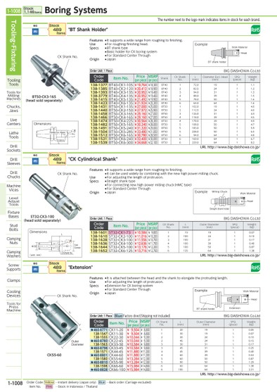 THENUMBERNEXTTOTHELOGOMARKINDICATESITEMSINSTOCKFOREACHBRAND.ST32-CK3-100(HEADSOLDSEPARATELY)CKSHANKNO.WORKMATERIALHEADSTRAIGHTSHANKHOLDERMILLINGCHUCKEXAMPLEBTSHANKHOLDERHEADEXTENSIONWORKMATERIALEXAMPLECK55-60LCKSHANKNO.OUTERDIAMETERBTSHANKHOLDERHEADWORKMATERIALEXAMPLEBT50-CK3-165(HEADSOLDSEPARATELY)CKSHANKNO.CKSHANKNO.DIAMETEREXCL.HEADLDIMENSIONSCKSHANKNO.LOUTERDIAMETERΦ32DIMENSIONS(UNIT:MM)BIG"BTSHANKHOLDER"ORDERCODEITEMNO.PRICE(PERPIECE)MSRP(PERPIECE)SHANKCKSHANKNO.L(MM)DIAMETEREXCL.HEAD(MM)SPQ(PIECE)WEIGHT(KG)138-1377BT40-CK1-105¥19,764¥18,300BT40172.01911.1138-1385BT40-CK2-120¥20,412¥18,900BT40282.52411.2138-1393BT40-CK3-135¥20,952¥19,400BT40394.03111.3138-3779BT40-CK4-135¥20,952¥19,400BT40488.03911.5138-1415BT40-CK5-135¥21,492¥19,900BT40578.05011.6138-1423BT40-CK6-135¥21,924¥20,300BT40664.06411.6138-1431BT50-CK1-135¥27,000¥25,000BT501102.01914.0138-1440BT50-CK2-150¥27,972¥25,900BT502112.52414.0138-1458BT50-CK3-165¥29,160¥27,000BT503124.03114.3138-1466BT50-CK4-165¥29,160¥27,000BT504118.03914.5138-1474BT50-CK4-225¥30,564¥28,300BT504178.03914.9138-1482BT50-CK5-165¥30,240¥28,000BT505108.05014.7138-1491BT50-CK5-240¥31,320¥29,000BT505183.05015.9138-1504BT50-CK5-285¥33,480¥31,000BT505228.05016.5138-1512BT50-CK6-165¥30,780¥28,500BT50694.06414.8138-1521BT50-CK6-240¥32,400¥30,000BT506169.06416.7138-1539BT50-CK6-300¥34,668¥32,100BT506229.06418.2URLHTTP://WWW.BIG-DAISHOWA.CO.JP/BIG"CKCYLINDRICALSHANK"ORDERCODEITEMNO.PRICE(PERPIECE)MSRP(PERPIECE)CKSHANKNO.L(MM)OUTERDIAMETER(MM)SPQ(PIECE)WEIGHT(KG)138-1601ST32-CK1-73¥10,584¥9,8001731910.07138-1610ST32-CK2-100¥11,016¥10,20021002410.10138-1628ST32-CK3-100¥11,556¥10,70031003110.17138-1636ST32-CK4-100¥12,636¥11,70041003910.40138-1644ST32-CK5-100¥13,176¥12,20051005010.87138-1652ST32-CK6-125¥13,716¥12,70061256411.38URLHTTP://WWW.BIG-DAISHOWA.CO.JP/BIG"EXTENSION"ORDERCODEITEMNO.PRICE(PERPIECE)MSRP(PERPIECE)CKSHANKNO.L(MM)OUTERDIAMETER(MM)SPQ(PIECE)WEIGHT(KG)★460-8771CK11-20¥9,504¥8,8001201910.05138-1547CK11-30¥9,504¥8,8001301910.07138-1555CK22-30¥10,044¥9,3002302410.10★460-8780CK22-45¥10,044¥9,3002452410.15138-1563CK33-30¥10,584¥9,8003303110.17★460-8798CK33-45¥10,584¥9,8003453110.25138-1571CK44-45¥11,880¥11,0004453910.40★460-8801CK44-60¥11,880¥11,0004603910.53138-1580CK55-60¥13,284¥12,3005605010.87★460-8810CK55-90¥13,284¥12,3005905011.29138-1598CK66-60¥15,984¥14,8006606411.38★460-8828CK66-100¥15,984¥14,80061006412.31URLHTTP://WWW.BIG-DAISHOWA.CO.JP/STOCK489ITEMSSTOCK489ITEMSSTOCK489ITEMSORDERUNIT:1PIECEBIGDAISHOWACO.LTDORDERUNIT:1PIECEBIGDAISHOWACO.LTDORDERUNIT:1PIECEBLUEFACTORYDIRECTSHIPPINGNOTINCLUDEDBIGDAISHOWACO.LTDFEATURES●ITSUPPORTSAWIDERANGEFROMROUGHINGTOFINISHING.USE●FORROUGHING/FINISHINGHEAD.SPECS●BTSHANKTYPE●BASICHOLDERFORCKBORINGSYSTEM●FORSTANDARDCENTERTHROUGHORIGIN●JAPANFEATURES●ITSUPPORTSAWIDERANGEFROMROUGHINGTOFINISHING.●ITCANBEUSEDWIDELYBYCOMBININGWITHTHENEWHIGHPOWERMILLINGCHUCK.USE●FORADJUSTINGTHELENGTHOFPROTRUSION.SPECS●STRAIGHTSHANKTYPE●FORCONNECTINGNEWHIGHPOWERMILLINGCHUCK(HMCTYPE)●FORSTANDARDCENTERTHROUGHORIGIN●JAPANFEATURES●ITISATTACHEDBETWEENTHEHEADANDTHESHANKTOELONGATETHEPROTRUDINGLENGTH.USE●FORADJUSTINGTHELENGTHOFPROTRUSION.SPECS●EXTENSIONFORCKBORINGSYSTEM●FORSTANDARDCENTERTHROUGHORIGIN●JAPANTOOLING・FIXTURINGTOOLINGTOOLSTOOLSFORMILLINGMACHINESCHUCKS,JAWSLIVECENTERSLATHETOOLSDRILLSOCKETSDRILLSLEEVESDRILLCHUCKSMACHINEVICESLEVELADJUSTTOOLSFIXTUREBASESSTUDBOLTSCLAMPINGNUTSCLAMPINGWASHERSSCREWSUPPORTSCLAMPSCOOLINGDEVICESTOOLSFORPRESSMACHINESTOCK1,146ITEMSBORINGSYSTEMS1-1008*0107880*1-1008ORDERCODEYELLOW…INSTANTDELIVERY(JAPANONLY)BLUE…BACKORDER(CARRIAGEEXCLUDED)ITEMNO.PINK…STOCKININDONESIA/THAILAND