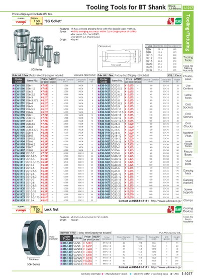 PRICESDISPLAYEDINCLUDE8%TAX.TYPEOUTERDIAMETER(MM)TOTALLENGTH(MM)SG610.1518.5SG812.823.5SG1015.328.0SG1217.932.5SG1622.837.0SG2027.641.0SG2533.250.0SG3241.558.5TOTALLENGTHGRASPDIAMETEROUTERDIAMETERDIMENSIONSSGSERIESSGNSERIESOUTERDIAMETERTHICKNESSYUKIWA"SGCOLLET"STOCK150ITEMSORDERUNIT:1PIECEFACTORYDIRECTSHIPPINGNOTINCLUDEDYUKIWASEIKOINC.ORDERCODEITEMNO.PRICE(PERPIECE)MSRP(PERPIECE)CLAMPINGDIAMETER(MM)COMPATIBLEMODELWEIGHT(G)★836-1385SG6-1¥7,695-1.000SGC67★836-1386SG6-1.5¥7,695-1.500SGC67★836-1387SG6-2¥7,695-2.000SGC67★836-1388SG6-2.5¥7,695-2.500SGC67★836-1389SG6-3¥6,210-3.000SGC66★836-1390SG6-3.175¥6,210-3.175SGC66★836-1391SG6-4¥6,210-4.000SGC65★836-1392SG6-5¥6,210-5.000SGC65★836-1393SG6-5.5¥6,210-5.500SGC65★836-1394SG6-6¥6,210-6.000SGC64★836-1395SG8-1¥7,290-1.000SGC813★836-1396SG8-1.5¥7,290-1.500SGC813★836-1397SG8-2¥7,290-2.000SGC813★836-1398SG8-2.5¥7,290-2.500SGC813★836-1399SG8-3¥6,345-3.000SGC812★836-1400SG8-3.175¥6,345-3.175SGC812★836-1401SG8-4¥6,345-4.000SGC812★836-1402SG8-5¥6,345-5.000SGC811★836-1403SG8-5.5¥6,345-5.500SGC811★836-1404SG8-6¥6,345-6.000SGC811★836-1405SG8-6.2¥6,345-6.200SGC811★836-1406SG8-7¥6,345-7.000SGC810★836-1407SG8-8¥6,345-8.000SGC89★836-1408SG10-2¥7,290-2.000SGC1020★836-1409SG10-2.5¥7,290-2.500SGC1020★836-1410SG10-3¥6,345-3.000SGC1020★836-1411SG10-3.175¥6,345-3.175SGC1020★836-1412SG10-4¥6,345-4.000SGC1020★836-1413SG10-5¥6,345-5.000SGC1020★836-1414SG10-5.5¥6,345-5.500SGC1020★836-1415SG10-6¥6,345-6.000SGC1020★836-1416SG10-6.2¥6,345-6.200SGC1019★836-1417SG10-7¥6,345-7.000SGC1019★836-1418SG10-8¥6,345-8.000SGC1018★836-1419SG10-8.5¥6,345-8.500SGC1017★836-1420SG10-9¥6,345-9.000SGC1016★836-1421SG10-10¥6,345-10.000SGC1014★836-1422SG12-3¥6,615-3.000SGC1233★836-1423SG12-3.175¥6,615-3.175SGC1233★836-1424SG12-4¥6,615-4.000SGC1233YUKIWALOCKNUTSTOCK150ITEMSORDERUNIT:1PIECEFACTORYDIRECTSHIPPINGNOTINCLUDEDYUKIWASEIKOINC.ORDERCODEITEMNO.PRICE(PERPIECE)MSRP(PERPIECE)SCREWDIMENSIONOUTERDIAMETER(MM)THICKNESS(MM)COMPATIBLECOLLETSPQ(PIECE)WEIGHT(G)★836-1488SGN6¥5,981-M14X1.0209.8SG6111★836-1489SGN8¥6,237-M20X1.02612.3SG8124★836-1490SGN10¥7,223-M24X1.03113.8SG10140★836-1491SGN12¥7,803-M27X1.03614.5SG12159★836-1492SGN16¥8,640-M33X1.54215.5SG16179★836-1493SGN20¥9,140-M42X1.55018.0SG201111★836-1494SGN25¥10,382-M48X1.56021.0SG251214★836-1495SGN32¥11,138-M60X1.57225.0SG321337CONTACTUS:0258-81-1111HTTP://WWW.YUKIWA.CO.JP/FEATURES●ITHASASTRONGGRIPPINGFORCEWITHTHEDOUBLETAPERMETHOD.SPECS●4DTIPSWINGINGACCURACY:WITHIN3ΜM(SINGLEPIECEOFCOLLET)●FORSUPERG1CHUCK(SGC)●FORGREENG1CHUCK(GGC)ORIGIN●JAPANFEATURES●ALOCKNUTEXCLUSIVEFORSGCOLLETS.ORIGIN●JAPANORDERUNIT:1PIECEFACTORYDIRECTSHIPPINGNOTINCLUDEDORDERCODEITEMNO.PRICE(PERPIECE)MSRP(PERPIECE)CLAMPINGDIAMETER(MM)COMPATIBLEMODELWEIGHT(G)★836-1425SG12-5¥6,615-5.0SGC1233★836-1426SG12-5.5¥6,615-5.5SGC1233★836-1427SG12-6¥6,615-6.0SGC1233★836-1428SG12-6.2¥6,615-6.2SGC1233★836-1429SG12-7¥6,615-7.0SGC1232★836-1430SG12-8¥6,615-8.0SGC1231★836-1431SG12-8.5¥6,615-8.5SGC1230★836-1432SG12-9¥6,615-9.0SGC1229★836-1433SG12-10¥6,615-10.0SGC1227★836-1434SG12-10.5¥6,615-10.5SGC1226★836-1435SG12-11¥6,615-11.0SGC1225★836-1436SG12-12¥6,615-12.0SGC1222★836-1437SG12-12.5¥6,615-12.5SGC1220★836-1438SG16-3¥7,020-3.0SGC1661★836-1440SG16-4¥7,020-4.0SGC1663★836-1442SG16-6¥7,020-6.0SGC1663★836-1444SG16-8¥7,020-8.0SGC1662★836-1446SG16-10¥7,020-10.0SGC1659★836-1448SG16-12¥7,020-12.0SGC1655★836-1452SG16-16¥7,020-16.0SGC1639★836-1453SG20-3¥7,425-3.0SGC2089★836-1455SG20-4¥7,425-4.0SGC2099★836-1457SG20-6¥7,425-6.0SGC20100★836-1459SG20-8¥7,425-8.0SGC20102★836-1461SG20-10¥7,425-10.0SGC2098★836-1463SG20-12¥7,425-12.0SGC2098★836-1467SG20-16¥7,425-16.0SGC2082★836-1471SG20-20¥7,425-20.0SGC2057★836-1472SG25-6¥9,315-6.0SGC25166★836-1473SG25-8¥9,315-8.0SGC25170★836-1474SG25-10¥9,315-10.0SGC25170★836-1475SG25-12¥9,315-12.0SGC25176★836-1476SG25-16¥9,315-16.0SGC25166★836-1477SG25-20¥9,315-20.0SGC25142★836-1478SG25-25¥9,315-25.0SGC2593★836-1482SG32-16¥11,070-16.0SGC32320★836-1483SG32-20¥11,070-20.0SGC32300★836-1484SG32-25¥11,070-25.0SGC32262★836-1487SG32-32¥11,070-32.0SGC32158CONTACTUS:0258-81-1111HTTP://WWW.YUKIWA.CO.JP/SPQ:1PIECETOOLING・FIXTURINGTOOLINGTOOLSTOOLSFORMILLINGMACHINESCHUCKS,JAWSLIVECENTERSLATHETOOLSDRILLSOCKETSDRILLSLEEVESDRILLCHUCKSMACHINEVICESLEVELADJUSTTOOLSFIXTUREBASESSTUDBOLTSCLAMPINGNUTSCLAMPINGWASHERSSCREWSUPPORTSCLAMPSCOOLINGDEVICESTOOLSFORPRESSMACHINETOOLINGTOOLSFORBTSHANKSTOCK1,146ITEMS1-1017*C006003*1-1017DELIVERYESTIMATE★…MANUFACTURERSTOCK★…DELIVERYWITHIN7WORKINGDAYS★…ASK