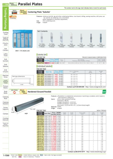 THENUMBERNEXTTOTHELOGOMARKINDICATESITEMSINSTOCKFOREACHBRAND.SKE-1(15SHEETSSET)0.2MMTINPLATE(TINPLATED)2SHEETS0.3MMTINPLATE(TINPLATED)3SHEETS0.5MMSTEEL(ZINCPLATED)4SHEETS1.0MMSTEEL(ZINCPLATED)3SHEETS1.5MMSTEEL(ZINCPLATED)1SHEET2.0MMSTEEL(ZINCPLATED)1SHEET3.0MMSTEEL(ZINCPLATED)1SHEETSETCONTENTSTOTALLENGTHWIDTHHEIGHTHGPLENGTHTHICKNESSWIDTHFLATTYPEDIMENSIONSNEWSTRONGHARDENEDGROUNDPARALLELORDERCODEITEMNO.PRICE(PERPIECE)MSRP(PERPIECE)HEIGHT(MM)WIDTH(MM)TOTALLENGTH(MM)SPQ(PIECE)WEIGHT(KG)780-6043HGP-100¥8,640¥8,50012810010.08780-6051HGP-101¥8,910¥8,70015810010.10780-6060HGP-102¥9,315¥9,100151010010.13780-6078HGP-103¥10,125¥9,940201010010.17780-6086HGP-104¥10,260¥10,100251010010.22780-6094HGP-105¥10,125¥9,940151210010.16780-6108HGP-106¥10,260¥10,100201210010.21780-6116HGP-107¥11,610¥11,400251210010.26780-6124HGP-108¥14,175¥13,900201615010.42780-6132HGP-109¥11,340¥11,100251615010.53780-6141HGP-110¥15,390¥15,200301615010.64780-6159HGP-111¥15,795¥15,500252020010.88780-6167HGP-112¥15,930¥15,700302020011.05780-6175HGP-113¥13,095¥12,900402020011.40780-6183HGP-114¥17,685¥17,400302525011.64780-6191HGP-115¥19,170¥18,900402525012.20780-6205HGP-116¥21,330¥21,000502525012.75780-6213HGP-117¥23,355¥23,000402830012.95780-6221HGP-118¥24,165¥23,800502830013.70780-6230HGP-119¥26,865¥26,500753830015.00780-6248HGP-120¥29,565¥29,200753830017.50CONTACTUS:06-6747-0771HTTP://WWW.NEWSTRONG.CO.JP/TRUSCOCENTERINGPLATE"SUKEITA"ORDERCODEITEMNO.PRICE(PERSHEET)MSRP(PERSHEET)WXLXTHICKNESS(MM)SPQ(SHEET)WEIGHT(G)768-1593SKE-BARA-02¥407¥44020X120X0.21010768-1607SKE-BARA-03¥407¥44020X120X0.31010768-1615SKE-BARA-05¥407¥44020X120X0.51010768-1623SKE-BARA-10¥407¥44020X120X1.01020768-1631SKE-BARA-15¥407¥44020X120X1.51030768-1640SKE-BARA-20¥407¥44020X120X2.01040768-1658SKE-BARA-30¥407¥44020X120X3.01060CONTACTUS:0120-509-849HTTP://WWW.ORANGE-BOOK.COM/ORDERCODEITEMNO.PRICE(PERSET)MSRP(PERSET)WXL(MM)SETCONTENTSTHICKNESS(MM)XNUMBEROFPLATESSPQ(SET)WEIGHT(G/SET)109-0704SKE-1¥1,666¥1,80020X1200.2X2,0.3X3,0.5X4,1.0X3,1.5X1,2.0X1,3.0X112250STOCK38,650ITEMSSTOCK680ITEMSORDERUNIT:1SETTRUSCONAKAYAMACORPORATIONORDERUNIT:1SHEETORDERUNIT:1PIECENEWSTRONGFEATURES●PARALLELISMISESTABLISHEDANDPRECISIONMACHININGISENABLED,WHICHLEADSTOIMPROVEMENTINEFFICIENCY.SPECS●FOURSIDESPOLISHEDFINISHING●HARDNESS:HRC45●HEIGHTPARALLELISM:±0.01MM●WIDTHPARALLELISM:±0.013MM●ACCURACY:±0.01MM(WXH),±0.5MM(TOTALLENGTH)MATERIALS●S45CORIGIN●JAPANDRAWING.COMFEATURES●VARIOUSTOOLBIT,JIGANDOTHERUNDERLAYINGLATHES,CICARBOARD,MILLING,SEWINGMACHINE,DRILLPRESSCANBEUSEDFORALLCENTERING,VERYCONVENIENT.●ALSOAVAILABLEFORTHICKNESSADJUSTMENT.USE●FORCENTERINGWORK.ORIGIN●JAPANSUKEITASETINDIVIDUALSUKEITATOOLING・FIXTURINGTOOLINGTOOLSTOOLSFORMILLINGMACHINESCHUCKS,JAWSLIVECENTERSLATHETOOLSDRILLSOCKETSDRILLSLEEVESDRILLCHUCKSMACHINEVICESLEVELADJUSTTOOLSFIXTUREBASESSTUDBOLTSCLAMPINGNUTSCLAMPINGWASHERSSCREWSUPPORTSCLAMPSCOOLINGDEVICESTOOLSFORPRESSMACHINESTOCK303ITEMSPARALLELPLATES1-1068*0108440*1-1068ORDERCODEYELLOW…INSTANTDELIVERY(JAPANONLY)BLUE…BACKORDER(CARRIAGEEXCLUDED)ITEMNO.PINK…STOCKININDONESIA/THAILAND