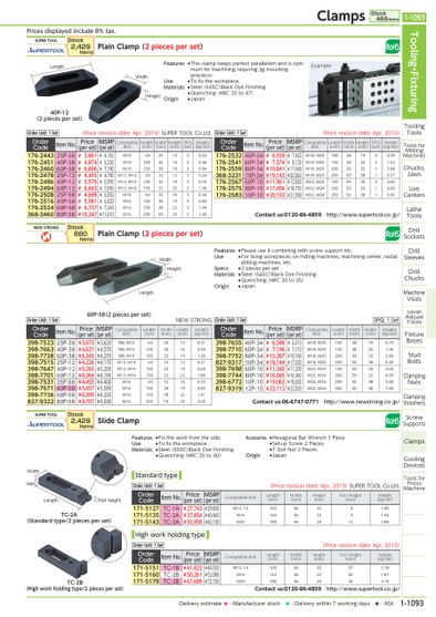 PRICESDISPLAYEDINCLUDE8%TAX.HEIGHTLENGTHWIDTHTC-2B(HIGHWORKHOLDINGTYPE/2PIECESPERSET)TC-2A(STANDARDTYPE/2PIECESPERSET)PORTHEIGHT60P-58(2PIECESPERSET)WIDTHLENGTHHEIGHTEXAMPLE40P-12(2PIECESPERSET)LENGTHHEIGHTWIDTHNEWSTRONGPLAINCLAMP(2PIECESPERSET)ORDERCODEITEMNO.PRICE(PERSET)MSRP(PERSET)COMPATIBLEBOLTLENGTH(MM)WIDTH(MM)HEIGHT(MM)WEIGHT(KG/SET)398-752325P-38¥3,672¥3,630M8,M106325120.21398-766340P-38¥4,631¥4,570M8,M1010025160.44398-772860P-38¥6,345¥6,270M8,M1015032191.20398-751525P-12¥4,226¥4,170M12,M146325120.21398-764740P-12¥5,265¥5,200M12,M1410032190.65398-770160P-12¥6,264¥6,190M12,M1415032221.80398-753125P-58¥4,455¥4,400M166332160.33398-767140P-58¥5,657¥5,590M1610038190.80398-773660P-58¥6,399¥6,320M1615038221.41827-932280P-58¥9,707¥9,590M1620050253.00SUPERTOOLSLIDECLAMPORDERCODEITEMNO.PRICE(PERSET)MSRP(PERSET)COMPATIBLEBOLTLENGTH(MM)WIDTH(MM)HEIGHT(MM)PORTHEIGHT(MM)WEIGHT(KG/SET)171-5151TC-1B¥41,823¥44,920M12,141033622271.18171-5160TC-2B¥50,261¥53,980M161433622301.67171-5178TC-3B¥67,689¥72,700M201804624363.14CONTACTUS:0120-86-4859HTTP://WWW.SUPERTOOL.CO.JP/ORDERCODEITEMNO.PRICE(PERSET)MSRP(PERSET)COMPATIBLEBOLTLENGTH(MM)WIDTH(MM)HEIGHT(MM)PORTHEIGHT(MM)WEIGHT(KG/SET)171-5127TC-1A¥27,743¥29,800M12,14103362291.00171-5135TC-2A¥37,854¥40,660M16143362291.54171-5143TC-3A¥55,958¥60,100M201804624122.88STOCK2,429ITEMSSTOCK680ITEMSORDERUNIT:1SET(PRICEREVISIONDATE:APR,2015)SUPERTOOLCO.LTD.ORDERUNIT:1SET(PRICEREVISIONDATE:APR,2015)ORDERUNIT:1SETNEWSTRONGSUPERTOOLPLAINCLAMP(2PIECESPERSET)ORDERCODEITEMNO.PRICE(PERSET)MSRP(PERSET)COMPATIBLEBOLTLENGTH(MM)WIDTH(MM)HEIGHT(MM)SPQ(SET)WEIGHT(KG/SET)176-244325P-38¥3,861¥4,150M1063251230.24176-245140P-38¥4,874¥5,230M10100251630.46176-246060P-38¥6,696¥7,190M10150281930.94176-247825P-12¥4,455¥4,790M12,M1463321230.24176-248640P-12¥5,576¥5,990M12,M14100321930.76176-249460P-12¥6,602¥7,090M12,M14150322231.36176-250825P-58¥4,698¥5,050M1663321630.34176-251640P-58¥5,981¥6,420M16100381930.84176-252460P-58¥6,737¥7,240M16150382231.44368-346080P-58¥10,247¥11,010M16200502531.40STOCK2,429ITEMSORDERUNIT:1SET(PRICEREVISIONDATE:APR,2015)SUPERTOOLCO.LTD.STANDARDTYPEHIGHWORKHOLDINGTYPEFEATURES●THISCLAMPKEEPSPERFECTPARALLELISMANDISOPTI-MUMFORMACHININGREQUIRINGJIGMOUNTINGPRECISION.USE●TOFIXTHEWORKPIECE.MATERIALS●STEEL(S45C)BLACKDYEFINISHING●QUENCHING(HRC35TO47)ORIGIN●JAPANFEATURES●PLEASEUSEITCOMBININGWITHSCREWSUPPORTETC.USE●FORFIXINGWORKPIECESONMILLINGMACHINES,MACHININGCENTER,RADIALDRILLINGMACHINES,ETC.SPECS●2PIECESPERSETMATERIALS●STEEL(S45C)BLACKDYEFINISHING●QUENCHING(HRC30TO35)ORIGIN●JAPANFEATURES●FIXTHEWORKFROMTHESIDE.USE●TOFIXTHEWORKPIECE.MATERIALS●STEEL(S50C)BLACKDYEFINISHING●QUENCHING(HRC35TO40)ACCESSORIES●HEXAGONALBARWRENCH1PIECE●SET-UPSCREW2PIECES●TSLOTNUT2PIECESORIGIN●JAPANORDERCODEITEMNO.PRICE(PERSET)MSRP(PERSET)COMPATIBLEBOLTLENGTH(MM)WIDTH(MM)HEIGHT(MM)WEIGHT(KG/SET)398-765540P-34¥6,588¥6,510M18,M2010038190.74398-771060P-34¥7,196¥7,110M18,M2015038251.45398-775280P-34¥10,287¥10,160M18,M2020050252.84827-931710P-34¥18,144¥17,920M18,M2025050385.35398-769860P-10¥11,340¥11,200M22,M2415050302.60398-774480P-10¥16,565¥16,360M22,M2420050324.00398-677210P-10¥19,062¥18,830M22,M2425050385.60827-931912P-10¥23,112¥22,830M22,M2430050387.00CONTACTUS:06-6747-0771HTTP://WWW.NEWSTRONG.CO.JP/ORDERUNIT:1SETSPQ:1SETORDERCODEITEMNO.PRICE(PERSET)MSRP(PERSET)COMPATIBLEBOLTLENGTH(MM)WIDTH(MM)HEIGHT(MM)SPQ(SET)WEIGHT(KG/SET)176-253240P-34¥6,939¥7,450M18,M20100381930.76176-254160P-34¥7,574¥8,130M18,M20150382531.52176-255980P-34¥10,841¥11,640M18,M20200502512.84368-323110P-34¥19,143¥20,560M18,M20250503815.37176-256760P-10¥11,961¥12,850M22,M24150503032.60176-257580P-10¥17,456¥18,750M22,M24200503214.00176-258310P-10¥20,102¥21,590M22,M24250503815.90CONTACTUS:0120-86-4859HTTP://WWW.SUPERTOOL.CO.JP/ORDERUNIT:1SET(PRICEREVISIONDATE:APR,2015)TOOLING・FIXTURINGTOOLINGTOOLSTOOLSFORMILLINGMACHINESCHUCKS,JAWSLIVECENTERSLATHETOOLSDRILLSOCKETSDRILLSLEEVESDRILLCHUCKSMACHINEVICESLEVELADJUSTTOOLSFIXTUREBASESSTUDBOLTSCLAMPINGNUTSCLAMPINGWASHERSSCREWSUPPORTSCLAMPSCOOLINGDEVICESTOOLSFORPRESSMACHINECLAMPSSTOCK466ITEMS1-1093*0108621*1-1093DELIVERYESTIMATE★…MANUFACTURERSTOCK★…DELIVERYWITHIN7WORKINGDAYS★…ASK