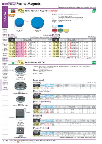 THENUMBERNEXTTOTHELOGOMARKINDICATESITEMSINSTOCKFOREACHBRAND.THICKNESSOUTERDIAMETERMGY-40(ROUNDSHAPE)MGY-44(ROUNDSHAPE/WITHTAP)MGY-20(ROUNDSHAPE/WITHHOLE)MGC-25(POLYGONAL/WITHHOLE)MGC-45(POLYGONAL)THICKNESSWIDTHHOLEDIAMETERLENGTHTHICKNESSOUTERDIAMETERTFP18-1-B(BLUE)TFP30-1-B(BLUE)YELLOWGREENREDWHITEBLUETRUSCOFERRITEPOLYAMIDEMAGNET(ROUNDSHAPE)HIKARIFERRITEMAGNETWITHCAPORDERCODEITEMNO.PRICE(PERBAG)MSRP(PERBAG)SURFACEMAGNETICFLUXDENSITY(T)ADHESIONSTRENGTH(N)LXWXTHICKNESS(MM)HOLEDIAMETER(MM)Q'TYPERBAG(PIECE)SPQ(BAG)WEIGHT(G/BAG)361-2023MGC-25¥296¥3200.143525.5X23X752549CONTACTUS:06-6764-1531HTTP://WWW.OSAKA-HIKARI.CO.JP/ORDERCODEITEMNO.PRICE(PERBAG)MSRP(PERBAG)SURFACEMAGNETICFLUXDENSITY(T)ADHESIONSTRENGTH(N)LXWXTHICKNESS(MM)Q'TYPERBAG(PIECE)SPQ(BAG)WEIGHT(G/BAG)361-2031MGC-45¥370¥4000.134545X30X7.01552361-2040MGC-47¥454¥4900.219442X47X12.215121ORDERCODEITEMNO.PRICE(PERBAG)MSRP(PERBAG)SURFACEMAGNETICFLUXDENSITY(T)ADHESIONSTRENGTH(N)OUTERDIAMETERXTHICKNESS(MM)HOLEDIAMETER(MM)Q'TYPERBAG(PIECE)SPQ(BAG)WEIGHT(G/BAG)361-1973MGY-20¥222¥2400.121120X43.52519361-2015MGY-32¥278¥3000.122032X44.02542361-2007MGY-50¥435¥4700.219450X105.21594ORDERCODEITEMNO.PRICE(PERBAG)MSRP(PERBAG)SURFACEMAGNETICFLUXDENSITY(T)ADHESIONSTRENGTH(N)OUTERDIAMETERXTHICKNESS(MM)APPLICABLESCREWQ'TYPERBAG(PIECE)SPQ(BAG)WEIGHT(G/BAG)361-1990MGY-44¥296¥3200.125144X8M41566ORDERCODEITEMNO.PRICE(PERBAG)MSRP(PERBAG)SURFACEMAGNETICFLUXDENSITY(T)ADHESIONSTRENGTH(N)OUTERDIAMETERXTHICKNESS(MM)Q'TYPERBAG(PIECE)SPQ(BAG)WEIGHT(G/BAG)361-1981MGY-40¥306¥3300.164140X71549ORDERCODEITEMNO.PRICE(PERPIECE)MSRP(PERPIECE)COLORADHESIONSTRENGTH(N)OUTERDIAMETERXTHICKNESS(MM)WEIGHT(G)489-4448TFP18-1-W¥203¥250WHITE619X9.52.4489-4413TFP18-1-B¥203¥250BLUE619X9.52.4489-4430TFP18-1-R¥203¥250RED619X9.52.4489-4421TFP18-1-GN¥203¥250GREEN619X9.52.4489-4456TFP18-1-Y¥203¥250YELLOW619X9.52.4489-4545TFP30-1-W¥340¥420WHITE931X7.54.8489-4511TFP30-1-B¥340¥420BLUE931X7.54.8489-4537TFP30-1-R¥340¥420RED931X7.54.8489-4529TFP30-1-GN¥340¥420GREEN931X7.54.8489-4553TFP30-1-Y¥340¥420YELLOW931X7.54.8STOCK1,144ITEMSSTOCK38,650ITEMSORDERUNIT:1PIECETRUSCONAKAYAMACORPORATIONORDERUNIT:1BAGHIKARICO.LTD.ORDERUNIT:1BAGORDERUNIT:1BAGORDERUNIT:1BAGORDERUNIT:1BAGSPQ:10PIECESFEATURES●EXCELLENTINENVIRONMENTRESISTANCE.●ITISSTRONGAGAINSTWATER.●THEFERRITEMAGNETISCOATEDWITHPOLYAMIDE.USE●FORWHITEBOARDSANDMANAGEMENTBOARDS.MATERIALS●MAGNET:FERRITEMAGNETORIGIN●JAPAN1PIECEFEATURES●DUETOBEINGEQUIPPEDWITHACAP,ADSORPTIONIS3TO11TIMESSTRONGERTHANASINGLEMAGNET.●ROHSCOMPLIANTPRODUCT.USE●FORADSORPTION.MATERIALS●MAGNET:FERRITEMAGNET●CAP:STEELORIGIN●JAPANROUNDSHAPEROUNDSHAPE/WITHTAPROUNDSHAPE/WITHHOLEPOLYGONALPOLYGONAL/WITHHOLEDRAWING.COMORDERCODEITEMNO.PRICE(PERBAG)MSRP(PERBAG)COLORADHESIONSTRENGTH(N)OUTERDIAMETERXTHICKNESS(MM)Q'TYPERBAG(PIECE)WEIGHT(G/BAG)489-4499TFP18-5-W¥859¥1,060WHITE619X9.5512489-4464TFP18-5-B¥859¥1,060BLUE619X9.5512489-4481TFP18-5-R¥859¥1,060RED619X9.5512489-4472TFP18-5-GN¥859¥1,060GREEN619X9.5512489-4502TFP18-5-Y¥859¥1,060YELLOW619X9.5512489-4596TFP30-5-W¥1,442¥1,780WHITE931X7.5524489-4561TFP30-5-B¥1,442¥1,780BLUE931X7.5524489-4588TFP30-5-R¥1,442¥1,780RED931X7.5524489-4570TFP30-5-GN¥1,442¥1,780GREEN931X7.5524489-4600TFP30-5-Y¥1,442¥1,780YELLOW931X7.5524CONTACTUS:0120-509-849HTTP://WWW.ORANGE-BOOK.COM/ORDERUNIT:1BAGSPQ:10BAGS5PIECESMAGNETSMAGNETICSTANDSMAGNETICBASESMAGNETICBLOCKSMAGNETICCHUCKSELECTROMAGNETICHOLDERSMAGNETSHEETSMAGNETICMATERIALSMAGNETICHOLDERSMAGNETHOLDERSFORWELDINGMAGNETHANDSMAGNETCHOOSEARTICLESMAGNETIZINGEQUIPMENTS,DEMAGNETIZINGEQUIPMENTSLIFTINGMAGNETSSTOCK407ITEMSFERRITEMAGNETS1-1168*0109400*1-1168ORDERCODEYELLOW…INSTANTDELIVERY(JAPANONLY)BLUE…BACKORDER(CARRIAGEEXCLUDED)ITEMNO.PINK…STOCKININDONESIA/THAILAND
