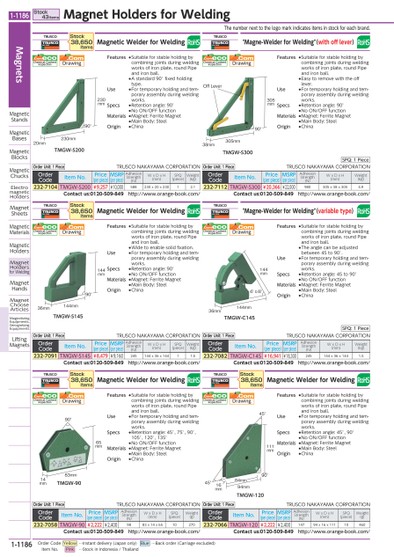 THENUMBERNEXTTOTHELOGOMARKINDICATESITEMSINSTOCKFOREACHBRAND.TMGW-9090°65MM83MM14MM16MMTMGW-12045°45°90°111MM144MMTMGW-C14545°TO90°36MM144MM144MMTMGW-S14590°36MM144MMTMGW-S30090°38MM305MMOFFLEVER230MMTMGW-S20090°230MM20MM305MM84MM94MMTRUSCOMAGNETICWELDERFORWELDINGORDERCODEITEMNO.PRICE(PERPIECE)MSRP(PERPIECE)ADHESIONSTRENGTH(N)WXDXH(MM)SPQ(PIECE)WEIGHT(KG)232-7104TMGW-S200¥9,257¥10,000588230X20X23012.1CONTACTUS:0120-509-849HTTP://WWW.ORANGE-BOOK.COM/TRUSCOMAGNETICWELDERFORWELDINGORDERCODEITEMNO.PRICE(PERPIECE)MSRP(PERPIECE)ADHESIONSTRENGTH(N)WXDXH(MM)SPQ(PIECE)WEIGHT(KG)232-7091TMGW-S145¥8,479¥9,160245144X36X14411.5CONTACTUS:0120-509-849HTTP://WWW.ORANGE-BOOK.COM/TRUSCOMAGNETICWELDERFORWELDINGORDERCODEITEMNO.PRICE(PERPIECE)MSRP(PERPIECE)ADHESIONSTRENGTH(N)WXDXH(MM)SPQ(PIECE)WEIGHT(G)232-7058TMGW-90¥2,222¥2,4009883X14X6510270CONTACTUS:0120-509-849HTTP://WWW.ORANGE-BOOK.COM/STOCK38,650ITEMSSTOCK38,650ITEMSSTOCK38,650ITEMSORDERUNIT:1PIECETRUSCONAKAYAMACORPORATIONORDERUNIT:1PIECETRUSCONAKAYAMACORPORATIONORDERUNIT:1PIECETRUSCONAKAYAMACORPORATIONCHEMICALCONTENTINSPECTION.COMECOFEATURES●SUITABLEFORSTABLEHOLDINGBYCOMBININGJOINTSDURINGWELDINGWORKSOFIRONPLATE,ROUNDPIPEANDIRONBALL.●ASTANDARD90°FIXEDHOLDINGTYPE.USE●FORTEMPORARYHOLDINGANDTEM-PORARYASSEMBLYDURINGWELDINGWORKS.SPECS●RETENTIONANGLE:90°●NOON/OFFFUNCTIONMATERIALS●MAGNET:FERRITEMAGNET●MAINBODY:STEELORIGIN●CHINACHEMICALCONTENTINSPECTION.COMECOFEATURES●SUITABLEFORSTABLEHOLDINGBYCOMBININGJOINTSDURINGWELDINGWORKSOFIRONPLATE,ROUNDPIPEANDIRONBALL.●WIDETOENABLESOLIDFIXATION.USE●FORTEMPORARYHOLDINGANDTEM-PORARYASSEMBLYDURINGWELDINGWORKS.SPECS●RETENTIONANGLE:90°●NOON/OFFFUNCTIONMATERIALS●MAGNET:FERRITEMAGNET●MAINBODY:STEELORIGIN●CHINACHEMICALCONTENTINSPECTION.COMECOFEATURES●SUITABLEFORSTABLEHOLDINGBYCOMBININGJOINTSDURINGWELDINGWORKSOFIRONPLATE,ROUNDPIPEANDIRONBALL.USE●FORTEMPORARYHOLDINGANDTEM-PORARYASSEMBLYDURINGWELDINGWORKS.SPECS●RETENTIONANGLE:45°,75°,90°,105°,120°,135°●NOON/OFFFUNCTIONMATERIALS●MAGNET:FERRITEMAGNET●MAINBODY:STEELORIGIN●CHINADRAWING.COMDRAWING.COMDRAWING.COMTRUSCO"MAGNE-WELDERFORWELDING"(WITHOFFLEVER)ORDERCODEITEMNO.PRICE(PERPIECE)MSRP(PERPIECE)ADHESIONSTRENGTH(N)WXDXH(MM)WEIGHT(KG)232-7112TMGW-S300¥20,366¥22,000980305X38X3054.9CONTACTUS:0120-509-849HTTP://WWW.ORANGE-BOOK.COM/TRUSCO"MAGNE-WELDERFORWELDING"(VARIABLETYPE)ORDERCODEITEMNO.PRICE(PERPIECE)MSRP(PERPIECE)ADHESIONSTRENGTH(N)WXDXH(MM)WEIGHT(KG)232-7082TMGW-C145¥16,941¥18,300245144X36X1441.5CONTACTUS:0120-509-849HTTP://WWW.ORANGE-BOOK.COM/TRUSCOMAGNETICWELDERFORWELDINGORDERCODEITEMNO.PRICE(PERPIECE)MSRP(PERPIECE)ADHESIONSTRENGTH(N)WXDXH(MM)SPQ(PIECE)WEIGHT(G)232-7066TMGW-120¥2,222¥2,40014794X16X11110460CONTACTUS:0120-509-849HTTP://WWW.ORANGE-BOOK.COM/STOCK38,650ITEMSORDERUNIT:1PIECETRUSCONAKAYAMACORPORATIONORDERUNIT:1PIECETRUSCONAKAYAMACORPORATIONORDERUNIT:1PIECETRUSCONAKAYAMACORPORATIONSPQ:1PIECESPQ:1PIECECHEMICALCONTENTINSPECTION.COMECOFEATURES●SUITABLEFORSTABLEHOLDINGBYCOMBININGJOINTSDURINGWELDINGWORKSOFIRONPLATE,ROUNDPIPEANDIRONBALL.●EASYTOREMOVEWITHTHEOFFLEVER.USE●FORTEMPORARYHOLDINGANDTEM-PORARYASSEMBLYDURINGWELDINGWORKS.SPECS●RETENTIONANGLE:90°●NOON/OFFFUNCTIONMATERIALS●MAGNET:FERRITEMAGNET●MAINBODY:STEELORIGIN●CHINACHEMICALCONTENTINSPECTION.COMECOFEATURES●SUITABLEFORSTABLEHOLDINGBYCOMBININGJOINTSDURINGWELDINGWORKSOFIRONPLATE,ROUNDPIPEANDIRONBALL.●THEANGLECANBEADJUSTEDBETWEEN45TO90°.USE●FORTEMPORARYHOLDINGANDTEM-PORARYASSEMBLYDURINGWELDINGWORKS.SPECS●RETENTIONANGLE:45TO90°●NOON/OFFFUNCTIONMATERIALS●MAGNET:FERRITEMAGNET●MAINBODY:STEELORIGIN●CHINACHEMICALCONTENTINSPECTION.COMECOFEATURES●SUITABLEFORSTABLEHOLDINGBYCOMBININGJOINTSDURINGWELDINGWORKSOFIRONPLATE,ROUNDPIPEANDIRONBALL.USE●FORTEMPORARYHOLDINGANDTEM-PORARYASSEMBLYDURINGWELDINGWORKS.SPECS●RETENTIONANGLE:45°,90°●NOON/OFFFUNCTIONMATERIALS●MAGNET:FERRITEMAGNET●MAINBODY:STEELORIGIN●CHINADRAWING.COMDRAWING.COMDRAWING.COMMAGNETSMAGNETICSTANDSMAGNETICBASESMAGNETICBLOCKSMAGNETICCHUCKSELECTROMAGNETICHOLDERSMAGNETSHEETSMAGNETICMATERIALSMAGNETICHOLDERSMAGNETHOLDERSFORWELDINGMAGNETHANDSMAGNETCHOOSEARTICLESMAGNETIZINGEQUIPMENTS,DEMAGNETIZINGEQUIPMENTSLIFTINGMAGNETSSTOCK43ITEMSMAGNETHOLDERSFORWELDING1-1186*0109430*1-1186ORDERCODEYELLOW…INSTANTDELIVERY(JAPANONLY)BLUE…BACKORDER(CARRIAGEEXCLUDED)ITEMNO.PINK…STOCKININDONESIA/THAILAND