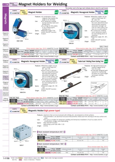 THENUMBERNEXTTOTHELOGOMARKINDICATESITEMSINSTOCKFOREACHBRAND.112MMKM-SA112MM94MMKM-12W55MM50MM117MM60MM60MM30MMKM-S1AGS-1GS-2HEIGHTTOTALLENGTHWIDTHEXAMPLE44MM66MM50MMWK-PKANETECMAGNETHOLDERORDERCODEITEMNO.PRICE(PERPIECE)MSRP(PERPIECE)ADHESIONSTRENGTH(N)WXDXH(MM)SPQ(PIECE)WEIGHT(KG)321-0081KM-12W¥85,752¥79,400130050X117X5514.5CONTACTUS:03-5823-7014HTTP://WWW.KANETEC.CO.JP/STOCK220ITEMSORDERUNIT:1PIECE(PRICEREVISIONDATE:SEP,2015)KANETECCO.LTD.KANETECMAGNETICHOLDER(HIGHPOWERTYPE)ORDERCODEITEMNO.PRICE(PERPIECE)MSRP(PERPIECE)ADHESIONSTRENGTH(N)WXDXH(MM)SPQ(PIECE)WEIGHT(G)406-4381WK-TP¥14,040¥13,000100050X66X441750CONTACTUS:03-5823-7014HTTP://WWW.KANETEC.CO.JP/ORDERCODEITEMNO.PRICE(PERPIECE)MSRP(PERPIECE)ADHESIONSTRENGTH(N)WXDXH(MM)SPQ(PIECE)WEIGHT(G)288-3317WK-P¥5,346¥4,950100050X66X441750KANETECMAGNETICHEXAGONALHOLDERREPAIRINGOKORDERCODEITEMNO.PRICE(PERPIECE)MSRP(PERPIECE)ROUNDSTEELADHESIONSTRENGTH(N)WXDXH(MM)SPQ(PIECE)WEIGHT(G)164-4491KM-S1A¥31,536¥29,200200TO30060X30X601850CONTACTUS:03-5823-7014HTTP://WWW.KANETEC.CO.JP/STOCK220ITEMSORDERUNIT:1PIECE(PRICEREVISIONDATE:SEP,2015)KANETECCO.LTD.ORDERUNIT:1PIECE(PRICEREVISIONDATE:SEP,2015)KANETECCO.LTD.ORDERUNIT:1PIECE(PRICEREVISIONDATE:SEP,2015)FEATURES●ACOMBINATIONOFTWOMAGNETSTHATENABLESTHEANGLETOBESETFREELY.USE●FORTEMPORARYHOLDINGDURINGASSEMBLYTASKSANDDRILLINGWORK.●ASAHINGEFORTHINPLATESORASASIMPLEJIGFORWELDINGWORK.SPECS●RETENTIONANGLE:FREE●WITHON/OFFFUNCTIONORIGIN●JAPANFEATURES●SECTIONSTHATCANBEPROCESSEDWITHDRILLING,ETC.AREPREPAREDONTHREESURFACES.●THEPERIMETERISANALUMINUMSTRUCTURETHATPREVENTSMETALDUSTFROMSTICKINGTOTHETOPSURFACEANDSIDES.USE●FORUSEASAHOLDERFORTEMPORARYWELDINGANDTEMPORARYINSTALLATIONOFSUCHASPIPESANDFORCONSTRUCTION,BRIDGES,ANDSHIPBUILDING.SPECS●NOON/OFFFUNCTION●MOUNTINGSCREWHOLE:M8X1.25ORIGIN●CHINAHEATRESISTANTTEMPERATURE60°CHEATRESISTANTTEMPERATURE180°CFEATURES●RETENTIONANGLESCANBEUSEDINTHREEWAYS45°,90°AND135°.●SINCEITHASAVGROOVE,THEWORKATTACHMENTFACEDEMONSTRATESPOWERFULADSORPTIONSTRENGTHNOTONLYONAFLATSURFACE,BUTALSOONACURVEDSURFACE.USE●FORTEMPORARYWELDINGWORK,TEMPORARYASSEM-BLYANDHOLDINGDOWNOFASSEMBLY.SPECS●RETENTIONANGLE:45°,90°,135°●WITHON/OFFFUNCTIONORIGIN●JAPANKANETECMAGNETICHEXAGONALHOLDERREPAIRINGOKORDERCODEITEMNO.PRICE(PERPIECE)MSRP(PERPIECE)ROUNDSTEELADHESIONSTRENGTH(N)WXDXH(MM)WEIGHT(KG)164-4483KM-SA¥94,284¥87,300600TO900112X94X1126CONTACTUS:03-5823-7014HTTP://WWW.KANETEC.CO.JP/ORDERUNIT:1PIECE(PRICEREVISIONDATE:SEP,2015)KANETECCO.LTD.CONTACTUS:03-5823-7014HTTP://WWW.KANETEC.CO.JP/KANETEC"GUIDESCALE"WELDINGFLAMEGUIDINGTOOLORDERCODEITEMNO.PRICE(PERPIECE)MSRP(PERPIECE)ADHESIONSTRENGTH(N)WXH(MM)TOTALLENGTH(MM)SPQ(PIECE)WEIGHT(KG)406-3309GS-1¥20,520¥19,00020025X2550011.1406-3317GS-2¥28,296¥26,20080025X2540012.3STOCK220ITEMSORDERUNIT:1PIECE(PRICEREVISIONDATE:SEP,2015)KANETECCO.LTD.SPQ:1PIECEFEATURES●RETENTIONANGLESCANBEUSEDINTHREEWAYS45°,90°AND135°.●SINCEITHASAVGROOVE,THEWORKATTACHMENTFACEDEMONSTRATESPOWERFULADSORPTIONSTRENGTHNOTONLYONAFLATSURFACE,BUTALSOONACURVEDSURFACE.USE●FORTEMPORARYWELDINGWORK,TEMPORARYASSEM-BLYANDHOLDINGDOWNOFASSEMBLY.SPECS●RETENTIONANGLE:45°,90°,135°●WITHON/OFFFUNCTIONORIGIN●JAPANFEATURES●AHIGH-PERFORMANCEPER-MANENTMAGNETFIRMLYFIXESTHESCALE.USE●ASPECIALLYDESIGNEDGUID-INGTOOLFORMAINTAININGTHEFLAMEATAFIXEDHEIGHTDURINGGASWELDING.ORIGIN●CHINAMAGNETSMAGNETICSTANDSMAGNETICBASESMAGNETICBLOCKSMAGNETICCHUCKSELECTROMAGNETICHOLDERSMAGNETSHEETSMAGNETICMATERIALSMAGNETICHOLDERSMAGNETHOLDERSFORWELDINGMAGNETHANDSMAGNETCHOOSEARTICLESMAGNETIZINGEQUIPMENTS,DEMAGNETIZINGEQUIPMENTSLIFTINGMAGNETSSTOCK43ITEMSMAGNETHOLDERSFORWELDING1-1190*0109471*1-1190ORDERCODEYELLOW…INSTANTDELIVERY(JAPANONLY)BLUE…BACKORDER(CARRIAGEEXCLUDED)ITEMNO.PINK…STOCKININDONESIA/THAILAND