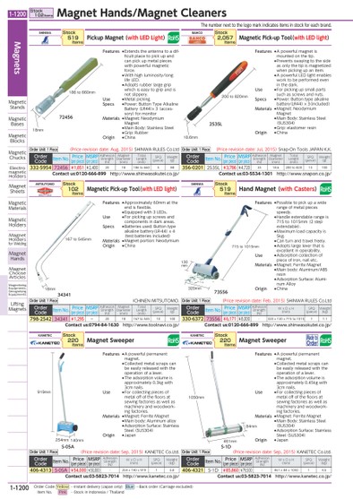 THENUMBERNEXTTOTHELOGOMARKINDICATESITEMSINSTOCKFOREACHBRAND.7245618MM186TO660MM18.6MM200TO820MM2535L73556715TO1015MM130MM320MMS-05A919MM140MM254MMS-1D461MM84MM1050MM18MM167TO545MM34341SHINWAPICKUPMAGNET(WITHLEDLIGHT)ORDERCODEITEMNO.PRICE(PERPIECE)MSRP(PERPIECE)ADHESIONSTRENGTH(N)MAGNETDIAMETER(MM)TOTALLENGTH(MM)SPQ(PIECE)WEIGHT(G)332-595472456¥1,851¥2,4002018186TO660588CONTACTUS:0120-666-899HTTP://WWW.SHINWASOKUTEI.CO.JP/KANETECMAGNETSWEEPERORDERCODEITEMNO.PRICE(PERPIECE)MSRP(PERPIECE)ADHESIONSTRENGTH(N)WXDXH(MM)SPQ(PIECE)WEIGHT(KG)406-4313S-05A¥54,000¥50,000-254X140X91913.8CONTACTUS:03-5823-7014HTTP://WWW.KANETEC.CO.JP/MITSUTOMOMAGNETICPICK-UPTOOL(WITHLEDLIGHT)ORDERCODEITEMNO.PRICE(PERPIECE)MSRP(PERPIECE)ADHESIONSTRENGTH(N)MAGNETDIAMETER(MM)TOTALLENGTH(MM)SPQ(PIECE)WEIGHT(G)798-254234341¥1,295-2018167TO54510100CONTACTUS:0794-84-1630HTTP://WWW.TOOLNAVI.CO.JP/STOCK102ITEMSSTOCK220ITEMSSTOCK519ITEMSORDERUNIT:1PIECEICHINENMITSUTOMO.ORDERUNIT:1PIECE(PRICEREVISIONDATE:SEP,2015)KANETECCO.LTD.ORDERUNIT:1PIECE(PRICEREVISIONDATE:AUG,2015)SHINWARULESCO.LTDFEATURES●EXTENDSTHEANTENNATOADIF-FICULTPLACETOPICKUPANDCANPICKUPMETALPIECESWITHPOWERFULMAGNETICFORCE.●WITHHIGHLUMINOSITY/LONGLIFELED.●ADOPTSRUBBERLARGEGRIPWHICHISEASYTOGRIPANDISNOTSLIPPERY.USE●METALPICKING.SPECS●POWER:BUTTONTYPEALKALINEBATTERY(LR44)X3(ACCES-SORY)FORMONITORMATERIALS●MAGNET:NEODYMIUMMAGNET●MAINBODY:STAINLESSSTEEL●GRIP:RUBBERORIGIN●CHINAFEATURES●APOWERFULPERMANENTMAGNET.●COLLECTEDMETALSCRAPSCANBEEASILYRELEASEDWITHTHEOPERATIONOFALEVER.●THEADSORPTIONVOLUMEISAPPROXIMATELY0.3KGWITH3CMNAILS.USE●FORCOLLECTINGPIECESOFMETALOFFOFTHEFLOORSATSEWINGFACTORIESASWELLASMACHINERYANDWOODWORK-INGFACTORIES.MATERIALS●MAGNET:FERRITEMAGNET●MAINBODY:ALUMINUMALLOY●ADSORPTIONSURFACE:STAINLESSSTEEL(SUS304)ORIGIN●JAPANFEATURES●APPROXIMATELY60MMATTHEENDISFLEXIBLE.●EQUIPPEDWITH3LEDS.USE●FORPICKINGUPSCREWSANDCOMPONENTSINDARKAREAS.SPECS●BATTERIESUSED:BUTTONTYPEALKALINEBATTERY(LR-44)X4(TESTBATTERIESINCLUDED)MATERIALS●MAGNETPORTION:NEODYMIUMORIGIN●CHINAKANETECMAGNETSWEEPERMADETOORDERORDERCODEITEMNO.PRICE(PERPIECE)MSRP(PERPIECE)ADHESIONSTRENGTH(N)WXDXH(MM)SPQ(PIECE)WEIGHT(KG)406-4321S-1D¥85,860¥79,500-461X84X105014.5CONTACTUS:03-5823-7014HTTP://WWW.KANETEC.CO.JP/SHINWAHANDMAGNET(WITHCASTERS)ORDERCODEITEMNO.PRICE(PERPIECE)MSRP(PERPIECE)ADHESIONSTRENGTH(N)WXDXH(MM)SPQ(PIECE)WEIGHT(KG)330-637273556¥6,171¥8,000-320X130X715TO101511.1CONTACTUS:0120-666-899HTTP://WWW.SHINWASOKUTEI.CO.JP/BAHCOMAGNETICPICK-UPTOOL(WITHLEDLIGHT)ORDERCODEITEMNO.PRICE(PERPIECE)MSRP(PERPIECE)ADHESIONSTRENGTH(N)MAGNETDIAMETER(MM)TOTALLENGTH(MM)SPQ(PIECE)WEIGHT(G)356-02012535L¥3,786¥4,7203318.6200TO82012100CONTACTUS:03-5534-1301HTTP://WWW.SNAPON.CO.JP/STOCK2,057ITEMSSTOCK519ITEMSSTOCK220ITEMSORDERUNIT:1PIECE(PRICEREVISIONDATE:JUL,2015)SNAP-ONTOOLSJAPANK.K.ORDERUNIT:1PIECE(PRICEREVISIONDATE:FEB,2015)SHINWARULESCO.LTDORDERUNIT:1PIECE(PRICEREVISIONDATE:SEP,2015)KANETECCO.LTD.FEATURES●APOWERFULPERMANENTMAGNET.●COLLECTEDMETALSCRAPSCANBEEASILYRELEASEDWITHTHEOPERATIONOFALEVER.●THEADSORPTIONVOLUMEISAPPROXIMATELY0.45KGWITH3CMNAILS.USE●FORCOLLECTINGPIECESOFMETALOFFOFTHEFLOORSATSEWINGFACTORIESASWELLASMACHINERYANDWOODWORK-INGFACTORIES.MATERIALS●MAGNET:FERRITEMAGNET●MAINBODY:STAINLESSSTEEL(SUS304)●ADSORPTIONSURFACE:STAINLESSSTEEL(SUS304)ORIGIN●JAPANFEATURES●POSSIBLETOPICKUPAWIDERANGEOFMETALPIECESSPEEDY.●HANDLEEXTENDABLERANGEIS715TO1015MM(2STEPEXTENDABLE).●MAXIMUMLOADCAPACITYIS5KG.●CANTURNANDTRAVELFREELY.●ADOPTSLARGELEVERTHATISEXCELLENTINOPERABILITY.USE●ADSORPTIONCOLLECTIONOFPIECEOFIRON,NAILETC.MATERIALS●MAGNET:FERRITEMAGNET●MAINBODY:ALUMINUM/ABSRESIN●ADSORPTIONSURFACE:ALUMI-NUMALLOYORIGIN●CHINAFEATURES●APOWERFULMAGNETISMOUNTEDONTHETIP.●PREVENTSSWAYINGTOTHESIDEASONLYTHETIPISMAGNETIZEDWHENPICKINGUPANITEM.●APOWERFULLEDLIGHTENABLESWORKTOBEPERFORMEDEVENINTHEDARK.USE●FORPICKINGUPSMALLPARTSSUCHASSCREWSANDNUTS.SPECS●POWER:BUTTONTYPEALKALINEBATTERY(LR44)X3(INCLUDED)MATERIALS●MAGNET:NEODYMIUMMAGNET●MAINBODY:STAINLESSSTEEL(SUS304)●GRIP:ELASTOMERRESINORIGIN●CHINAMAGNETSMAGNETICSTANDSMAGNETICBASESMAGNETICBLOCKSMAGNETICCHUCKSELECTROMAGNETICHOLDERSMAGNETSHEETSMAGNETICMATERIALSMAGNETICHOLDERSMAGNETHOLDERSFORWELDINGMAGNETHANDSMAGNETCHOOSEARTICLESMAGNETIZINGEQUIPMENTS,DEMAGNETIZINGEQUIPMENTSLIFTINGMAGNETSSTOCK102ITEMSMAGNETHANDS/MAGNETCLEANERS1-1200*0109550*1-1200ORDERCODEYELLOW…INSTANTDELIVERY(JAPANONLY)BLUE…BACKORDER(CARRIAGEEXCLUDED)ITEMNO.PINK…STOCKININDONESIA/THAILAND