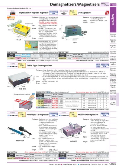 PRICESDISPLAYEDINCLUDE8%TAX.DEMAGNETIZATIONMETHODKMD-20CHEIGHTDEPTHWIDTHKMDP-16A30MM264MM199MM116MM200MMKMDM-20TR-MT115MM50MM73MMINSERTIONHOLE120MM204MM254MMRD-1*WHENMAGNETIZING,PLACETHESUBJECTOFMAGNETIZATIONINTOTHEHOLEANDPRESSTHEBUTTONONCE.WHENDEMAGNETIZING,PLACETHESUBJECTOFDEMAGNETIZATIONINTOTHEHOLEANDSLOWLYREMOVEITWHILEHOLDINGDOWNTHEPUSHBUTTON.EXAMPLETRUSCOMAGNETIZATION/DE-MAGNETIZER"MAGNETOUCH"REPAIRINGOKORDERCODEITEMNO.PRICE(PERPIECE)MSRP(PERPIECE)POWER(V)USAGERATE(%)WXDXH(MM)SPQ(PIECE)WEIGHT(KG)★406-3686KMD-2A¥336,960¥312,000THREEPHASE200(50/60HZ)100453X245X140130107-7368KMD-15C¥64,044¥59,300SINGLE-PHASE100(50/60HZ)100150X120X8015107-7376KMD-20C¥84,240¥78,000100200X120X8017406-3694KMD-30C¥272,160¥252,000SINGLEPHASE200(50/60HZ),SINGLEPHASE220(60HZ)100300X200X120119107-7384KMD-40C¥459,000¥425,000100400X200X120129★406-3708KMD-50C¥543,240¥503,000100500X200X120137CONTACTUS:03-5823-7014HTTP://WWW.KANETEC.CO.JP/KANETECPEN-SHAPEDDE-MAGNETIZERREPAIRINGOKORDERCODEITEMNO.PRICE(PERPIECE)MSRP(PERPIECE)BATTERYRATEDDIAMETERXTOTALLENGTH(MM)WEIGHT(KG)406-3724KMDP-16A¥91,800¥85,0002.4V2000MAH30X2640.3CONTACTUS:03-5823-7014HTTP://WWW.KANETEC.CO.JP/STOCK220ITEMSORDERUNIT:1PIECE(PRICEREVISIONDATE:SEP,2015)KANETECCO.LTD.ORDERUNIT:1PIECEBLUEFACTORYDIRECTNOFREIGHTCHARGE(PRICEREVISIONDATE:SEP,2015)KANETECCO.LTD.SPQ:1PIECEKANETECTABLETYPEDE-MAGNETIZERMADETOORDERREPAIRINGOKSTOCK220ITEMSORDERUNIT:1PIECETRUSCONAKAYAMACORPORATIONORDERCODEITEMNO.PRICE(PERPIECE)MSRP(PERPIECE)POWER(V)USAGERATE(%)WXDXH(MM)SPQ(PIECE)WEIGHT(G)229-6217TR-MT¥7,683¥8,300SINGLEPHASE100-115X73X501450CONTACTUS:0120-509-849HTTP://WWW.ORANGE-BOOK.COM/DRAWING.COMFEATURES●OPTIMUMFORMAGNETIZINGANDDEMAGNETIZINGTOROD-SHAPEDMETALSUCHASASCREWDRIVER.●POSSIBLETOEASILYMAGNETIZE/DEMAGNETIZEWITHONEBUTTON.USE●FORTHEDETACHABLEMAGNETOFTHETOOL.SPECS●POWERCORDLENGTH:1.5M●INSERTIONHOLE:INNERDIAME-TER15XDEPTH50MM●ADSORPTIONSTRENGTH:0.17N*STEELMATERIAL(S-C)WHENUSINGAΦ6MMSCREWDRIVER.ORIGIN●JAPANFEATURES●BATTERY-DRIVENTIMEHASBEENIMPROVEDBYAPPROXIMATELY3TIMESCOMPAREDWITHEXISTINGITEMS.●EVENIFTHEBATTERYRUNSOUT,ITCANBEUSEDWITHTHEACADAPTERWITHOUTWAITINGFORCHARGING.●ANECOCOMMODITYUSINGANICKEL-METAL-HYDRIDEBATTERYTHATISFRIENDLYTOTHEENVIRONMENT.USE●FORDEMAGNETIZATIONOFBLADEINMACHINETOOL,PUNCHPARTOFPRESSMOLD,TIPOFGUIDEPIN,ETC.INNARROWSPOTANDSECTION.SPECS●ACADAPTERCORDLENGTH:1.9MORIGIN●JAPANFEATURES●HEATDISSIPATIONEFFECTISGOOD,WITHSTANDSCONTINUOUSENERGIZATION.●APOWERFULTYPETHATDEMONSTRATESHIGHDEMAGNETIZATIONEFFECTEVENFORSTEELWHICHISDIFFICULTTODEMAGNETIZEWITHHIGHMAGNETICFORCEBECAUSEOFPROPERTIESCLOSETOMAGNETICSTEELSUCHASHIGH-SPEEDSTEEL,BEARINGSTEEL,NICKEL-CHROMESTEEL,SPRINGSTEEL,DIESSTEEL.USE●ADEVICETHATGENERATESANALTERNATINGMAGNETICFIELDONTHESURFACEBYALTERNATINGCURRENTPOWERSUP-PLYANDREMOVESTHESURFACERESIDUALMAGNETISMOFTHEWORKBYLETTINGITPASSTHROUGHTHEMAGNETICFIELD.SPECS●POWERCORDLENGTH:2MORIGIN●JAPANRIKENKEISOKUKIDEMAGNETIZERSTOCK14ITEMSORDERCODEITEMNO.PRICE(PERPIECE)MSRP(PERPIECE)POWER(V)USAGERATE(%)SPQ(PIECE)WEIGHT(KG)★485-9189KMDM-20¥166,320¥154,000SINGLEPHASEAC10010017CONTACTUS:03-5823-7014HTTP://WWW.KANETEC.CO.JP/KANETECMOBILEDEMAGNETIZERREPAIRINGOKSTOCK220ITEMSORDERUNIT:1PIECE(PRICEREVISIONDATE:SEP,2015)KANETECCO.LTD.ORDERUNIT:1PIECERIKENKEISOKUKIMFG.CO.LTDORDERCODEITEMNO.PRICE(PERPIECE)MSRP(PERPIECE)POWER(V)WXDXH(MM)SPQ(PIECE)WEIGHT(KG)833-8776RD-1¥42,120¥52,000SINGLEPHASE100254X204X12019CONTACTUS:025-794-2401HTTP://E-RIKEN.COM/FEATURES●FORDEMAGNETIZATIONOFRESIDUALMAGNETISM.SPECS●POWERCORDLENGTH:1.8MORIGIN●JAPANFEATURES●DEMAGNETIZATIONOFANENTIRESTEELPLATEISPOSSIBLEASTHEDEMAGNETIZERISMOVEDWITHTHISTYPE.●ITCANBEMOVEDSMOOTHLYONASTEELPLATEASITISEQUIPPEDWITHWHEELSANDAHANDLE.USE●FORDEMAGNETIZATIONOFLARGESTEELPLATES,ETC.FORWORKTHATISDIFFICULTTOMOVE.SPECS●POWERSUPPLYCAPACITY:300VA(50HZ)/250VA(60HZ)●POWERCORDLENGTH:2MORIGIN●JAPANMAGNETSMAGNETICSTANDSMAGNETICBASESMAGNETICBLOCKSMAGNETICCHUCKSELECTROMAGNETICHOLDERSMAGNETSHEETSMAGNETICMATERIALSMAGNETICHOLDERSMAGNETHOLDERSFORWELDINGMAGNETHANDSMAGNETCHOOSEARTICLESMAGNETIZINGEQUIPMENTS,DEMAGNETIZINGEQUIPMENTSLIFTINGMAGNETSDEMAGNETIZERS/MAGNETIZERSSTOCK17ITEMS1-1209*0109631*1-1209DELIVERYESTIMATE★…MANUFACTURERSTOCK★…DELIVERYWITHIN7WORKINGDAYS★…ASK