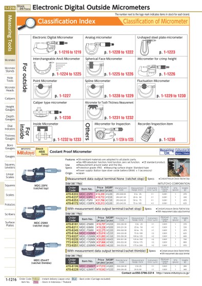 THENUMBERNEXTTOTHELOGOMARKINDICATESITEMSINSTOCKFOREACHBRAND.FOROUTSIDEFORINSIDEOTHERSCLASSIFICATIONOFMICROMETERCLASSIFICATIONINDEXMICROMETERFORINSPECTIONRECORDER/INSPECTIONITEMU-SHAPEDSTEELPLATEMICROMETERFLUCTUATIONMICROMETERMICROMETERFORCRIMPHEIGHTMEASUREMENTOFNARROWGROOVEDIAMETERTIPSHAPEFLUCTUATIONMICROMETERSPHERICALFACEMICROMETERMICROMETERFORTOOTHTHICKNESSMEASUREMENTANALOGMICROMETERSPLINEMICROMETERMEASUREWALLTHICKNESS/CURVEDSURFACEOFPIPESPHERICALFACEMICROMETERTIPSHAPEELECTRONICDIGITALMICROMETERPOINTMICROMETERINSIDEMICROMETERINTERCHANGEABLEANVILMICROMETERCALIPERTYPEMICROMETERP.1-1220TO1222P.1-1225TO1226P.1-1228TO1229P.1-1231TO1232P.1-1234TO1235P.1-1223P.1-1226P.1-1229TO1230P.1-1236P.1-1216TO1219P.1-1224TO1225P.1-1227P.1-1230P.1-1232TO1233EXAMPLEMDC-25PX(RATCHETTOP)MDC-25MX(RATCHETSTOP)MDC-25MXT(RATCHETTHIMBLE)ORDERCODEITEMNO.PRICE(PERPIECE)MSRP(PERPIECE)MANUFACTURERCODEMEASUREMENTRANGE(MM)INSTRUMENTERROR(ΜM)MINIMUMDISPLAY(MM)SPQ(PIECE)WEIGHT(G)470-8199MDC-25MXT¥17,010¥16,800293-234-300TO25±10.0011280470-8229MDC-50MXT¥19,542¥19,300293-235-3025TO50±10.0011340CONTACTUS:050-3786-3214HTTP://WWW.MITUTOYO.CO.JP/ORDERCODEITEMNO.PRICE(PERPIECE)MSRP(PERPIECE)MANUFACTURERCODEMEASUREMENTRANGE(MM)INSTRUMENTERROR(ΜM)MINIMUMDISPLAY(MM)SPQ(PIECE)WEIGHT(G)470-8181MDC-25MX¥16,707¥16,500293-230-300TO25±10.0011270470-8211MDC-50MX¥19,238¥19,000293-231-3025TO50±10.0011330470-8245MDC-75MX¥22,275¥22,000293-232-3050TO75±10.0011470470-8164MDC-100MX¥25,818¥25,500293-233-3075TO100±20.0011625772-9227MDC-125MX¥31,893¥31,500293-250-30100TO125±20.0011600772-9235MDC-150MX¥34,830¥34,400293-251-30125TO150±20.0011740772-9243MDC-175MX¥37,868¥37,400293-252-30150TO175±20.0011800772-9251MDC-200MX¥40,803¥40,300293-253-30175TO200±20.0011970ORDERCODEITEMNO.PRICE(PERPIECE)MSRP(PERPIECE)MANUFACTURERCODEMEASUREMENTRANGE(MM)INSTRUMENTERROR(ΜM)MINIMUMDISPLAY(MM)SPQ(PIECE)WEIGHT(G)470-8202MDC-25PX¥16,200¥16,000293-240-300TO25±10.0011270470-8237MDC-50PX¥18,732¥18,500293-241-3025TO50±10.0011330470-8253MDC-75PX¥21,768¥21,500293-242-3050TO75±10.0011470470-8172MDC-100PX¥25,313¥25,000293-243-3075TO100±20.0011625ORDERUNIT:1PIECEMITUTOYOCORPORATIONORDERUNIT:1PIECEORDERUNIT:1PIECEMITUTOYOCOOLANTPROOFMICROMETERREPAIRINGOKCALIBURATIONOKSTOCK466ITEMSSPECS●CONSTANTPRESSUREDEVICE:RATCHETSTOPMEASUREMENTDATAOUTPUTTERMINALNONE(RATCHETSTOP)SPECS●CONSTANTPRESSUREDEVICE:RATCHETSTOP●WITHMEASUREMENTDATAOUTPUTTERMINALWITHMEASUREMENTDATAOUTPUTTERMINAL(RACHETSTOP)SPECS●CONSTANTPRESSUREDEVICE:RATCHETTHIMBLE●WITHMEASUREMENTDATAOUTPUTTERMINALWITHMEASUREMENTDATAOUTPUTTERMINAL(RACHETTHIMBLE)FEATURES●OIL-RESISTANTMATERIALSAREADOPTEDTOALLPLASTICPARTS.●HASABS(ABSOLUTE)FUNCTION,HOLDFUNCTION,ZEROSETFUNCTION.●CESTANDARDPRODUCT.USE●MEASUREMENTAROUNDWATERANDTHELIKE.SPECS●PROTECTIONGRADE:IP65●MEASURINGSURFACESHAPE:STANDARDTYPE●POWERSUPPLY:BUTTONTYPESILVEROXIDEBATTERY(SR44)X1(ACCESSORY)ORIGIN●JAPANAPPROX.2WEEKSMEASURINGTOOLSMICROMETERSMICROMETERSTANDSHOLETESTSMICROMETERHEADSCALIPERSHEIGHTGAUGESDEPTHGAUGESDIALINDICATORSTHICKNESSGAUGESBOREGAUGESGAUGESSQUARES,LEVELERSLINEARSCALESSQUARESSCALESPROTRACTORSSCRIBERSSURFACEPLATESSTOCK267ITEMSELECTRONICDIGITALOUTSIDEMICROMETERS1-1216*0109700*1-1216ORDERCODEYELLOW…INSTANTDELIVERY(JAPANONLY)BLUE…BACKORDER(CARRIAGEEXCLUDED)ITEMNO.PINK…STOCKININDONESIA/THAILAND