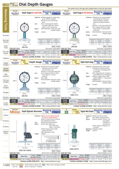 THENUMBERNEXTTOTHELOGOMARKINDICATESITEMSINSTOCKFOREACHBRAND.DM-22075MM120MMRODDM-264104MM50MMRODACCESSORYRODFORREPLACEMENTDM-25298MM50MMROD101.6MM151.9MMDMC100-150MXROD86MM60MMDMD-25STGROD75MM116MMDMD-210JINSTRUMENTERROR(MM)MINIMUMDISPLAY(MM)BASEDIMENSION(MM)±0.0150.0175INSTRUMENTERROR(MM)MINIMUMDISPLAY(MM)BASEDIMENSION(MM)±0.010.0150INSTRUMENTERROR(MM)MINIMUMDISPLAY(MM)BASEDIMENSION(MM)±0.010.0150INSTRUMENTERROR(MM)MINIMUMDISPLAY(MM)BASEDIMENSION(MM)-0.0175INSTRUMENTERROR(MM)MINIMUMDISPLAY(MM)BASEDIMENSION(MM)±0.030.001101.6INSTRUMENTERROR(MM)MINIMUMDISPLAY(MM)BASEDIMENSION(MM)±0.030.0160TECLOCKDEPTHGAUGE(FORSMALLHOLE)REPAIRINGOKCALIBURATIONOKORDERCODEITEMNO.PRICE(PERPIECE)MSRP(PERPIECE)MANUFACTURERCODEMEASUREMENTRANGE(MM)TOTALLENGTH(MM)WEIGHT(G)331-0981DM-220¥17,213¥17,000-0TO20120300CONTACTUS:0266-22-5920HTTP://WWW.TECLOCK.CO.JP/TECLOCKDEPTHGAUGEREPAIRINGOKCALIBURATIONOKORDERCODEITEMNO.PRICE(PERPIECE)MSRP(PERPIECE)MANUFACTURERCODEMEASUREMENTRANGE(MM)TOTALLENGTH(MM)WEIGHT(G)331-0990DM-252¥22,275¥22,000-CONCAVE0TO5/CONVEX0TO498230CONTACTUS:0266-22-5920HTTP://WWW.TECLOCK.CO.JP/MITUTOYODEPTHDIGIMATICMICROMETERREPAIRINGOKCALIBURATIONOKORDERCODEITEMNO.PRICE(PERPIECE)MSRP(PERPIECE)MANUFACTURERCODEMEASUREMENTRANGE(MM)TOTALLENGTH(MM)WEIGHT(G)772-9154DMC100-150MX¥36,957¥36,500329-250-300TO150151.9540CONTACTUS:050-3786-3214HTTP://WWW.MITUTOYO.CO.JP/STOCK81ITEMSORDERUNIT:1PIECEMITUTOYOCORPORATIONORDERUNIT:1PIECETECLOCKCORPORATIONORDERUNIT:1PIECETECLOCKCORPORATIONSPQ:1PIECESPQ:1PIECESPQ:1PIECEFEATURES●DEPTHGAUGEFORMEASURINGUPTO20MMOFDEPTH.●PROBEISASKQUENCHINGITEM.USE●FORMEASURINGTHEDEPTHANDLEVELDIFFERENCEOFTHEOBJECTTOBEMEASURED.SPECS●RODDIAMETER:HEADΦ0.3MM(NEEDLESHAPE)ORIGIN●JAPANFEATURES●OPTIMUMFORGROOVEDEPTHMEASUREMENTOFPRINTEDCIRCUITBOARDS,ETC.●PROBEISASKQUENCHINGITEM.USE●FORMEASUREMENTOFSMALLHOLEDEPTHORUNEVENSURFACES.SPECS●FORSTEP●RODDIAMETER:HEADΦ0.12MM(NEEDLESHAPE)ORIGIN●JAPANFEATURES●RODSCANBEREPLACED(WITH6RODSFORREPLACEMENT).●WITHCONSTANTPRESSUREDEVICE.●CESTANDARDPRODUCT.USE●EXTENSIVEMEASUREMENT.SPECS●POWERSUPPLY:BUTTONTYPESILVEROXIDEBATTERY(SR44)X1(ACCESSORY)●WITHMEASUREMENTDATAOUTPUTTERMINAL●RODDIAMETER:4MMORIGIN●JAPANAPPROX.2WEEKSAPPROX.2WEEKSAPPROX.2WEEKSAPPROX.2WEEKSTECLOCKDEPTHGAUGE(FORFILMTHICKNESS)REPAIRINGOKCALIBURATIONOKORDERCODEITEMNO.PRICE(PERPIECE)MSRP(PERPIECE)MANUFACTURERCODEMEASUREMENTRANGE(MM)TOTALLENGTH(MM)WEIGHT(G)331-1007DM-264¥16,511¥16,310-0TO5104230CONTACTUS:0266-22-5920HTTP://WWW.TECLOCK.CO.JP/TECLOCKDIGITALDEPTHGAUGEREPAIRINGOKCALIBURATIONOKCONTACTUS:0266-22-5920HTTP://WWW.TECLOCK.CO.JP/SKDIGITALMINIDEPTHREPAIRINGOKCALIBURATIONOKORDERCODEITEMNO.PRICE(PERPIECE)MSRP(PERPIECE)MANUFACTURERCODEMEASUREMENTRANGE(MM)TOTALLENGTH(MM)WEIGHT(G)758-4679DMD-25STG¥10,584¥9,8001511940TO2586152CONTACTUS:0256-31-5660HTTP://WWW.SOKUTEIKOUGU.COM/ORDERCODEITEMNO.PRICE(PERPIECE)MSRP(PERPIECE)MANUFACTURERCODEMEASUREMENTRANGE(MM)TOTALLENGTH(MM)WEIGHT(G)795-5081DMD-210J¥32,562¥30,150-12116310STOCK1,103ITEMSSTOCK81ITEMSORDERUNIT:1PIECENIIGATASEIKICO.LTD.ORDERUNIT:1PIECETECLOCKCORPORATIONORDERUNIT:1PIECETECLOCKCORPORATIONSPQ:1PIECESPQ:1PIECESPQ:1PIECEFEATURES●OPTIMUMFORMEASUREMENTOFPAINTINGFILMTHICKNESSABOUTPAINTING,COATINGMATERIAL,SEALINGMATERIAL,ETC.●PROBEISASKQUENCHINGITEM.USE●FORMEASUREMENTOFSMALLHOLEDEPTHORPAINTINGFILMTHICKNESS.SPECS●RODDIAMETER:HEADΦ0.3MM(NEEDLESHAPE)ORIGIN●JAPANFEATURES●NEEDLE-SHAPEPROBETYPE●USINGTHEPRESETFUNCTION,CONNECTIONOFADDINGPARTSISPOSSIBLE.USE●FORMEASUREMENTOFDEPTHORSTEPDIFFERENCEOFWORKPIECES.SPECS●POWERSUPPLY:SILVEROXIDEBATTERY(SR44)X1(ACCESSORY)●DIGITALTYPE●RODDIAMETER:HEADΦ0.3MM(NEEDLESHAPE)ORIGIN●JAPANFEATURES●HEADΦ1.5MMPROBEUSE●FORDEPTHMEASUREMENT.SPECS●POWERSUPPLY:LITHIUMCOINCELLBATTERY(CR2032)X1(ACCESSORY)●AUTODISPLAYOFF(APPROX.6MINUTES)MATERIALS●STAINLESSSTEELORIGIN●CHINAAPPROX.2WEEKSAPPROX.2WEEKSMEASURINGTOOLSMICROMETERSMICROMETERSTANDSHOLETESTSMICROMETERHEADSCALIPERSHEIGHTGAUGESDEPTHGAUGESDIALINDICATORSTHICKNESSGAUGESBOREGAUGESGAUGESSQUARES,LEVELERSLINEARSCALESSQUARESSCALESPROTRACTORSSCRIBERSSURFACEPLATESSTOCK61ITEMSDIALDEPTHGAUGES1-1272*0110210*1-1272ORDERCODEYELLOW…INSTANTDELIVERY(JAPANONLY)BLUE…BACKORDER(CARRIAGEEXCLUDED)ITEMNO.PINK…STOCKININDONESIA/THAILAND