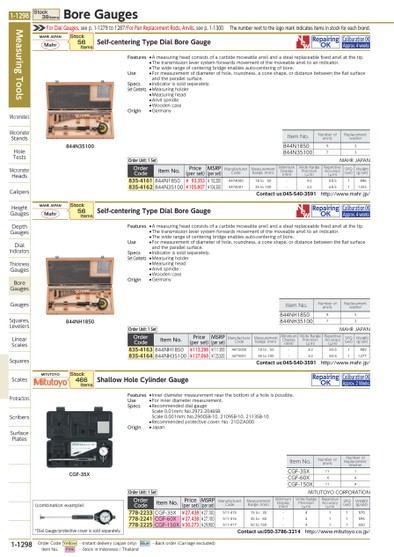 THENUMBERNEXTTOTHELOGOMARKINDICATESITEMSINSTOCKFOREACHBRAND.*DIALGAUGE/PROTECTIVECOVERISSOLDSEPARATELY.(COMBINATIONEXAMPLE)ITEMNO.NUMBEROFANVILSNUMBEROFREPLACEMENTWASHERCGF-35X111CGF-60X64CGF-150X114CGF-35X844N35100FORDIALGAUGES,SEEP.1-1279TO1287/FORPAIRREPLACEMENTRODS,ANVILS,SEEP.1-1300ITEMNO.NUMBEROFANVILSREPLACEMENTWASHER844NH185093844NH3510073ITEMNO.NUMBEROFANVILSREPLACEMENTWASHER844N185093844N3510073844NH1850MAHRJAPANSELF-CENTERINGTYPEDIALBOREGAUGEREPAIRINGOKCALIBURATIONOKSTOCK56ITEMSORDERUNIT:1SETMAHRJAPANORDERCODEITEMNO.PRICE(PERSET)MSRP(PERSET)MANUFACTURERCODEMEASUREMENTRANGE(MM)MINIMUMDISPLAY(MM)WIDERANGEPRECISION(ΜM)REPETITIVEACCURACY(ΜM)SPQ(SET)WEIGHT(G/SET)835-4161844N1850¥93,353¥92,200447400018TO50-≦2≦0.51896835-4162844N35100¥105,807¥104,500447400135TO100-≦2≦0.511253CONTACTUS:045-540-3591HTTP://WWW.MAHR.JP/MAHRJAPANSELF-CENTERINGTYPEDIALBOREGAUGEREPAIRINGOKCALIBURATIONOKSTOCK56ITEMSORDERUNIT:1SETMAHRJAPANORDERCODEITEMNO.PRICE(PERSET)MSRP(PERSET)MANUFACTURERCODEMEASUREMENTRANGE(MM)MINIMUMDISPLAY(MM)WIDERANGEPRECISION(ΜM)REPETITIVEACCURACY(ΜM)SPQ(SET)WEIGHT(G/SET)835-4163844NH1850¥113,298¥111,900447500018TO50-≦2≦0.51889835-4164844NH35100¥127,068¥125,500447500135TO100-≦2≦0.511277CONTACTUS:045-540-3591HTTP://WWW.MAHR.JP/MITUTOYOSHALLOWHOLECYLINDERGAUGEREPAIRINGOKCALIBURATIONOKORDERCODEITEMNO.PRICE(PERSET)MSRP(PERSET)MANUFACTURERCODEMEASUREMENTRANGE(MM)MINIMUMDISPLAY(MM)WIDERANGEPRECISION(ΜM)REPETITIVEACCURACY(ΜM)SPQ(SET)WEIGHT(G/SET)778-2233CGF-35X¥27,438¥27,100511-41515TO35-411570778-2241CGF-60X¥27,438¥27,100511-41635TO60-411595778-2225CGF-150X¥30,273¥29,900511-41750TO150-411650CONTACTUS:050-3786-3214HTTP://WWW.MITUTOYO.CO.JP/STOCK466ITEMSORDERUNIT:1SETMITUTOYOCORPORATIONFEATURES●AMEASURINGHEADCONSISTSOFACARBIDEMOVEABLEANVILANDASTEALREPLACEABLEFIXEDANVILATTHETIP.●THETRANSMISSIONLEVERSYSTEMFORWARDSMOVEMENTOFTHEMOVEABLEANVILTOANINDICATOR.●THEWIDERANGEOFCENTERINGBRIDGEENABLESAUTO-CENTERINGOFBORE.USE●FORMEASUREMENTOFDIAMETEROFHOLE,ROUNDNESS,ACONESHAPE,ORDISTANCEBETWEENTHEFLATSURFACEANDTHEPARALLELSURFACE.SPECS●INDICATORISSOLDSEPARATELY.SETCONTENTS●MEASURINGHOLDER●MEASURINGHEAD●ANVILSPINDLE●WOODENCASEORIGIN●GERMANYFEATURES●AMEASURINGHEADCONSISTSOFACARBIDEMOVEABLEANVILANDASTEALREPLACEABLEFIXEDANVILATTHETIP.●THETRANSMISSIONLEVERSYSTEMFORWARDSMOVEMENTOFTHEMOVEABLEANVILTOANINDICATOR.●THEWIDERANGEOFCENTERINGBRIDGEENABLESAUTO-CENTERINGOFBORE.USE●FORMEASUREMENTOFDIAMETEROFHOLE,ROUNDNESS,ACONESHAPE,ORDISTANCEBETWEENTHEFLATSURFACEANDTHEPARALLELSURFACE.SPECS●INDICATORISSOLDSEPARATELY.SETCONTENTS●MEASURINGHOLDER●MEASURINGHEAD●ANVILSPINDLE●WOODENCASEORIGIN●GERMANYFEATURES●INNERDIAMETERMEASUREMENTNEARTHEBOTTOMOFAHOLEISPOSSIBLE.USE●FORINNERDIAMETERMEASUREMENT.SPECS●RECOMMENDEDDIALGAUGESCALE0.01MM:NO.2972.2046SBSCALE0.001MM:NO.2900SB-10,2109SB-10,2113SB-10●RECOMMENDEDPROTECTIVECOVER:NO.21DZA000ORIGIN●JAPANAPPROX.2WEEKSAPPROX.4WEEKSAPPROX.4WEEKSMEASURINGTOOLSMICROMETERSMICROMETERSTANDSHOLETESTSMICROMETERHEADSCALIPERSHEIGHTGAUGESDEPTHGAUGESDIALINDICATORSTHICKNESSGAUGESBOREGAUGESGAUGESSQUARES,LEVELERSLINEARSCALESSQUARESSCALESPROTRACTORSSCRIBERSSURFACEPLATESSTOCK38ITEMSBOREGAUGES1-1298*0110444*1-1298ORDERCODEYELLOW…INSTANTDELIVERY(JAPANONLY)BLUE…BACKORDER(CARRIAGEEXCLUDED)ITEMNO.PINK…STOCKININDONESIA/THAILAND