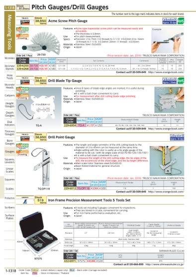 THENUMBERNEXTTOTHELOGOMARKINDICATESITEMSINSTOCKFOREACHBRAND.29-730EXAMPLETG-DP118EXAMPLEEXAMPLETG-ASETCONTENTSBEVELANGLEMEASUREMENTGAUGE9SHEETSSET(30°TO50°)EVERY2.5°ROUTEINTERVALMEASUREMENTGAUGE9SHEETSSET(4MMTO12MM)WELDINGGAUGETAPERGAUGE(1MMTO15MM)UNDERCUTGAUGEPRECISION±1°±0.1MMGAP/LENGTH:WITHIN±0.2MM(FOR20MM/40MM)ANGLE:WITHIN±1.5°±0.05MM(FORTHEMEASURINGRANGE)±0.05MM(1.0MMORLESS)MATERIALSMAINBODY:STAINLESSSTEELBODYSIZE30X65X18MM20X65X18MM70.5X48X7MM148X17X1.2MM115X58X18MMPROUDCTWEIGHT226G134G85G11G86G97575234MM195MM40MMTRUSCOACMESCREWPITCHGAUGECALIBURATIONOKORDERCODEITEMNO.PRICE(PERPIECE)MSRP(PERPIECE)DIMENSION(MM)SETCONTENTSCOMMENTSNUMBEROFSHEETS(SHEETS)SPQ(PIECE)WEIGHT(G)229-625030-720¥20,181¥21,800121X382,3,4,5,6,7,8,9,10,12,16,20(MM)30°,2TO20MM1210205229-626829-730¥20,181¥21,800121X381,11/3,11/2,13/4,2,21/2,3,31/2,4,5,6,7,8,9,10,12(INCH)29°,1TO12THREADS(INCHES)1610250CONTACTUS:0120-509-849HTTP://WWW.ORANGE-BOOK.COM/TRUSCODRILLBLADETIPGAUGECALIBURATIONOKORDERCODEITEMNO.PRICE(PERPIECE)MSRP(PERPIECE)MEASUREMENTRANGE(°)SPQ(PIECE)WEIGHT(G)229-6004TG-A¥1,157¥1,25060,70,90,118,125,135,150,1601211CONTACTUS:0120-509-849HTTP://WWW.ORANGE-BOOK.COM/TRUSCODRILLPOINTGAUGECALIBURATIONOKORDERCODEITEMNO.PRICE(PERPIECE)MSRP(PERPIECE)MEASUREMENTRANGE(°)SPQ(PIECE)WEIGHT(G)229-6012TG-DP118¥3,564¥3,8501181160CONTACTUS:0120-509-849HTTP://WWW.ORANGE-BOOK.COM/SHINWAIRONFRAMEPRECISIONMEASUREMENTTOOLS5TOOLSSETORDERCODEITEMNO.PRICE(PERSET)MSRP(PERSET)SPQ(SET)WEIGHT(G/SET)432-697197575¥40,886¥53,0001870CONTACTUS:0120-666-899HTTP://WWW.SHINWASOKUTEI.CO.JP/STOCK519ITEMSSTOCK38,650ITEMSSTOCK38,650ITEMSSTOCK38,650ITEMSORDERUNIT:1SETSHINWARULESCO.LTDORDERUNIT:1PIECE(PRICEREVISIONDATE:JAN,2018)TRUSCONAKAYAMACORPORATIONORDERUNIT:1PIECETRUSCONAKAYAMACORPORATIONORDERUNIT:1PIECE(PRICEREVISIONDATE:JAN,2016)TRUSCONAKAYAMACORPORATIONCHEMICALCONTENTINSPECTION.COMECODRAWING.COMFEATURES●ACMETYPETRAPEZOIDALSCREWPITCHCANBEMEASUREDEASILYANDACCURATELY.●THETHICKNESSIS0.8MM.USE●FORPITCHMEASUREMENT.SPECS●PRECISION:2TO7MM(12THREADSTO31/2)±0.03MM8TO16MM(3THREADSTO11/3)±0.04MM20MM(1THREAD)±0.05MMMATERIALS●STAINLESSSTEEL(SUS430)ORIGIN●JAPANCHEMICALCONTENTINSPECTION.COMECODRAWING.COMFEATURES●SINCE8TYPESOFBLADEEDGEANGLESAREMARKED,ITISUSEFULDURINGPOLISHING.●ITISWITHABALLCHAINCONVENIENTTOCARRY.USE●FORMEASUREMENTAFTERDRILLCUTTINGBLADEEDGEPOLISHING.MATERIALS●STAINLESSSTEEL(SUS420J2)ORIGIN●JAPANCHEMICALCONTENTINSPECTION.COMECODRAWING.COMFEATURES●THELENGTHANDANGLESYMMETRYOFTHEDRILLCUTTINGBLADETOTHEDIAMETEROF3TO45MMCANBEMEASUREDATTHESAMETIME.●ANGLESETTINGWITHTHEROTORISUSEFULASATIPANGLEGAUGEOFTHEMATERIALTOBECUT.(WITHTIPANGLESCALEOF60/70/90/125/135/150°)●ITISWITHABALLCHAINCONVENIENTTOCARRY.USE●TOMEASURETHELENGTHOFTHEDRILLCUTTINGEDGE,THETIPANGLEOFTHEDRILL,THEECCENTRICITYOFTHECHISELEDGE,ANDTHELIPHEIGHTDIFFERENCE.MATERIALS●MAINSCALE/ROTOR:STAINLESSSTEEL(SUS420J2)●BASE:ROLLEDMATERIALFORGENERALSTRUCTUREORIGIN●JAPANFEATURES●5TOOLSSETINCLUDING5GAUGESCONVENIENTFORINSPECTIONS.●THEYARESTOREDINACASE,CONVENIENTFORCARRYING.USE●FORIRONFRAMEPERFORMANCEEVALUATION,ETC.ORIGIN●JAPANAPPROX.30DAYSAPPROX.30DAYSAPPROX.2WEEKSMEASURINGTOOLSMICROMETERSMICROMETERSTANDSHOLETESTSMICROMETERHEADSCALIPERSHEIGHTGAUGESDEPTHGAUGESDIALINDICATORSTHICKNESSGAUGESBOREGAUGESGAUGESSQUARES,LEVELERSLINEARSCALESSQUARESSCALESPROTRACTORSSCRIBERSSURFACEPLATESSTOCK913ITEMSPITCHGAUGES/DRILLGAUGES1-1318*0110560*1-1318ORDERCODEYELLOW…INSTANTDELIVERY(JAPANONLY)BLUE…BACKORDER(CARRIAGEEXCLUDED)ITEMNO.PINK…STOCKININDONESIA/THAILAND