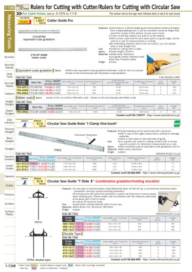 THENUMBERNEXTTOTHELOGOMARKINDICATESITEMSINSTOCKFOREACHBRAND.77822ONE-TOUCHFIXINGLEVER.7371273702(DOUBLETYPE)EXAMPLECTG-SP700(EQUIVALENTSCALEGRADATION)CTG-SP1200M(METERSCALE)EXAMPLEFORCUTTERKNIVES,SEEP.4-1076TO1118SHINWACIRCULARSAWGUIDERULER"ICLAMPONE-TOUCH"ORDERCODEITEMNO.PRICE(PERPIECE)MSRP(PERPIECE)TOTALLENGTHXWXTHICKNESS(MM)NOMINALDIMENSION(MM)SCALEPRECISION(MM)STRAIGHTNESSDEVIATION(MM)SPQ(PIECE)WEIGHT(KG)421-973277822¥9,334¥12,1001172X60X301000±0.4±0.45ORLESS11.2421-972477821¥10,183¥13,2001402X60X301200±0.5±0.50ORLESS11.3421-974177823¥12,729¥16,5002172X60X302000±0.7±0.60ORLESS12.0CONTACTUS:0120-666-899HTTP://WWW.SHINWASOKUTEI.CO.JP/SHINWACIRCULARSAWGUIDE"TSLIDEⅡ"(COMBINATIONGRADATION/HOLDINGMOVABLE)ORDERCODEITEMNO.PRICE(PERPIECE)MSRP(PERPIECE)TOTALLENGTHXWXTHICKNESS(MM)NOMINALDIMENSION(MM)SPQ(PIECE)WEIGHT(G)485-140473712¥2,469¥3,200462X275X303004405485-141273713¥2,546¥3,300612X275X304504448485-142173714¥2,623¥3,400762X275X306004490ORDERCODEITEMNO.PRICE(PERPIECE)MSRP(PERPIECE)TOTALLENGTHXWXTHICKNESS(MM)NOMINALDIMENSION(MM)SPQ(PIECE)WEIGHT(G)474-161773702¥4,166¥5,400462X425X303004730474-162573703¥4,397¥5,700612X425X304504830474-163373704¥4,629¥6,000762X425X306004920474-164173705¥4,860¥6,3001062X425X3090041090CONTACTUS:0120-666-899HTTP://WWW.SHINWASOKUTEI.CO.JP/STOCK519ITEMSSTOCK519ITEMSORDERUNIT:1PIECEORDERUNIT:1PIECESHINWARULESCO.LTDORDERUNIT:1PIECESHINWARULESCO.LTDTJMDESIGNCUTTERGUIDEPROORDERCODEITEMNO.PRICE(PERPIECE)MSRP(PERPIECE)TOTALLENGTHXWXTHICKNESS(MM)NOMINALDIMENSION(MM)SCALEPRECISION(ONTHELINE-DRAWINGSIDE)(MM)STRAIGHTNESSDEVIATION(MM)SPQ(PIECE)WEIGHT(G)795-4972CTG-SP700¥3,084¥4,570720X60X25700±0.280.32ORLESS2450795-4948CTG-SP1200¥4,395¥6,5101220X60X251200±0.400.40ORLESS2750795-4964CTG-SP1900¥8,478¥12,5601920X60X251900±0.550.50ORLESS21150STOCK1,907ITEMSORDERCODEITEMNO.PRICE(PERPIECE)MSRP(PERPIECE)TOTALLENGTHXWXTHICKNESS(MM)NOMINALDIMENSION(MM)SCALEPRECISION(ONTHELINE-DRAWINGSIDE)(MM)STRAIGHTNESSDEVIATION(MM)SPQ(PIECE)WEIGHT(G)795-4956CTG-SP1200M¥4,395¥6,5101220X60X251200±0.400.40ORLESS2750CONTACTUS:0120-125577HTTP://WWW.TAJIMATOOL.CO.JP/ORDERUNIT:1PIECEORDERUNIT:1PIECETJMDESIGNCORP.FEATURES●FIXING/RELEASINGCANBEPERFORMEDWITHONE-TOUCH.●WITHACAPONTHEEDGESURFACETHATISUNLIKELYTODAMAGEMATERIALS.●THEREISSTAINSTEELONTHEBOTHSIDEOFGUIDE.USE●FORAGUIDERULERUSEDFORCUTTINGABOARDWITHACIRCULARSAW(OTACUTTER).FORDIMENSIONMEASUREMENTASARULER.SPECS●WITHCOMBINEDSCALEOFEQUIVALENTSCALEGRADATIONSANDCMMATERIALS●MAINBODY:ALUMINUMORIGIN●JAPANFEATURES●ANEWTYPEOFANTI-FLUCTUATIONMETALFITTINGTHATDOESNOTFALLOFFHASACONVENTIONALHORIZONTALSHAKEPREVENTION,ANDALSOUPWARDBENDINGPREVENTION.●ALOCKINGSCREWWITHQUICK-LOCKMECHANISMISUSEDTOSETFIRMLYEVENINNARROWSPACES.●SLIMABUTTINGPART(25MMWIDTH)WILLNOTINTERFEREWITHTHEMATERIALUNDERNEATH.●THEABUTTPARTISFREETOMOVE.●AROBUST3DSTRUCTUREBODY.USE●USEDWHENCUTTINGMATERIALSWITHCIRCULARSAW.MATERIALS●MAINBODY:IRON,ALUMINUM,ABSRESINORIGIN●JAPANDOUBLETYPEFEATURES●SINCETHEREISA25MM-HEIGHTGUARDTHATPROTECTSHANDSANDFINGERSFROMABLADEGETTING-OVER,ITCANBESMOOTHLYMOVEDATHEIGHTTHATAVOIDTHECONTACTOFTHEELECTRICCIRCULARSAW'SMOTOR.●2LINESOFANTI-SLIPRUBBERSAREBUILT-INONTHEBOTTOM.●WITHCONVEXSCALETHATTHEZEROBASEPOINTISAGUIDEEDGE,CANBEUSEDASARULERFORMEASUREMENTORSCRIBING.●BYEMBEDDINGSTAINLESSSTEELINTHECUTSURFACE,YOUCANALWAYSDRAWANEATSTRAIGHTLINE.USE●GUIDEFORCUTTINGWITHACUTTER.SPECS●GUARDHEIGHT:25.0MMMATERIALS●GUIDEBODY:ALUMINUM●CUTGUIDESURFACE:STAINLESSSTEEL●NON-SLIP:FOAMEDRUBBERORIGIN●CHINAEQUIVALENTSCALEGRADATIONSPECS●WITHSCALEEQUIVALENTSCALEGRADATIONS(MILIMETERSCALEFORTHECUTSURFACE)●SCALEONTHELINE-DRAWINGSIDE:EQUIVALENTSCALEGRADATIONMETERSCALESPECS●SCALEOFTHECUTSURFACE:MILIMETERSCALE●SCALEONTHELINE-DRAWINGSIDE:METERSCALEMEASURINGTOOLSMICROMETERSMICROMETERSTANDSHOLETESTSMICROMETERHEADSCALIPERSHEIGHTGAUGESDEPTHGAUGESDIALINDICATORSTHICKNESSGAUGESBOREGAUGESGAUGESSQUARES,LEVELERSLINEARSCALESSQUARESSCALESPROTRACTORSSCRIBERSSURFACEPLATESSTOCK187ITEMSRULERSFORCUTTINGWITHCUTTER/RULERSFORCUTTINGWITHCIRCULARSAW1-1348*0110843*1-1348ORDERCODEYELLOW…INSTANTDELIVERY(JAPANONLY)BLUE…BACKORDER(CARRIAGEEXCLUDED)ITEMNO.PINK…STOCKININDONESIA/THAILAND