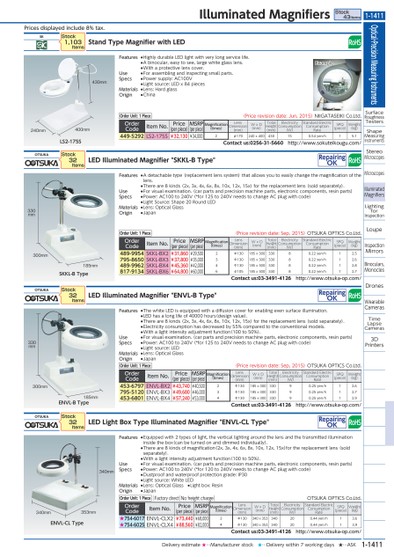 PRICESDISPLAYEDINCLUDE8%TAX.430MMLS2-175S400MM240MMEXAMPLESKKL-BTYPE330MM300MM185MMENVL-BTYPE330MM300MM185MMENVL-CLTYPE340MM340MM353MMSKSTANDTYPEMAGNIFIERWITHLEDORDERCODEITEMNO.PRICE(PERPIECE)MSRP(PERPIECE)MAGNIFICATION(TIMES)LENSDIMENSION(MM)WXD(MM)TOTALHEIGHT(MM)ELECTRICITYCONSUMPTION(W)STANDARDELECTRICCONSUMPTIONRATESPQ(PIECE)WEIGHT(KG)449-5292LS2-175S¥32,130¥34,0002Φ170240X400430150.54YEN/H15.1CONTACTUS:0256-31-5660HTTP://WWW.SOKUTEIKOUGU.COM/STOCK1,103ITEMSOTSUKALEDILLUMINATEDMAGNIFIER"SKKL-BTYPE"REPAIRINGOKORDERCODEITEMNO.PRICE(PERPIECE)MSRP(PERPIECE)MAGNIFICATION(TIMES)LENSDIMENSION(MM)WXD(MM)TOTALHEIGHT(MM)ELECTRICITYCONSUMPTION(W)STANDARDELECTRICCONSUMPTIONRATESPQ(PIECE)WEIGHT(KG)489-9954SKKL-BX2¥31,860¥29,5002Φ130185X30033080.22YEN/H12.5795-8650SKKL-BX3¥37,800¥35,0003Φ130185X30033080.22YEN/H12.6489-9962SKKL-BX4¥45,360¥42,0004Φ130185X30033080.22YEN/H12.8817-9134SKKL-BX6¥64,800¥60,0006Φ105185X30033080.22YEN/H12.7CONTACTUS:03-3491-4126HTTP://WWW.OTSUKA-OP.COM/STOCK32ITEMSORDERUNIT:1PIECE(PRICEREVISIONDATE:SEP,2015)OTSUKAOPTICSCO.LTD.ORDERUNIT:1PIECE(PRICEREVISIONDATE:JUN,2015)NIIGATASEIKICO.LTD.OTSUKALEDILLUMINATEDMAGNIFIER"ENVL-BTYPE"REPAIRINGOKORDERCODEITEMNO.PRICE(PERPIECE)MSRP(PERPIECE)MAGNIFICATION(TIMES)LENSDIMENSION(MM)WXD(MM)TOTALHEIGHT(MM)ELECTRICITYCONSUMPTION(W)STANDARDELECTRICCONSUMPTIONRATESPQ(PIECE)WEIGHT(KG)453-6797ENVL-BX2¥43,740¥40,5002Φ130185X30033090.25YEN/H12.6795-5120ENVL-BX3¥49,680¥46,0003Φ130185X30033090.25YEN/H12.7453-6801ENVL-BX4¥57,240¥53,0004Φ130185X30033090.25YEN/H12.9CONTACTUS:03-3491-4126HTTP://WWW.OTSUKA-OP.COM/STOCK32ITEMSOTSUKALEDLIGHTBOXTYPEILLUMINATEDMAGNIFIER"ENVL-CLTYPE"REPAIRINGOKORDERCODEITEMNO.PRICE(PERPIECE)MSRP(PERPIECE)MAGNIFICATION(TIMES)LENSDIMENSION(MM)WXD(MM)TOTALHEIGHT(MM)ELECTRICITYCONSUMPTION(W)STANDARDELECTRICCONSUMPTIONRATESPQ(PIECE)WEIGHT(KG)★754-6017ENVL-CLX2¥73,440¥68,0002Φ130340X353340200.44YEN/H13.6★754-6025ENVL-CLX4¥88,560¥82,0004Φ130340X353340200.44YEN/H13.9CONTACTUS:03-3491-4126HTTP://WWW.OTSUKA-OP.COM/STOCK32ITEMSORDERUNIT:1PIECEFACTORYDIRECTNOFREIGHTCHARGEOTSUKAOPTICSCO.LTD.ORDERUNIT:1PIECE(PRICEREVISIONDATE:SEP,2015)OTSUKAOPTICSCO.LTD.FEATURES●HIGHLYDURABLELEDLIGHTWITHVERYLONGSERVICELIFE.●ABINOCULAR,EASYTOSEE,LARGEWHITEGLASSLENS.●WITHAPROTECTIVELENSCOVER.USE●FORASSEMBLINGANDINSPECTINGSMALLPARTS.SPECS●POWERSUPPLY:AC100V●LIGHTSOURCE:LEDX84PIECESMATERIALS●LENS:HARDGLASSORIGIN●CHINAFEATURES●ADETACHABLETYPE(REPLACEMENTLENSSYSTEM)THATALLOWSYOUTOEASILYCHANGETHEMAGNIFICATIONOFTHELENS.●THEREARE8KINDS(2X,3X,4X,6X,8X,10X,12X,15X)FORTHEREPLACEMENTLENS(SOLDSEPARATELY).USE●FORVISUALEXAMINATION.(CARPARTSANDPRECISIONMACHINEPARTS,ELECTRONICCOMPONENTS,RESINPARTS)SPECS●POWER:AC100TO240V(*FOR125TO240VNEEDSTOCHANGEACPLUGWITHCODE)●LIGHTSOURCE:SHAPE20ROUNDLEDMATERIALS●LENS:OPTICALGLASSORIGIN●JAPANFEATURES●THEWHITELEDISEQUIPPEDWITHADIFFUSIONCOVERFORENABLINGEVENSURFACEILLUMINATION.●LEDHASALONGLIFEOF40000HOURS(DESIGNVALUE).●THEREARE8KINDS(2X,3X,4X,6X,8X,10X,12X,15X)FORTHEREPLACEMENTLENS(SOLDSEPARATELY).●ELECTRICITYCONSUMPTIONHASDECREASEDBY55%COMPAREDTOTHECONVENTIONALMODELS.●WITHALIGHTINTENSITYADJUSTMENTFUNCTION(100TO50%).USE●FORVISUALEXAMINATION.(CARPARTSANDPRECISIONMACHINEPARTS,ELECTRONICCOMPONENTS,RESINPARTS)SPECS●POWER:AC100TO240V(*FOR125TO240VNEEDSTOCHANGEACPLUGWITHCODE)●LIGHTSOURCE:LEDMATERIALS●LENS:OPTICALGLASSORIGIN●JAPANFEATURES●EQUIPPEDWITH2TYPESOFLIGHT,THEVERTICALLIGHTINGAROUNDTHELENSANDTHETRANSMITTEDILLUMINATIONINSIDETHEBOX(CANBETURNEDONANDDIMMEDINDIVIDUALLY).●THEREARE8KINDSOFMAGNIFICATION(2X,3X,4X,6X,8X,10X,12X,15X)FORTHEREPLACEMENTLENS(SOLDSEPARATELY).●WITHALIGHTINTENSITYADJUSTMENTFUNCTION(100TO50%).USE●FORVISUALEXAMINATION.(CARPARTSANDPRECISIONMACHINEPARTS,ELECTRONICCOMPONENTS,RESINPARTS)SPECS●POWER:AC100TO240V(*FOR120TO240VNEEDSTOCHANGEACPLUGWITHCODE)●DUSTPROOFANDWATERPROOFPROTECTIONGRADE:IP30●LIGHTSOURCE:WHITELEDMATERIALS●LENS:OPTICALGLASS●LIGHTBOX:RESINORIGIN●JAPANOPTICAL・PRECISIONMEASURINGINSTRUMENTSSURFACEROUGHNESSTESTERSSHAPEMEASURINGINSTRUMENTSSTEREOMICROSCOPESMICROSCOPESILLUMINATEDMAGNIFIERSLIGHTINGFORINSPECTIONLOUPEINSPECTIONMIRRORSBINOCULARS,MONOCLESDRONESWEARABLECAMERASTIMELAPSECAMERAS3DPRINTERSILLUMINATEDMAGNIFIERSSTOCK43ITEMS1-1411*0111270*1-1411DELIVERYESTIMATE★…MANUFACTURERSTOCK★…DELIVERYWITHIN7WORKINGDAYS★…ASK