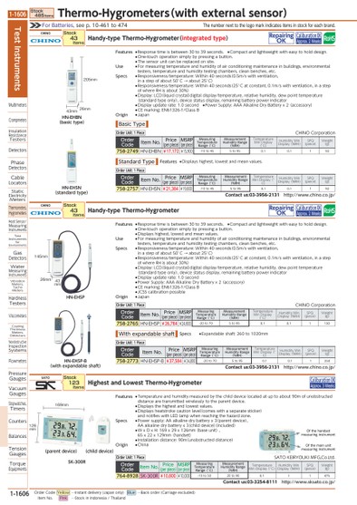THENUMBERNEXTTOTHELOGOMARKINDICATESITEMSINSTOCKFOREACHBRAND.HN-EHBN(BASICTYPE)HN-EHSN(STANDARDTYPE)HN-EHSPHN-EHSP-B(WITHEXPANDABLESHAFT)SK-300R(PARENTDEVICE)(CHILDDEVICE)205MM145MM26MM26MM43MM169MM126MM43MMFORBATTERIES,SEEP.10-461TO474OFTHEHANDSETMEASURINGINSTRUMENTOFTHEMAINUNITMEASURINGINSTRUMENTCHINOHANDY-TYPETHERMO-HYGROMETER(INTEGRATEDTYPE)REPAIRINGOKCALIBURATIONOKCHINOHANDY-TYPETHERMO-HYGROMETERREPAIRINGOKCALIBURATIONOKORDERCODEITEMNO.PRICE(PERPIECE)MSRP(PERPIECE)MEASURINGTEMPERATURERANGE(°C)MEASUREMENTHUMIDITYRANGE(%RH)TEMPERATUREMINDISPLAY(°C)HUMIDITYMINDISPLAY(%RH)SPQ(PIECE)WEIGHT(G)758-2765HN-EHSP¥26,784¥24,800-20TO705TO950.10.11130SATOHIGHESTANDLOWESTTHERMO-HYGROMETERCALIBURATIONOKORDERCODEITEMNO.PRICE(PERPIECE)MSRP(PERPIECE)MEASURINGTEMPERATURERANGE(°C)MEASUREMENTHUMIDITYRANGE(%RH)TEMPERATUREMINDISPLAY(°C)HUMIDITYMINDISPLAY(%RH)SPQ(PIECE)WEIGHT(G)764-8928SK-300R¥10,800¥10,000-10TO5020TO900.111475ORDERCODEITEMNO.PRICE(PERPIECE)MSRP(PERPIECE)MEASURINGTEMPERATURERANGE(°C)MEASUREMENTHUMIDITYRANGE(%RH)TEMPERATUREMINDISPLAY(°C)HUMIDITYMINDISPLAY(%RH)SPQ(PIECE)WEIGHT(G)758-2773HN-EHSP-B¥37,584¥34,800-20TO705TO950.10.11250CONTACTUS:03-3956-2131HTTP://WWW.CHINO.CO.JP/ORDERCODEITEMNO.PRICE(PERPIECE)MSRP(PERPIECE)MEASURINGTEMPERATURERANGE(°C)MEASUREMENTHUMIDITYRANGE(%RH)TEMPERATUREMINDISPLAY(°C)HUMIDITYMINDISPLAY(%RH)SPQ(PIECE)WEIGHT(G)758-2757HN-EHSN¥21,384¥19,800-10TO455TO950.10.1192CONTACTUS:03-3956-2131HTTP://WWW.CHINO.CO.JP/ORDERCODEITEMNO.PRICE(PERPIECE)MSRP(PERPIECE)MEASURINGTEMPERATURERANGE(°C)MEASUREMENTHUMIDITYRANGE(%RH)TEMPERATUREMINDISPLAY(°C)HUMIDITYMINDISPLAY(%RH)SPQ(PIECE)WEIGHT(G)758-2749HN-EHBN¥17,172¥15,900-10TO455TO950.10.1192CONTACTUS:03-3254-8111HTTP://WWW.SKSATO.CO.JP/STOCK123ITEMSSTOCK43ITEMSSTOCK43ITEMSORDERUNIT:1PIECECHINOCORPORATIONORDERUNIT:1PIECEORDERUNIT:1PIECEORDERUNIT:1PIECESATOKEIRYOUKIMFG,CO.LTD.ORDERUNIT:1PIECECHINOCORPORATIONFEATURES●RESPONSETIMEISBETWEEN30TO39SECONDS.●COMPACTANDLIGHTWEIGHTWITHEASYTOHOLDDESIGN.●ONE-TOUCHOPERATIONSIMPLYBYPRESSINGABUTTON.●THESENSORUNITCANBEREPLACEDONSITE.USE●FORMEASURINGTEMPERATUREANDHUMIDITYOFAIRCONDITIONINGMAINTENANCEINBUILDINGS,ENVIRONMENTALTESTERS,TEMPERATUREANDHUMIDITYTESTINGCHAMBERS,CLEANBENCHES,ETC.SPECS●RESPONSIVENESS/TEMPERATURE:WITHIN40SECONDS(0.5M/SWITHVENTILATION,INASTEPOFABOUT50°C→ABOUT25°C)●RESPONSIVENESS/TEMPERATURE:WITHIN40SECONDS(25°CATCONSTANT,0.1M/SWITHVENTILATION,INASTEPOFWHERERHISABOUT30%)●DISPLAY:LCD(LIQUIDCRYSTAL)DIGITALDISPLAY/TEMPERATURE,RELATIVEHUMIDITY,DEWPOINTTEMPERATURE(STANDARDTYPEONLY),DEVICESTATUSDISPLAY,REMAININGBATTERYPOWERINDICATOR●DISPLAYUPDATERATE:1.0SECOND●POWERSUPPLY:AAAALKALINEDRYBATTERYX2(ACCESSORY)●CEMARKING:EN61326-1/CLASSBORIGIN●JAPANBASICTYPESTANDARDTYPEFEATURES●RESPONSETIMEISBETWEEN30TO39SECONDS.●COMPACTANDLIGHTWEIGHTWITHEASYTOHOLDDESIGN.●ONE-TOUCHOPERATIONSIMPLYBYPRESSINGABUTTON.●DISPLAYSHIGHEST,LOWESTANDMEANVALUES.USE●FORMEASURINGTEMPERATUREANDHUMIDITYOFAIRCONDITIONINGMAINTENANCEINBUILDINGS,ENVIRONMENTALTESTERS,TEMPERATUREANDHUMIDITYTESTINGCHAMBERS,CLEANBENCHES,ETC.SPECS●RESPONSIVENESS/TEMPERATURE:WITHIN40SECONDS(0.5M/SWITHVENTILATION,INASTEPOFABOUT50°C→ABOUT25°C)●RESPONSIVENESS/TEMPERATURE:WITHIN40SECONDS(25°CATCONSTANT,0.1M/SWITHVENTILATION,INASTEPOFWHERERHISABOUT30%)●DISPLAY:LCD(LIQUIDCRYSTAL)DIGITALDISPLAY/TEMPERATURE,RELATIVEHUMIDITY,DEWPOINTTEMPERATURE(STANDARDTYPEONLY),DEVICESTATUSDISPLAY,REMAININGBATTERYPOWERINDICATOR●DISPLAYUPDATERATE:1.0SECOND●POWERSUPPLY:AAAALKALINEDRYBATTERYX2(ACCESSORY)●CEMARKING:EN61326-1/CLASSB●JCSSCALIBRATIONPOSSIBLEORIGIN●JAPANWITHEXPANDABLESHAFTFEATURES●TEMPERATUREANDHUMIDITYMEASUREDBYTHECHILDDEVICELOCATEDATUPTOABOUT90MOFUNOBSTRUCTEDDISTANCEARETRANSMITTEDWIRELESSLYTOTHEPARENTDEVICE.●DISPLAYSTHEHIGHESTANDLOWESTVALUES.●DISPLAYSHEATSTROKECAUTIONLEVEL(COMESWITHASEPARATESTICKER)ANDNOTIFIESWITHLEDLAMPWHENREACHINGTHEHAZARDZONE.SPECS●POWERSUPPLY:AAALKALINEDRYBATTERYX3(PARENTDEVICE),AAALKALINEDRYBATTERYX3(CHILDDEVICE)(INCLUDED)●WXDXH:169X29X126MM(BASEUNIT),65X22X129MM(HANDSET)●INSTALLATIONDISTANCE:90M(UNOBSTRUCTEDDISTANCE)ORIGIN●CHINASPECS●EXPANDABLESHAFT:260TO1020MMAPPROX.3WEEKSAPPROX.2WEEKSAPPROX.2WEEKSFEATURES●DISPLAYSHIGHEST,LOWESTANDMEANVALUES.TESTINSTRUMENTSMULTIMETERSCRAMPMETERSINSULATIONRESISTANCETESTERSDETECTORSPHASEDETECTORSCABLELOCATORSSTATICELECTRICITYMETERSTHERMOMETERS,HYGROMETERSHEATSENSOR/MEASURINGINSTRUMENTSTESTINSTRUMENTSFORENVIRONMENTSGASDETECTORSWATERMEASURINGINSTRUMENTSVIBRATIONMETERS,TACHOMETERSHARDNESSTESTERSVISCOMETERSCOATINGTHICKNESSMETERS,DETECTORSNONDESTRUCTIVEINSPECTIONSYSTEMSFLOWMETERSPRESSUREGAUGESVACUUMGAUGESSTOPWATCHES,TIMERSCOUNTERSBALANCESTENSIONGAUGESTORQUEEQUIPMENTSSTOCK485ITEMSTHERMO-HYGROMETERS(WITHEXTERNALSENSOR)1-1606*0112840*1-1606ORDERCODEYELLOW…INSTANTDELIVERY(JAPANONLY)BLUE…BACKORDER(CARRIAGEEXCLUDED)ITEMNO.PINK…STOCKININDONESIA/THAILAND