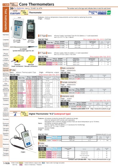 THENUMBERNEXTTOTHELOGOMARKINDICATESITEMSINSTOCKFOREACHBRAND.LK-200AR(PROBE/TELESCOPICTYPEFORAIR)KM-62A(MALECONNECTOR)KM-63A(FEMALECONNECTOR)CT-1310D(CTTYPE)DEPTHWIDTHHEIGHTKT-01U(KTTYPE)73081172MM77MMFORBATTERIES,SEEP.10-461TO474CUSTOMTHERMOMETERREPAIRINGOKCALIBURATIONOKSHINWADIGITALTHERMOMETER"H-2"(WATERPROOFTYPE)ORDERCODEITEMNO.PRICE(PERPIECE)MSRP(PERPIECE)PROBELENGTH(MM)SENSORSPQ(PIECE)WEIGHT(G)756-896773087¥5,014¥6,500185EXTRA-FINETYPE180756-897573088¥4,629¥6,000110STANDARDTYPE180756-898373089¥6,171¥8,000275THICKANDLONGTYPE192756-899173090¥6,171¥8,000110FLATTIPTYPE183ORDERCODEITEMNO.PRICE(PERPIECE)MSRP(PERPIECE)LENGTHSPQ(PIECE)WEIGHT(G)756-7324LK-5000M¥7,128¥6,6005M1112CONTACTUS:03-3255-1117HTTP://WWW.KK-CUSTOM.CO.JP/ORDERCODEITEMNO.PRICE(PERPIECE)MSRP(PERPIECE)SPQ(PIECE)WEIGHT(G)756-7243KM-63A¥1,264¥1,30016ORDERCODEITEMNO.PRICE(PERPIECE)MSRP(PERPIECE)SPQ(PIECE)WEIGHT(G)756-7235KM-62A¥1,069¥1,10016ORDERCODEITEMNO.PRICE(PERPIECE)MSRP(PERPIECE)TYPEMEASURINGTEMPERATURERANGE(°C)TEMPERATUREMINDISPLAY(°C)SPQ(PIECE)WEIGHT(G)449-2251KT-01U¥15,552¥16,0001CH-200TO13720.1/11123449-2269KT-02U¥17,496¥18,0002CH-200TO13720.1/11127ORDERCODEITEMNO.PRICE(PERPIECE)MSRP(PERPIECE)TYPEMEASURINGTEMPERATURERANGE(°C)TEMPERATUREMINDISPLAY(°C)SPQ(PIECE)WEIGHT(G)221-8348CT-1310D¥10,674¥10,9801CH-50TO13000.1/11190221-8330CT-1320D¥13,608¥14,0002CH-50TO130011190ORDERCODEITEMNO.PRICE(PERPIECE)MSRP(PERPIECE)WORKINGTEMPERATURERANGE(°C)MEASUREMENTTARGETSPQ(PIECE)WEIGHT(G)331-6670LK-200AR¥14,256¥13,200-40TO200FORAIR1110756-7278LK-200TFH¥26,136¥24,200-40TO200FORCHEMICALRESISTANT144756-7286LK-250¥18,360¥17,000-40TO250FORSURFACE145221-8356LK-300¥8,003¥7,600-40TO300FORLIQUID150221-8364LK-300S¥8,554¥8,800-40TO300FORLIQUID150756-7294LK-300A¥10,584¥9,800-40TO300FORAIR142756-7308LK-300W¥11,664¥10,800-40TO300FORLIQUID151756-7316LK-310¥11,664¥10,800-40TO300FORLIQUID140213-6384LK-500¥21,830¥21,000-40TO500FORSURFACE150756-7332LK-500L¥22,680¥21,000-40TO500LTYPEFORSURFACE170756-7341LK-500S¥20,250¥20,000-40TO500SMALLAREAFORSURFACE165221-8372LK-700¥10,498¥10,800-40TO700FORLIQUIDANDNARROWNESS138213-6376LK-800¥11,435¥11,000-40TO800FORLIQUID150756-7367LK-800W¥16,632¥15,400-40TO800FORLIQUID157756-7359LK-800E¥11,880¥11,000-40TO800FORAIR146756-7375LK-900¥17,820¥16,500-40TO900FORHIGHTEMPERATURE1100221-8381LK-1000¥35,640¥33,000-40TO1000FORSURFACE1250341-8669LK-1200I¥20,048¥19,800-40TO1200FORHIGHTEMPERATURE1188CONTACTUS:0120-666-899HTTP://WWW.SHINWASOKUTEI.CO.JP/STOCK519ITEMSSTOCK298ITEMSORDERCODEITEMNO.PRICE(PERPIECE)MSRP(PERPIECE)MEASURINGTEMPERATURERANGE(°C)TEMPERATUREMINDISPLAY(°C)SPQ(PIECE)WEIGHT(G)756-895973081¥9,643¥12,500-30TO2500.1/11360ORDERUNIT:1PIECEORDERUNIT:1PIECESHINWARULESCO.LTDORDERUNIT:1PIECE(PRICEREVISIONDATE:FEB,2015)ORDERUNIT:1PIECE(PRICEREVISIONDATE:FEB,2015)CUSTOMORDERUNIT:1PIECE(PRICEREVISIONDATE:FEB,2015)ORDERUNIT:1PIECEORDERUNIT:1PIECEORDERUNIT:1PIECE(PRICEREVISIONDATE:FEB,2015)FEATURES●VARIOUSTEMPERATUREMEASUREMENTSCANBEMADEBYREPLACINGTHEPROBE.ORIGIN●TAIWANSPECS●POWERSUPPLY:LAMINATEDTYPE9VDRYBATTERYX1(SOLDSEPARATELY)●WXDXH:71X36X148MMCTTYPESPECS●POWERSUPPLY:AAADRYBATTERYX2(SOLDSEPARATELY)●WXDXH:50X20.6X116.1MMKTTYPEPROBEORIGIN●NETHERLANDSMALECONNECTORORIGIN●NETHERLANDSFEMALECONNECTOREXTENSIONCORDFEATURES●CONTAINERPROTECTIONGRADEIPX7WATERPROOFDESIGN.●CANBEREPLACEDWITHAPROBESOLDSEPARATELY.●EQUIPPEDWITHAMEMORYDISPLAYFUNCTIONTHATCANSTORETEMPERATUREUPTO10TIMES.SPECS●CONTAINERPROTECTIONGRADE:IPX7●POWERSUPPLY:AAADRYBATTERYX2(ACCESSORYFORMONITORING)●WXDXH:77X46X172MMACCESSORIES●PROBE(73088)ORIGIN●CHINAPROBEAPPROX.3WEEKSORIGIN●JAPANSPECS●SENSOR:THERMOCOUPLEKTYPEORIGIN●PHILIPPINES●JAPANTESTINSTRUMENTSMULTIMETERSCRAMPMETERSINSULATIONRESISTANCETESTERSDETECTORSPHASEDETECTORSCABLELOCATORSSTATICELECTRICITYMETERSTHERMOMETERS,HYGROMETERSHEATSENSOR/MEASURINGINSTRUMENTSTESTINSTRUMENTSFORENVIRONMENTSGASDETECTORSWATERMEASURINGINSTRUMENTSVIBRATIONMETERS,TACHOMETERSHARDNESSTESTERSVISCOMETERSCOATINGTHICKNESSMETERS,DETECTORSNONDESTRUCTIVEINSPECTIONSYSTEMSFLOWMETERSPRESSUREGAUGESVACUUMGAUGESSTOPWATCHES,TIMERSCOUNTERSBALANCESTENSIONGAUGESTORQUEEQUIPMENTSSTOCK485ITEMSCORETHERMOMETERS1-1626*0112970*1-1626ORDERCODEYELLOW…INSTANTDELIVERY(JAPANONLY)BLUE…BACKORDER(CARRIAGEEXCLUDED)ITEMNO.PINK…STOCKININDONESIA/THAILAND