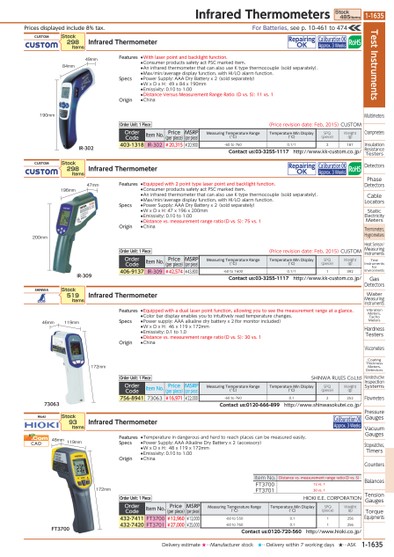 PRICESDISPLAYEDINCLUDE8%TAX.IR-302190MM49MM84MM200MM47MM196MMIR-309119MM172MM7306346MM119MM172MMFT370048MMITEMNO.DISTANCEVS.MEASUREMENTRANGERATIO(DVS.S)FT370012VS.1FT370130VS.1FORBATTERIES,SEEP.10-461TO474CUSTOMINFRAREDTHERMOMETERREPAIRINGOKCALIBURATIONOKSTOCK298ITEMSORDERUNIT:1PIECE(PRICEREVISIONDATE:FEB,2015)CUSTOMORDERCODEITEMNO.PRICE(PERPIECE)MSRP(PERPIECE)MEASURINGTEMPERATURERANGE(°C)TEMPERATUREMINDISPLAY(°C)SPQ(PIECE)WEIGHT(G)403-1318IR-302¥20,315¥20,900-60TO7600.1/12181CONTACTUS:03-3255-1117HTTP://WWW.KK-CUSTOM.CO.JP/CUSTOMINFRAREDTHERMOMETERREPAIRINGOKCALIBURATIONOKSTOCK298ITEMSORDERUNIT:1PIECE(PRICEREVISIONDATE:FEB,2015)CUSTOMORDERCODEITEMNO.PRICE(PERPIECE)MSRP(PERPIECE)MEASURINGTEMPERATURERANGE(°C)TEMPERATUREMINDISPLAY(°C)SPQ(PIECE)WEIGHT(G)406-9137IR-309¥42,574¥43,800-60TO16000.1/11392CONTACTUS:03-3255-1117HTTP://WWW.KK-CUSTOM.CO.JP/SHINWAINFRAREDTHERMOMETERSTOCK519ITEMSORDERUNIT:1PIECESHINWARULESCO.LTDORDERCODEITEMNO.PRICE(PERPIECE)MSRP(PERPIECE)MEASURINGTEMPERATURERANGE(°C)TEMPERATUREMINDISPLAY(°C)SPQ(PIECE)WEIGHT(G)756-894173063¥16,971¥22,000-60TO7600.12252CONTACTUS:0120-666-899HTTP://WWW.SHINWASOKUTEI.CO.JP/HIOKIINFRAREDTHERMOMETERCALIBURATIONOKSTOCK93ITEMSORDERUNIT:1PIECEHIOKIE.E.CORPORATIONORDERCODEITEMNO.PRICE(PERPIECE)MSRP(PERPIECE)MEASURINGTEMPERATURERANGE(°C)TEMPERATUREMINDISPLAY(°C)SPQ(PIECE)WEIGHT(G)432-7411FT3700¥12,960¥12,000-60TO5500.11256432-7420FT3701¥27,000¥25,000-60TO7600.11256CONTACTUS:0120-720-560HTTP://WWW.HIOKI.CO.JP/FEATURES●WITHLASERPOINTANDBACKLIGHTFUNCTION.●CONSUMERPRODUCTSSAFETYACTPSCMARKEDITEM.●ANINFRAREDTHERMOMETERTHATCANALSOUSEKTYPETHERMOCOUPLE(SOLDSEPARATELY).●MAX/MIN/AVERAGEDISPLAYFUNCTION,WITHHI/LOALARMFUNCTION.SPECS●POWERSUPPLY:AAADRYBATTERYX2(SOLDSEPARATELY)●WXDXH:49X84X190MM●EMISSIVITY:0.10TO1.00●DISTANCEVERSUSMEASUREMENTRANGERATIO(DVS.S):11VS.1ORIGIN●CHINAFEATURES●EQUIPPEDWITH2POINTTYPELASERPOINTANDBACKLIGHTFUNCTION.●CONSUMERPRODUCTSSAFETYACTPSCMARKEDITEM.●ANINFRAREDTHERMOMETERTHATCANALSOUSEKTYPETHERMOCOUPLE(SOLDSEPARATELY).●MAX/MIN/AVERAGEDISPLAYFUNCTION,WITHHI/LOALARMFUNCTION.SPECS●POWERSUPPLY:AAADRYBATTERYX2(SOLDSEPARATELY)●WXDXH:47X196X200MM●EMISSIVITY:0.10TO1.00●DISTANCEVS.MEASUREMENTRANGERATIO(DVS.S):75VS.1ORIGIN●CHINAFEATURES●EQUIPPEDWITHADUALLASERPOINTFUNCTION,ALLOWINGYOUTOSEETHEMEASUREMENTRANGEATAGLANCE.●COLORBARDISPLAYENABLESYOUTOINTUITIVELYREADTEMPERATURECHANGES.SPECS●POWERSUPPLY:AAAALKALINEDRYBATTERYX2(FORMONITORINCLUDED)●WXDXH:46X119X172MM●EMISSIVITY:0.1TO1.0●DISTANCEVS.MEASUREMENTRANGERATIO(DVS.S):30VS.1ORIGIN●CHINA.COMCADFEATURES●TEMPERATUREINDANGEROUSANDHARDTOREACHPLACESCANBEMEASUREDEASILY.SPECS●POWERSUPPLY:AAAALKALINEDRYBATTERYX2(ACCESSORY)●WXDXH:48X119X172MM●EMISSIVITY:0.10TO1.00ORIGIN●CHINAAPPROX.3WEEKSAPPROX.3WEEKSAPPROX.3WEEKSTESTINSTRUMENTSMULTIMETERSCRAMPMETERSINSULATIONRESISTANCETESTERSDETECTORSPHASEDETECTORSCABLELOCATORSSTATICELECTRICITYMETERSTHERMOMETERS,HYGROMETERSHEATSENSOR/MEASURINGINSTRUMENTSTESTINSTRUMENTSFORENVIRONMENTSGASDETECTORSWATERMEASURINGINSTRUMENTSVIBRATIONMETERS,TACHOMETERSHARDNESSTESTERSVISCOMETERSCOATINGTHICKNESSMETERS,DETECTORSNONDESTRUCTIVEINSPECTIONSYSTEMSFLOWMETERSPRESSUREGAUGESVACUUMGAUGESSTOPWATCHES,TIMERSCOUNTERSBALANCESTENSIONGAUGESTORQUEEQUIPMENTSINFRAREDTHERMOMETERSSTOCK485ITEMS1-1635*0113051*1-1635DELIVERYESTIMATE★…MANUFACTURERSTOCK★…DELIVERYWITHIN7WORKINGDAYS★…ASK