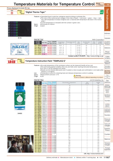 PRICESDISPLAYEDINCLUDE8%TAX.D-1624400EXAMPLENIGK"DIGITALTHERMOTAPE®"ORDERCODEITEMNO.PRICE(PERCASE)MSRP(PERCASE)TEMPERATURERANGE(°C)TEMPERATUREPITCH(°C)SIZE(MM)Q'TYPERCASE(SHEET)SPQ(CASE)WEIGHT(G/CASE)751-5804D-M20¥9,720¥9,000-20TO0210X9230132751-5812D-M6¥9,720¥9,000-6TO14210X9230132751-5766D-06¥9,720¥9,0006TO34210X9230132751-5774D-16¥9,720¥9,00016TO36210X9230132751-5782D-38¥9,720¥9,00038TO58210X9230132751-5791D-50¥9,720¥9,00050TO100510X9230132CONTACTUS:06-7176-5575HTTP://WWW.NICHIGI.CO.JP/LACOTEMPERATUREINSTRUCTIONPAINT"TEMPILAQG"ORDERCODEITEMNO.PRICE(PERPIECE)MSRP(PERPIECE)DISCOLORATIONTEMPERATURE(°C)SPQ(PIECE)WEIGHT(G)761-880824400¥3,456¥4,480791160761-881624401¥3,456¥4,480931160761-882424402¥3,456¥4,4801071160761-883224403¥3,456¥4,4801211160761-884124404¥3,456¥4,4801351160761-885924405¥3,456¥4,4801491160761-886724406¥3,456¥4,4801561160761-887524407¥3,456¥4,4801631160761-888324408¥3,456¥4,4801771160761-889124409¥3,456¥4,4801841160761-890524410¥3,456¥4,4801911160761-891324411¥3,456¥4,4802041160761-892124412¥3,456¥4,4802181160761-893024413¥3,456¥4,4802321160761-894824414¥3,456¥4,4802461160761-895624415¥3,456¥4,4802531160761-896424416¥3,456¥4,4802601160761-897224417¥3,456¥4,4802741160761-898124418¥3,456¥4,4802881160761-899924419¥3,456¥4,4803021160761-900624420¥3,456¥4,4803161160761-901424421¥3,456¥4,4803431160761-902224422¥3,456¥4,4803711160761-903124423¥3,456¥4,4803991160761-904924424¥3,456¥4,4804271160761-905724425¥3,456¥4,4804541160761-906524426¥3,456¥4,4804821160761-907324427¥3,456¥4,4805101160761-908124428¥3,456¥4,4805381160761-909024429¥3,456¥4,4805501160761-910324430¥3,456¥4,4805661160761-911124431¥3,456-5931160761-912024432¥3,456¥4,4806211160761-913824433¥3,456¥4,4806491160761-914624434¥3,456¥4,4806771160761-915424435¥3,456¥4,4807041160761-916224436¥3,456¥4,4807601160761-917124437¥3,456¥4,4807881160761-918924438¥3,456¥4,4808161160761-919724439¥3,456¥4,4808711160761-920124440¥3,456¥4,4809271160761-921924441¥3,456¥4,4809821160761-922724442¥3,456¥4,48010381160URLHTTP://WWW.MARKAL.COM/STOCK86ITEMSSTOCK97ITEMSORDERUNIT:1PIECELA-COINDUSTRIES,INC.ORDERUNIT:1CASENIGKCORPORATIONFEATURES●CAPSULIZEDLIQUIDCRYSTALHASUNDERGONESPECIALPRINTINGONPOLYESTERFILM.●THECOLOROFTHENUMERICALPARTCHANGESINTHEORDEROFBLACK→REDBROWN→GREEN→BLUE→DARKNAVYWITHTEMPERATUREINCREASE.(ORIGINALCOLORISRESTOREDWITHTEMPERATUREDECREASEINTHEREVERSEORDER.)●CURRENTTEMPERATUREISINDICATEDWITHTHENUMBERINGREENCOLOR.SPECS●EXCLUSIVELYFORINDOORSORIGIN●JAPANFEATURES●ACCURATETEMPERATUREOFTHEWORKPIECESURFACECANBEMEASUREDHANDILYATLOWCOST.●THEPAINTBEINGAPPLIEDSOLIDIFIESWHENDRYANDMELTSWHENREACHINGINSTRUCTEDTEMPERATURE.●FORONCE,ITCANBERELEASEDFROMHANDS.●RESULTSCANBECHECKEDAFTERWARDSEVENIFUNABLETOCHECKVISUALLYANDCONFIRMATIONISNOTMADEWHILEREACTIONISINPROGRESS.USE●TEMPERATURECONTROLFORREMAININGHEATANDINTERPASSTEMPERATURECONTROLINWELDING.SPECS●MEASUREMENTPRECISION±1%ORIGIN●USA●COLOROFCONTENTISDIFFERENTDEPENDINGONPRODUCT.WARNINGTESTINSTRUMENTSMULTIMETERSCRAMPMETERSINSULATIONRESISTANCETESTERSDETECTORSPHASEDETECTORSCABLELOCATORSSTATICELECTRICITYMETERSTHERMOMETERS,HYGROMETERSHEATSENSOR/MEASURINGINSTRUMENTSTESTINSTRUMENTSFORENVIRONMENTSGASDETECTORSWATERMEASURINGINSTRUMENTSVIBRATIONMETERS,TACHOMETERSHARDNESSTESTERSVISCOMETERSCOATINGTHICKNESSMETERS,DETECTORSNONDESTRUCTIVEINSPECTIONSYSTEMSFLOWMETERSPRESSUREGAUGESVACUUMGAUGESSTOPWATCHES,TIMERSCOUNTERSBALANCESTENSIONGAUGESTORQUEEQUIPMENTSTEMPERATUREMATERIALSFORTEMPERATURECONTROLSTOCK170ITEMS1-1667*0113360*1-1667DELIVERYESTIMATE★…MANUFACTURERSTOCK★…DELIVERYWITHIN7WORKINGDAYS★…ASK