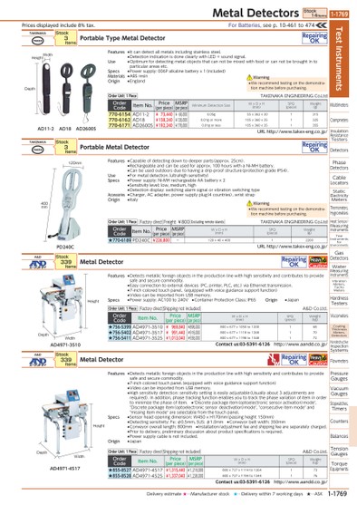 PRICESDISPLAYEDINCLUDE8%TAX.AD4971-3510DEPTHWIDTHHEIGHTAD11-2AD2600SAD18HEIGHTWIDTHDEPTHPD240C120MM400MMFORBATTERIES,SEEP.10-461TO474HEIGHTWIDTHDEPTHAD4971-4517TAKENAKAPORTABLETYPEMETALDETECTORREPAIRINGOKSTOCK3ITEMSORDERUNIT:1PIECETAKENAKAENGINEERINGCO.LTDORDERCODEITEMNO.PRICE(PERPIECE)MSRP(PERPIECE)MINIMUMDETECTIONSIZEWXDXH(MM)SPQ(PIECE)WEIGHT(G)770-6154AD11-2¥73,440¥68,0000.05G55X362X301315770-6162AD18¥138,240¥128,0000.01GORMORE105X360X351325770-6171AD2600S¥192,240¥178,0000.01GORLESS105X360X351355URLHTTP://WWW.TAKEX-ENG.CO.JP/TAKENAKAPORTABLEMETALDETECTORREPAIRINGOKSTOCK3ITEMSORDERUNIT:1PIECEFACTORYDIRECTFREIGHT:¥800EXCLUDINGREMOTEISLANDSTAKENAKAENGINEERINGCO.LTDORDERCODEITEMNO.PRICE(PERPIECE)MSRP(PERPIECE)WXDXH(MM)SPQ(PIECE)WEIGHT(G)★770-6189PD240C¥226,800-120X40X40012200URLHTTP://WWW.TAKEX-ENG.CO.JP/A&DMETALDETECTORREPAIRINGOKHEAVYCAUTIONSTOCK339ITEMSORDERUNIT:1PIECEFACTORYDIRECTSHIPPINGNOTINCLUDEDA&DCO.LTD.ORDERCODEITEMNO.PRICE(PERPIECE)MSRP(PERPIECE)WXDXH(MM)SPQ(PIECE)WEIGHT(KG)★855-8527AD4971-4517¥1,315,440¥1,218,000800X727X1114TO1264173★855-8528AD4971-4525¥1,337,040¥1,238,000800X727X1194TO1344176CONTACTUS:03-5391-6126HTTP://WWW.AANDD.CO.JP/A&DMETALDETECTORREPAIRINGOKHEAVYCAUTIONORDERCODEITEMNO.PRICE(PERPIECE)MSRP(PERPIECE)WXDXH(MM)SPQ(PIECE)WEIGHT(KG)★756-5399AD4971-3510¥969,840¥898,000800X677X1050TO1200168★756-5402AD4971-3517¥991,440¥918,000800X677X1118TO1268170★756-5411AD4971-3525¥1,013,040¥938,000800X677X1198TO1348172CONTACTUS:03-5391-6126HTTP://WWW.AANDD.CO.JP/STOCK339ITEMSORDERUNIT:1PIECEFACTORYDIRECTSHIPPINGNOTINCLUDEDA&DCO.LTD.FEATURES●ITCANDETECTALLMETALSINCLUDINGSTAINLESSSTEEL.●DETECTIONINDICATIONISDONECLEARLYWITHLED+SOUNDSIGNAL.USE●OPTIMUMFORDETECTINGMETALOBJECTSTHATCANNOTBEMIXEDWITHFOODORCANNOTBEBROUGHTINTOPARTICULARAREASETC.SPECS●POWERSUPPLY:006PALKALINEBATTERYX1(INCLUDED)MATERIALS●ABSRESINORIGIN●ENGLANDFEATURES●CAPABLEOFDETECTINGDOWNTODEEPERPARTS(APPROX.25CM).●RECHARGEABLEANDCANBEUSEDFORAPPROX.100HOURSWITHANI-MHBATTERY.●CANBEUSEDOUTDOORSDUETOHAVINGADRIP-PROOFSTRUCTURE(PROTECTIONGRADEIP54).USE●FORMETALDETECTION.(ULTRAHIGHSENSITIVITY)SPECS●POWERSUPPLY:NI-MHRECHARGEABLEAABATTERYX2●SENSITIVITYLEVEL:LOW,MEDIUM,HIGH●DETECTIONDISPLAY:SWITCHINGALARMSIGNALORVIBRATIONSWITCHINGTYPEACCESSORIES●CHARGER,ACADAPTER,POWERSUPPLYPLUG(4COUNTRIES),WRISTSTRAPORIGIN●ITALYFEATURES●DETECTSMETALLICFOREIGNOBJECTSINTHEPRODUCTIONLINEWITHHIGHSENSITIVITYANDCONTRIBUTESTOPROVIDESAFEANDSECURECOMMODITY.●7-INCHCOLOREDTOUCHPANEL.(EQUIPPEDWITHVOICEGUIDANCESUPPORTFUNCTION)●VIDEOCANBEIMPORTEDFROMUSBMEMORY.●HIGHSENSITIVITYDETECTION:SENSITIVITYSETTINGISEASILYADJUSTABLE(USUALLYABOUT3ADJUSTMENTSAREREQUIRED).INADDITION,PHASETRACKINGFUNCTIONENABLESYOUTOTRACKTHEPHASEVARIATIONOFITEMINORDERTOMINIMIZETHEPHASEOFITEM.●"DISCRETEPACKAGEITEM(OPTOELECTRONICSENSORACTIVATION)MODE","DISCRETEPACKAGEITEM(OPTOELECTRONICSENSORDEACTIVATION)MODE","CONSECUTIVEITEMMODE"AND"MISSINGITEMMODE"ARESELECTABLEFROMTHETOUCHPANEL.SPECS●SENSORHEADOPENINGDIMENSION:W450XH170MM(PASSINGHEIGHT150MM)●DETECTINGSENSITIVITY:FE:Φ0.5MM,SUS:Φ1.0MM●CONVEYORBELTWIDTH:350MM●CONVEYOROVERALLLENGTH:800MM●INSTALLATION/ADJUSTMENTFEEANDSHIPPINGFEEARESEPARATELYCHARGED.●PRIORTODELIVERY,PRELIMINARYDISCUSSIONABOUTPRODUCTSPECIFICATIONSISREQUIRED.●POWERSUPPLYCABLEISNOTINCLUDED.ORIGIN●JAPANFEATURES●DETECTSMETALLICFOREIGNOBJECTSINTHEPRODUCTIONLINEWITHHIGHSENSITIVITYANDCONTRIBUTESTOPROVIDESAFEANDSECURECOMMODITY.●EASYCONNECTIONTOEXTERNALDEVICES(PC,PRINTER,PLC,ETC.)VIAETHERNETTRANSMISSION.●7-INCHCOLOREDTOUCHPANEL.(EQUIPPEDWITHVOICEGUIDANCESUPPORTFUNCTION)●VIDEOCANBEIMPORTEDFROMUSBMEMORY.SPECS●POWERSUPPLY:AC100TO240V●CONTAINERPROTECTIONCLASS:IP65ORIGIN●JAPAN●WERECOMMENDTESTINGONTHEDEMONSTRA-TIONMACHINEBEFOREPURCHASING.WARNING●WERECOMMENDTESTINGONTHEDEMONSTRA-TIONMACHINEBEFOREPURCHASING.WARNINGTESTINSTRUMENTSMULTIMETERSCRAMPMETERSINSULATIONRESISTANCETESTERSDETECTORSPHASEDETECTORSCABLELOCATORSSTATICELECTRICITYMETERSTHERMOMETERS,HYGROMETERSHEATSENSOR/MEASURINGINSTRUMENTSTESTINSTRUMENTSFORENVIRONMENTSGASDETECTORSWATERMEASURINGINSTRUMENTSVIBRATIONMETERS,TACHOMETERSHARDNESSTESTERSVISCOMETERSCOATINGTHICKNESSMETERS,DETECTORSNONDESTRUCTIVEINSPECTIONSYSTEMSFLOWMETERSPRESSUREGAUGESVACUUMGAUGESSTOPWATCHES,TIMERSCOUNTERSBALANCESTENSIONGAUGESTORQUEEQUIPMENTSMETALDETECTORSSTOCK14ITEMS1-1769*0114242*1-1769DELIVERYESTIMATE★…MANUFACTURERSTOCK★…DELIVERYWITHIN7WORKINGDAYS★…ASK