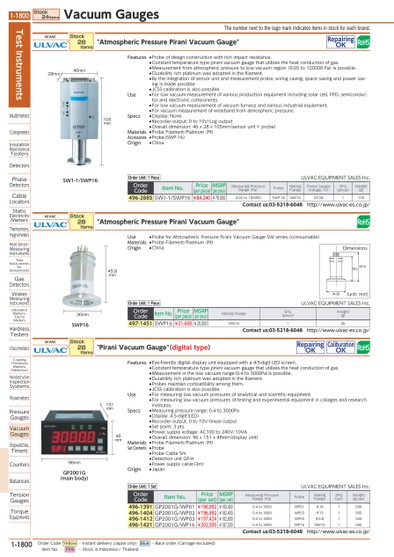 THENUMBERNEXTTOTHELOGOMARKINDICATESITEMSINSTOCKFOREACHBRAND.GP2001G(MAINBODY)96MM48MM151MMSW1-1/SWP16SWP1646MM30MM105MM45.9MM28MMΦ3039.545.9DIMENSIONS(UNIT:MM)ULVAC"ATMOSPHERICPRESSUREPIRANIVACUUMGAUGE"REPAIRINGOKORDERCODEITEMNO.PRICE(PERPIECE)MSRP(PERPIECE)MEASURINGPRESSURERANGE(PA)PROBEMATINGFLANGEPOWERSUPPLYVOLTAGE(V)SPQ(PIECE)WEIGHT(G)496-2885SW1-1/SWP16¥84,240¥78,0000.05TO100000SWP-16NW16DC241150CONTACTUS:03-5218-6048HTTP://WWW.ULVAC-ES.CO.JP/ULVAC"ATMOSPHERICPRESSUREPIRANIVACUUMGAUGE"ORDERCODEITEMNO.PRICE(PERPIECE)MSRP(PERPIECE)MATINGFLANGESPQ(PIECE)WEIGHT(G)497-1451SWP16¥21,600¥20,000NW16126CONTACTUS:03-5218-6048HTTP://WWW.ULVAC-ES.CO.JP/ULVAC"PIRANIVACUUMGAUGE"(DIGITALTYPE)REPAIRINGOKCALIBURATIONOKORDERCODEITEMNO.PRICE(PERSET)MSRP(PERSET)MEASURINGPRESSURERANGE(PA)PROBEMATINGFLANGESPQ(SET)WEIGHT(G/SET)496-1391GP2001G/WP01¥196,992¥182,4000.4TO3000WP01Φ181500496-1404GP2001G/WP02¥196,992¥182,4000.4TO3000WP02Φ151500496-1412GP2001G/WP03¥197,424¥182,8000.4TO3000WP03R3/81500496-1421GP2001G/WP16¥202,500¥187,5000.4TO3000WP16NW161500CONTACTUS:03-5218-6048HTTP://WWW.ULVAC-ES.CO.JP/STOCK28ITEMSSTOCK28ITEMSSTOCK28ITEMSORDERUNIT:1SETULVACEQUIPMENTSALESINC.ORDERUNIT:1PIECEULVACEQUIPMENTSALESINC.ORDERUNIT:1PIECEULVACEQUIPMENTSALESINC.FEATURES●PROBEOFDESIGNCONSTRUCTIONWITHRICHIMPACTRESISTANCE.●CONSTANTTEMPERATURETYPEPIRANIVACUUMGAUGETHATUTILIZESTHEHEATCONDUCTIONOFGAS.●MEASUREMENTFROMATMOSPHERICPRESSURETOLOWVACUUMREGION(0.05TO100000PA)ISPOSSIBLE.●DURABILITYRICHPLATINUMWASADOPTEDINTHEFILAMENT.●BYTHEINTEGRATIONOFSENSORUNITANDMEASUREMENTPROBE,WIRINGSAVING,SPACESAVINGANDPOWERSAV-INGISMADEPOSSIBLE.●JCSSCALIBRATIONISALSOPOSSIBLE.USE●FORLOWVACUUMMEASUREMENTOFVARIOUSPRODUCTIONEQUIPMENTINCLUDINGSOLARCELL,FPD,SEMICONDUC-TORANDELECTRONICCOMPONENTS.●FORLOWVACUUMMEASUREMENTOFVACUUMFURNACEANDVARIOUSINDUSTRIALEQUIPMENT.●FORVACUUMMEASUREMENTOFWIDEBANDFROMATMOSPHERICPRESSURE.SPECS●DISPLAY:NONE●RECORDEROUTPUT:0TO10V/LOGOUTPUT●OVERALLDIMENSION:46X28X105MM(SENSORUNIT+PROBE)MATERIALS●PROBEFILAMENT/PLATINUM(PT)ACCESSORIES●PROBE(SWP-16)ORIGIN●CHINAUSE●PROBEFORATMOSPHERICPRESSUREPIRANIVACUUMGAUGESWSERIES.(COMSUMABLE)MATERIALS●PROBEFILAMENT/PLATINUM(PT)ORIGIN●CHINAFEATURES●EYE-FRIENDLYDIGITALDISPLAYUNITEQUIPPEDWITHA4.5-DIGITLEDSCREEN.●CONSTANTTEMPERATURETYPEPIRANIVACUUMGAUGETHATUTILIZESTHEHEATCONDUCTIONOFGAS.●MEASUREMENTINTHELOWVACUUMRANGE(0.4TO3000PA)ISPOSSIBLE.●DURABILITYRICHPLATINUMWASADOPTEDINTHEFILAMENT.●PROBESMAINTAINCOMPATIBILITYAMONGTHEM.●JCSSCALIBRATIONISALSOPOSSIBLE.USE●FORMEASURINGLOWVACUUMPRESSURESOFANALYTICALANDSCIENTIFICEQUIPMENT.●FORMEASURINGLOWVACUUMPRESSURESOFTESTINGANDEXPERIMENTALEQUIPMENTINCOLLAGESANDRESEARCHINSTITUTES.SPECS●MEASURINGPRESSURERANGE:0.4TO3000PA●DISPLAY:4.5-DIGIT(LED)●RECORDEROUTPUT:0TO10V/LINEAROUTPUT●SETPOINT:3PTS.●POWERSUPPLYVOLTAGE:AC100TO240V/10VA●OVERALLDIMENSION:96X151X48MM(DISPLAYUNIT)MATERIALS●PROBEFILAMENT/PLATINUM(PT)SETCONTENTS●PROBE●PROBECABLE5M●DETECTIONUNITGP-H●POWERSUPPLYCABLE(3M)ORIGIN●JAPANTESTINSTRUMENTSMULTIMETERSCRAMPMETERSINSULATIONRESISTANCETESTERSDETECTORSPHASEDETECTORSCABLELOCATORSSTATICELECTRICITYMETERSTHERMOMETERS,HYGROMETERSHEATSENSOR/MEASURINGINSTRUMENTSTESTINSTRUMENTSFORENVIRONMENTSGASDETECTORSWATERMEASURINGINSTRUMENTSVIBRATIONMETERS,TACHOMETERSHARDNESSTESTERSVISCOMETERSCOATINGTHICKNESSMETERS,DETECTORSNONDESTRUCTIVEINSPECTIONSYSTEMSFLOWMETERSPRESSUREGAUGESVACUUMGAUGESSTOPWATCHES,TIMERSCOUNTERSBALANCESTENSIONGAUGESTORQUEEQUIPMENTSSTOCK24ITEMSVACUUMGAUGES1-1800*0114550*1-1800ORDERCODEYELLOW…INSTANTDELIVERY(JAPANONLY)BLUE…BACKORDER(CARRIAGEEXCLUDED)ITEMNO.PINK…STOCKININDONESIA/THAILAND