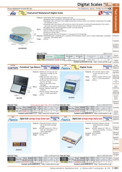 PRICESDISPLAYEDINCLUDE8%TAX.MS-500DS3009DS3010DS01177MM19MM128MMFORBATTERIES,SEEP.10-461TO474UH3000WP74MM140MM161MMA&DDUST-PROOF/WATERPROOFDIGITALSCALEREPAIRINGOKSTOCK339ITEMSORDERUNIT:1PIECEA&DCO.LTD.ORDERCODEITEMNO.PRICE(PERPIECE)MSRP(PERPIECE)MAXWEIGHT(G)MINDISPLAY(G)PLATEDIMENSION(MM)SPQ(PIECE)WEIGHT(G)856-1195UH3000WP¥4,765¥5,00030001APPROX.Φ1501420CONTACTUS:03-5391-6126HTTP://WWW.AANDD.CO.JP/CUSTOMPOCKETBOOKTYPEBALANCEREPAIRINGOKCALIBURATIONOKORDERCODEITEMNO.PRICE(PERPIECE)MSRP(PERPIECE)MAXWEIGHT(KG)MINDISPLAY(G)PLATEDIMENSION(MM)SPQ(PIECE)WEIGHT(G)491-7529MS-500¥2,041¥2,1000.50.176X628120CONTACTUS:03-3255-1117HTTP://WWW.KK-CUSTOM.CO.JP/ASKADIGITALSCALE(POSTAGECHARGEDISPLAYTYPE)REPAIRINGOKORDERCODEITEMNO.PRICE(PERPIECE)MSRP(PERPIECE)MAXWEIGHT(KG)MINSCALE(G)PLATEDIMENSION(MM)SPQ(PIECE)WEIGHT(G)795-5111DS3010¥17,010¥18,00031171X1551750CONTACTUS:03-5690-9412HTTP://WWW.ASMIX.CO.JP/ORDERUNIT:1PIECEASKACORPORATIONORDERUNIT:1PIECE(PRICEREVISIONDATE:FEB,2015)CUSTOMFEATURES●WASHABLE,IP67COMPLIANTWATERPROOFSCALE.●EQUIPPEDWITHAHANDLEFORCARRYING(ATTHEBACKOFMAINBODY).●EQUIPPEDWITHONE-TOUCHTAREWEIGHTSUBTRACTIONFUNCTIONWHICHCANINSTANTLYCOMPENSATETHEWEIGHTOFCONTAINERTOZERO.●EQUIPPEDWITHAUTOPOWEROFFFUNCTIONBYWHICHTHEPOWERISTURNEDOFFAUTOMATICALLYIFTHESCALEISNOTUSED.(ACTIVATION/DEACTIVATIONSETTINGOFTHISFUNCTIONISALSOPOSSIBLE)●EQUIPPEDWITHAREMAININGBATTERYPOWERWARNINGMARKING.SPECS●CERTIFICATION:NOTAPPLICABLE●SENSORMETHOD:LOADCELLMETHOD●PROTECTIONGRADE:IP65●POWERSUPPLY:AADRYCELLBATTERYX2(ACCESSORYFORMONITORING)MATERIALS●ABS(MAINBODY,WEIGHINGPAN),POLYESTERFILM(INDICATIONSHEET),SILICONRUBBER(DIAPHRAGM,WATERTIGHTPACKING),TPE(RUBBERFEET)ORIGIN●CHINAFEATURES●MINIMUMOF0.1GUNITANDMAXIMUMOF500GCANBEMEASURED.●HIGHPRECISIONWITHONLY±0.5GOFMEASUREMENTERROR.●APOCKETSIZEANDCONVEN-IENTFORCARRYING.●EASYTOSEEWITHABLUEBACKLIGHT.SPECS●CERTIFICATION:NOTAPPLICABLE●SENSORMETHOD:LOADCELLMETHOD●POWERSUPPLY:AAADRYBAT-TERYX2(SOLDSEPARATELY)ORIGIN●CHINAFEATURES●SPEEDILYDISPLAYSINTERNA-TIONAL/DOMESTICPOSTAGECHARGE.SPECS●POWERSUPPLY:AC100VORAAADRYCELLBATTERYX4(SOLDSEPARATELY)ACCESSORIES●ACADAPTERORIGIN●CHINAAPPROX.1MONTHASKADIGITALSCALEREPAIRINGOKSTOCK45ITEMSORDERCODEITEMNO.PRICE(PERPIECE)MSRP(PERPIECE)MAXWEIGHT(KG)MINSCALE(G)PLATEDIMENSION(MM)SPQ(PIECE)WEIGHT(G)795-5103DS3009¥7,371¥7,80031143X1331436CONTACTUS:03-5690-9412HTTP://WWW.ASMIX.CO.JP/ASKADIGITALSCALE(POSTAGECHARGEDISPLAYTYPE)REPAIRINGOKORDERCODEITEMNO.PRICE(PERPIECE)MSRP(PERPIECE)MAXWEIGHT(KG)MINSCALE(G)PLATEDIMENSION(MM)SPQ(PIECE)WEIGHT(KG)795-5090DS011¥23,436¥24,800101194X25311.2CONTACTUS:03-5690-9412HTTP://WWW.ASMIX.CO.JP/ORDERUNIT:1PIECEASKACORPORATIONORDERUNIT:1PIECEASKACORPORATIONFEATURES●ANOVERSIZELIQUIDCRYSTALSCREENANDEASYTOSEESCALE.SPECS●POWERSUPPLY:AAADRYBAT-TERYX2(SOLDSEPARATELY)ORIGIN●CHINAFEATURES●SPEEDILYDISPLAYSINTERNA-TIONAL/DOMESTICPOSTAGECHARGE.SPECS●POWERSUPPLY:AC100VORAADRYCELLBATTERYX4(SOLDSEPARATELY)ACCESSORIES●ACADAPTERORIGIN●CHINATESTINSTRUMENTSMULTIMETERSCRAMPMETERSINSULATIONRESISTANCETESTERSDETECTORSPHASEDETECTORSCABLELOCATORSSTATICELECTRICITYMETERSTHERMOMETERS,HYGROMETERSHEATSENSOR/MEASURINGINSTRUMENTSTESTINSTRUMENTSFORENVIRONMENTSGASDETECTORSWATERMEASURINGINSTRUMENTSVIBRATIONMETERS,TACHOMETERSHARDNESSTESTERSVISCOMETERSCOATINGTHICKNESSMETERS,DETECTORSNONDESTRUCTIVEINSPECTIONSYSTEMSFLOWMETERSPRESSUREGAUGESVACUUMGAUGESSTOPWATCHES,TIMERSCOUNTERSBALANCESTENSIONGAUGESTORQUEEQUIPMENTSDIGITALSCALESSTOCK482ITEMS1-1851*0114862*1-1851DELIVERYESTIMATE★…MANUFACTURERSTOCK★…DELIVERYWITHIN7WORKINGDAYS★…ASK