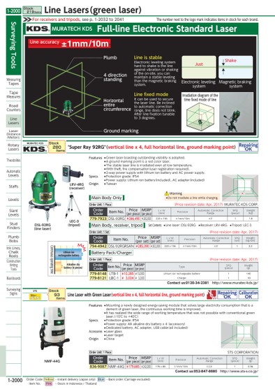 THENUMBERNEXTTOTHELOGOMARKINDICATESITEMSINSTOCKFOREACHBRAND.LINEACCURACYPLUMBELECTRONICLEVELINGSYSTEMSHAKEJUSTMAGNETICBRAKINGSYSTEMELECTRONICLEVELINGSYSTEMHARDTOSHAKEISTHELINEAGAINSTVIBRATIONORSHAKINGOFTHEON-SITE,YOUCANMAINTAINASTABLELEVELINGTHANTHEMAGNETICBRAKINGSYSTEM.LINEISSTABLEITCANBEUSEDTOSECURETHELASERLINE.BEINCLINEDTOAUTOMATICCORRECTIONRANGE,LINEDOESNOTBLINK.AFTERLINEfiXATIONTUNABLETO3DEGREES.LINEfiXEDMODEHORIZONTALENTIRECIRCUMFERENCEGROUNDMARKING4DIRECTIONSTANDINGIRRADIATIONDIAGRAMOFTHETIMEfiXEDMODEOFLINEDSL-92RG(LINELASER)NMF-44GLEC-3(TRIPOD)MURATECHKDSFULL-LINEELECTRONICSTANDARDLASERLITHIUMIONRECHARGEABLEBATTERYALKALINEDRYBATTERY(4PIECES)CONTINUOUSOPERATINGTIMECONTINUOUSOPERATINGTIMEFORRECEIVERSANDTRIPODS,SEEP.1-2032TO2041LRV-4RG(RECEIVER)STSLINELASERWITHGREENLASER(VERTICALLINEX4,FULLHORIZONTALLINE,GROUNDMARKINGPOINT)REPAIRINGOKCALIBURATIONOKSTOCK93ITEMSORDERUNIT:1PIECESTSCORPORATIONORDERCODEITEMNO.PRICE(PERPIECE)MSRP(PERPIECE)LXW(MM)PRECISIONAUTOMATICCORRECTIONRANGESPQ(PIECE)WEIGHT(G)836-9087NMF-44G¥179,685¥242,000178X88±1MM/10M±2.5°10.96CONTACTUS:052-847-8880HTTP://WWW.STS-S.CO.JP/MURATECKDS"SUPERRAY92RG"(VERTICALLINEX4,FULLHORIZONTALLINE,GROUNDMARKINGPOINT)REPAIRINGOKORDERCODEITEMNO.PRICE(PERPIECE)MSRP(PERPIECE)TYPESPQ(PIECE)WEIGHT(G)779-8148LTB-1¥12,285¥13,000LITHIUMIONRECHARGEABLEBATTERY1140779-8121LBC-1¥3,024¥3,200CHARGER192CONTACTUS:0120-34-2381HTTP://WWW.MURATEC-KDS.JP/ORDERCODEITEMNO.PRICE(PERSET)MSRP(PERSET)LXW(MM)PRECISIONAUTOMATICCORRECTIONRANGESPQ(SET)WEIGHT(KG/SET)794-4942DSL-92RGRSAN¥285,390¥302,000220X156±1MM/10M±3°13.3ORDERCODEITEMNO.PRICE(PERPIECE)MSRP(PERPIECE)LXW(MM)PRECISIONAUTOMATICCORRECTIONRANGESPQ(PIECE)WEIGHT(KG)779-7923DSL-92RG¥266,490¥282,000220X156±1MM/10M±3°11.8STOCK280ITEMSORDERUNIT:1PIECE(PRICEREVISIONDATE:APR,2017)MURATEC-KDSCORP.ORDERUNIT:1SET(PRICEREVISIONDATE:APR,2017)ORDERUNIT:1PIECE(PRICEREVISIONDATE:APR,2017)FEATURES●MOUNTINGANEWLYDESIGNEDENERGY-SAVINGMODULETHATSOLVESLARGEELECTRICITYCONSUMPTIONTHATISADEMERITOFGREENLASER,THECONTINUOUSWORKINGTIMEISIMPROVED.●ITHASREALIZEDTHEWIDERANGEOFWORKINGTEMPERATURETHATWASNOTPOSSIBLEWITHCONVENTIONALGREENLASER.(-10℃TO+40℃)SPECS●PROTECTIONGRADE:IP54●POWERSUPPLY:AAALKALINEDRYBATTERYX4(ACCESSORY)●DEDICATEDBATTERY,ACADAPTER,USBCABLE(ALLINCLUDED)ACCESSORIES●LASERGLASS●LASERTARGETORIGIN●CHINAFEATURES●GREENLASERBOASTINGOUTSTANDINGVISIBILITYISADOPTED.●AGROUNDMARKINGPOINTISAREDCOLORLASER.●THESTABLELASERLINEISIRRADIATEDEVENATLOWTEMPERATURE.●WITHTHEFT,FIRECOMPENSATION(USERREGISTRATIONREQUIRED).●2-WAYPOWERSUPPLYWITHLITHIUMIONBATTERYANDACPOWERSUPPLY.SPECS●PROTECTIONGRADE:IP54●POWERSUPPLY:LITHIUMIONBATTERY(INCLUDED),ACADAPTER(INCLUDED)ORIGIN●TAIWANMAINBODYONLYSETCONTENTS●LINELASER:DSL-92RG●RECEIVER:LRV-4RG●TRIPOD:LEC-3MAINBODY,RECEIVER,TRIPODBATTERYPACK/CHARGER●DONOTIRRADIATEALINEWHILECHARGING.WARNINGSURVEYINGTOOLSMEASURINGTAPESTAPEMEASURESROADCOUNTERSLINELASERSLASERDISTANCEMETERSROTARYLASERSTHEODOLITESAUTOMATICLEVELSSTAFFSLEVELSSLANTLEVELSSTUDFINDERSPLUMBBOBSINKLINES,CHALKREELSCONSTRUCTIONWRITINGTOOLSBLACKBOARDSSURVEYINGSIGNSSTOCK219ITEMSLINELASERS(GREENLASER)1-2000*0422161*1-2000ORDERCODEYELLOW…INSTANTDELIVERY(JAPANONLY)BLUE…BACKORDER(CARRIAGEEXCLUDED)ITEMNO.PINK…STOCKININDONESIA/THAILAND