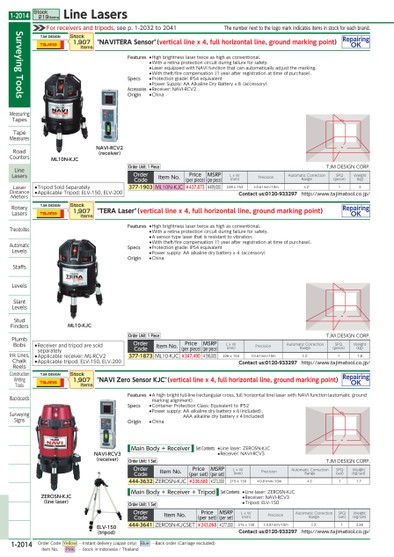 THENUMBERNEXTTOTHELOGOMARKINDICATESITEMSINSTOCKFOREACHBRAND.NAVI-RCV2(RECEIVER)ML10N-KJC●TRIPODSOLDSEPARATELY●APPLICABLETRIPOD:ELV-150,ELV-200ML10-KJC●RECEIVERANDTRIPODARESOLDSEPARATELY●APPLICABLERECEIVER:ML-RCV2●APPLICABLETRIPOD:ELV-150,ELV-200ZEROSN-KJC(LINELASER)NAVI-RCV3(RECEIVER)ELV-150(TRIPOD)FORRECEIVERSANDTRIPODS,SEEP.1-2032TO2041TJMDESIGN"NAVITERASENSOR"(VERTICALLINEX4,FULLHORIZONTALLINE,GROUNDMARKINGPOINT)REPAIRINGOKORDERCODEITEMNO.PRICE(PERPIECE)MSRP(PERPIECE)LXW(MM)PRECISIONAUTOMATICCORRECTIONRANGESPQ(PIECE)WEIGHT(KG)377-1903ML10N-KJC¥437,873¥499,000228X152±0.61MM/10M±2°12CONTACTUS:0120-933297HTTP://WWW.TAJIMATOOL.CO.JP/TJMDESIGN"TERALASER"(VERTICALLINEX4,FULLHORIZONTALLINE,GROUNDMARKINGPOINT)REPAIRINGOKORDERCODEITEMNO.PRICE(PERPIECE)MSRP(PERPIECE)LXW(MM)PRECISIONAUTOMATICCORRECTIONRANGESPQ(PIECE)WEIGHT(KG)377-1873ML10-KJC¥347,490¥396,000226X154±0.61MM/10M±2°11.8CONTACTUS:0120-933297HTTP://WWW.TAJIMATOOL.CO.JP/TJMDESIGN"NAVIZEROSENSORKJC"(VERTICALLINEX4,FULLHORIZONTALLINE,GROUNDMARKINGPOINT)REPAIRINGOKORDERCODEITEMNO.PRICE(PERSET)MSRP(PERSET)LXW(MM)PRECISIONAUTOMATICCORRECTIONRANGESPQ(SET)WEIGHT(KG/SET)444-3641ZEROSN-KJCSET¥243,068¥277,000215X130±0.81MM/10M±2°13.38CONTACTUS:0120-933297HTTP://WWW.TAJIMATOOL.CO.JP/ORDERCODEITEMNO.PRICE(PERSET)MSRP(PERSET)LXW(MM)PRECISIONAUTOMATICCORRECTIONRANGESPQ(SET)WEIGHT(KG/SET)444-3632ZEROSN-KJC¥238,680¥272,000215X130±0.81MM/10M±2°11.7STOCK1,907ITEMSSTOCK1,907ITEMSSTOCK1,907ITEMSORDERUNIT:1SETTJMDESIGNCORP.ORDERUNIT:1SETORDERUNIT:1PIECETJMDESIGNCORP.ORDERUNIT:1PIECETJMDESIGNCORP.FEATURES●HIGHBRIGHTNESSLASERTWICEASHIGHASCONVENTIONAL.●WITHARETINAPROTECTIONCIRCUITDURINGFAILUREFORSAFETY.●LASEREQUIPPEDWITHNAVIFUNCTIONTHATCANAUTOMATICALLYADJUSTTHEMARKING.●WITHTHEFT/FIRECOMPENSATION(1YEARAFTERREGISTRATIONATTIMEOFPURCHASE).SPECS●PROTECTIONGRADE:IP54EQUIVALENT●POWERSUPPLY:AAALKALINEDRYBATTERYX8(ACCESSORY)ACCESSORIES●RECEIVER:NAVI-RCV2ORIGIN●CHINAFEATURES●HIGHBRIGHTNESSLASERTWICEASHIGHASCONVENTIONAL.●WITHARETINAPROTECTIONCIRCUITDURINGFAILUREFORSAFETY.●ASENSORTYPELASERTHATISRESISTANTTOVIBRATION.●WITHTHEFT/FIRECOMPENSATION(1YEARAFTERREGISTRATIONATTIMEOFPURCHASE).SPECS●PROTECTIONGRADE:IP54EQUIVALENT●POWERSUPPLY:AAALKALINEDRYBATTERYX4(ACCESSORY)ORIGIN●CHINAFEATURES●AHIGHBRIGHTFULL-LINE(RECTANGULARCROSS,FULLHORIZONTALLINE)LASERWITHNAVIFUNCTION(AUTOMATICGROUNDMARKINGALIGNMENT).SPECS●CONTAINERPROTECTIONCLASS:EQUIVALENTTOIP52●POWERSUPPLY:AAALKALINEDRYBATTERYX6(INCLUDED),AAAALKALINEDRYBATTERYX4(INCLUDED)ORIGIN●CHINASETCONTENTS●LINELASER:ZEROSN-KJC●RECEIVER:NAVI-RCV3MAINBODY+RECEIVERSETCONTENTS●LINELASER:ZEROSN-KJC●RECEIVER:NAVI-RCV3●TRIPOD:ELV-150MAINBODY+RECEIVER+TRIPODSURVEYINGTOOLSMEASURINGTAPESTAPEMEASURESROADCOUNTERSLINELASERSLASERDISTANCEMETERSROTARYLASERSTHEODOLITESAUTOMATICLEVELSSTAFFSLEVELSSLANTLEVELSSTUDFINDERSPLUMBBOBSINKLINES,CHALKREELSCONSTRUCTIONWRITINGTOOLSBLACKBOARDSSURVEYINGSIGNSSTOCK219ITEMSLINELASERS1-2014*0422221*1-2014ORDERCODEYELLOW…INSTANTDELIVERY(JAPANONLY)BLUE…BACKORDER(CARRIAGEEXCLUDED)ITEMNO.PINK…STOCKININDONESIA/THAILAND