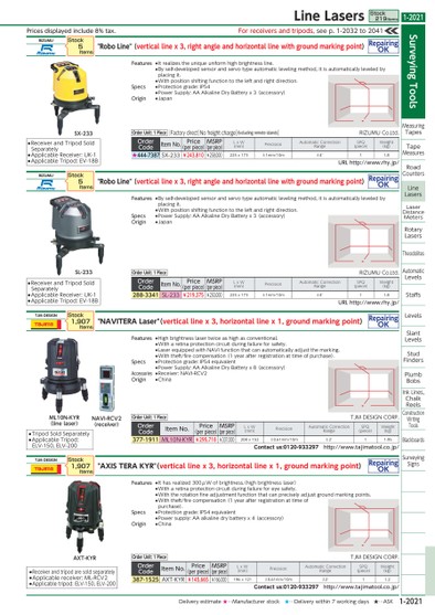PRICESDISPLAYEDINCLUDE8%TAX.SX-233SL-233●RECEIVERANDTRIPODSOLDSEPARATELY●APPLICABLERECEIVER:UK-1●APPLICABLETRIPOD:EV-18B●RECEIVERANDTRIPODSOLDSEPARATELY●APPLICABLERECEIVER:UK-1●APPLICABLETRIPOD:EV-18BML10N-KYR(LINELASER)NAVI-RCV2(RECEIVER)●TRIPODSOLDSEPARATELY●APPLICABLETRIPOD:ELV-150,ELV-200AXT-KYR●RECEIVERANDTRIPODARESOLDSEPARATELY●APPLICABLERECEIVER:ML-RCV2●APPLICABLETRIPOD:ELV-150,ELV-200FORRECEIVERSANDTRIPODS,SEEP.1-2032TO2041RIZUMU"ROBOLINE"(VERTICALLINEX3,RIGHTANGLEANDHORIZONTALLINEWITHGROUNDMARKINGPOINT)REPAIRINGOKORDERCODEITEMNO.PRICE(PERPIECE)MSRP(PERPIECE)LXW(MM)PRECISIONAUTOMATICCORRECTIONRANGESPQ(PIECE)WEIGHT(KG)★444-7387SX-233¥243,810¥258,000225X173±1MM/10M±4°11.8URLHTTP://WWW.RHY.JP/RIZUMU"ROBOLINE"(VERTICALLINEX3,RIGHTANGLEANDHORIZONTALLINEWITHGROUNDMARKINGPOINT)REPAIRINGOKORDERCODEITEMNO.PRICE(PERPIECE)MSRP(PERPIECE)LXW(MM)PRECISIONAUTOMATICCORRECTIONRANGESPQ(PIECE)WEIGHT(KG)288-3341SL-233¥219,375¥250,000225X173±1MM/10M±4°11.8URLHTTP://WWW.RHY.JP/TJMDESIGN"NAVITERALASER"(VERTICALLINEX3,HORIZONTALLINEX1,GROUNDMARKINGPOINT)REPAIRINGOKORDERCODEITEMNO.PRICE(PERPIECE)MSRP(PERPIECE)LXW(MM)PRECISIONAUTOMATICCORRECTIONRANGESPQ(PIECE)WEIGHT(KG)377-1911ML10N-KYR¥295,718¥337,000208X152±0.61MM/10M±2°11.95CONTACTUS:0120-933297HTTP://WWW.TAJIMATOOL.CO.JP/TJMDESIGN"AXISTERAKYR"(VERTICALLINEX3,HORIZONTALLINEX1,GROUNDMARKINGPOINT)REPAIRINGOKORDERCODEITEMNO.PRICE(PERPIECE)MSRP(PERPIECE)LXW(MM)PRECISIONAUTOMATICCORRECTIONRANGESPQ(PIECE)WEIGHT(KG)387-1525AXT-KYR¥145,665¥166,000196X121±0.61MM/10M±2°11.2CONTACTUS:0120-933297HTTP://WWW.TAJIMATOOL.CO.JP/STOCK1,907ITEMSSTOCK1,907ITEMSSTOCK5ITEMSSTOCK5ITEMSORDERUNIT:1PIECETJMDESIGNCORP.ORDERUNIT:1PIECETJMDESIGNCORP.ORDERUNIT:1PIECERIZUMUCO.LTD.ORDERUNIT:1PIECEFACTORYDIRECTNOFREIGHTCHARGEEXCLUDINGREMOTEISLANDSRIZUMUCO.LTD.FEATURES●ITREALIZESTHEUNIQUEUNIFORMHIGHBRIGHTNESSLINE.●BYSELF-DEVELOPEDSENSORANDSERVOTYPEAUTOMATICLEVELINGMETHOD,ITISAUTOMATICALLYLEVELEDBYPLACINGIT.●WITHPOSITIONSHIFTINGFUNCTIONTOTHELEFTANDRIGHTDIRECTION.SPECS●PROTECTIONGRADE:IP54●POWERSUPPLY:AAALKALINEDRYBATTERYX3(ACCESSORY)ORIGIN●JAPANFEATURES●BYSELF-DEVELOPEDSENSORANDSERVOTYPEAUTOMATICLEVELINGMETHOD,ITISAUTOMATICALLYLEVELEDBYPLACINGIT.●WITHPOSITIONSHIFTINGFUNCTIONTOTHELEFTANDRIGHTDIRECTION.SPECS●POWERSUPPLY:AAALKALINEDRYBATTERYX3(ACCESSORY)ORIGIN●JAPANFEATURES●HIGHBRIGHTNESSLASERTWICEASHIGHASCONVENTIONAL.●WITHARETINAPROTECTIONCIRCUITDURINGFAILUREFORSAFETY.●LASEREQUIPPEDWITHNAVIFUNCTIONTHATCANAUTOMATICALLYADJUSTTHEMARKING.●WITHTHEFT/FIRECOMPENSATION(1YEARAFTERREGISTRATIONATTIMEOFPURCHASE).SPECS●PROTECTIONGRADE:IP54EQUIVALENT●POWERSUPPLY:AAALKALINEDRYBATTERYX8(ACCESSORY)ACCESSORIES●RECEIVER:NAVI-RCV2ORIGIN●CHINAFEATURES●ITHASREALIZED300ΜWOFBRIGHTNESS.(HIGHBRIGHTNESSLASER)●WITHARETINAPROTECTIONCIRCUITDURINGFAILUREFOREYESAFETY.●WITHTHEROTATIONFINEADJUSTMENTFUNCTIONTHATCANPRECISELYADJUSTGROUNDMARKINGPOINTS.●WITHTHEFT/FIRECOMPENSATION(1YEARAFTERREGISTRATIONATTIMEOFPURCHASE).SPECS●PROTECTIONGRADE:IP54EQUIVALENT●POWERSUPPLY:AAALKALINEDRYBATTERYX4(ACCESSORY)ORIGIN●CHINASURVEYINGTOOLSMEASURINGTAPESTAPEMEASURESROADCOUNTERSLINELASERSLASERDISTANCEMETERSROTARYLASERSTHEODOLITESAUTOMATICLEVELSSTAFFSLEVELSSLANTLEVELSSTUDFINDERSPLUMBBOBSINKLINES,CHALKREELSCONSTRUCTIONWRITINGTOOLSBLACKBOARDSSURVEYINGSIGNSLINELASERSSTOCK219ITEMS1-2021*0422280*1-2021DELIVERYESTIMATE★…MANUFACTURERSTOCK★…DELIVERYWITHIN7WORKINGDAYS★…ASK