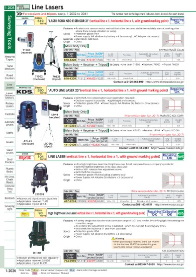 THENUMBERNEXTTOTHELOGOMARKINDICATESITEMSINSTOCKFOREACHBRAND.LEC-2M(TRIPOD)LRV-4(RECEIVER)ATL-23(LINELASER)●RECEIVERANDTRIPODARESOLDSEPARATELY●APPLICABLERECEIVER:SS-50Z●APPLICABLETRIPOD:EL-CMSF-11R●RECEIVERANDTRIPODARESOLDSEPARATELY●APPLICABLERECEIVER:TL-RE●APPLICABLETRIPOD:LET-B219302FORRECEIVERSANDTRIPODS,SEEP.1-2032TO204171502(LINELASER)76629(TRIPOD)71500(RECEIVER)SHINWA"LASERROBONEOESENSOR21"(VERTICALLINEX1,HORIZONTALLINEX1,WITHGROUNDMARKINGPOINT)REPAIRINGOKORDERCODEITEMNO.PRICE(PERPIECE)MSRP(PERPIECE)LXW(MM)PRECISIONAUTOMATICCORRECTIONRANGESPQ(PIECE)WEIGHT(KG)818-420871502¥73,131¥79,000190X128±1MM/7.5M±3°11.25ORDERCODEITEMNO.PRICE(PERSET)MSRP(PERSET)LXW(MM)PRECISIONAUTOMATICCORRECTIONRANGESPQ(SET)WEIGHT(KG/SET)818-420971512¥94,423¥102,000190X128±1MM/7.5M±3°12.79CONTACTUS:0120-666-899HTTP://WWW.SHINWASOKUTEI.CO.JP/MURATECKDS"AUTOLINELASER23"(VERTICALLINEX1,HORIZONTALLINEX1,WITHGROUNDMARKINGPOINT)REPAIRINGOKORDERCODEITEMNO.PRICE(PERSET)MSRP(PERSET)LXW(MM)PRECISIONAUTOMATICCORRECTIONRANGESPQ(SET)WEIGHT(KG/SET)441-0408ATL-23RSA¥52,920¥56,000100X160±1MM/10M±4°12.47CONTACTUS:0120-34-2381HTTP://WWW.MURATEC-KDS.JP/ORDERCODEITEMNO.PRICE(PERPIECE)MSRP(PERPIECE)LXW(MM)PRECISIONAUTOMATICCORRECTIONRANGESPQ(PIECE)WEIGHT(KG)441-0394ATL-23¥37,800¥40,000100X160±1MM/10M±4°10.8STSHIGHBRIGHTNESSLINELASER(VERTICALLINEX1,HORIZONTALLINEX1,WITHGROUNDMARKINGPOINT)REPAIRINGOKCALIBURATIONOKORDERCODEITEMNO.PRICE(PERPIECE)MSRP(PERPIECE)LXW(MM)PRECISIONAUTOMATICCORRECTIONRANGESPQ(PIECE)WEIGHT(KG)754-5959SF-11R¥36,977¥49,800165X90±1MM/10M±3°10.8CONTACTUS:052-847-8880HTTP://WWW.STS-S.CO.JP/MYZOXLINELASER(VERTICALLINEX1,HORIZONTALLINEX1,WITHGROUNDMARKINGPOINT)REPAIRINGOKORDERCODEITEMNO.PRICE(PERPIECE)MSRP(PERPIECE)LXW(MM)PRECISIONAUTOMATICCORRECTIONRANGESPQ(PIECE)WEIGHT(G)487-2274219302¥33,750¥65,000165X115±1MM/7MBLINKINGAT±2.1°ORMORE1870CONTACTUS:0561-62-8151HTTP://WWW.MYZOX.CO.JP/STOCK104ITEMSSTOCK93ITEMSSTOCK280ITEMSSTOCK519ITEMSORDERUNIT:1PIECE(PRICEREVISIONDATE:MAR,2017)MYZOXCO.LTD.ORDERUNIT:1PIECESTSCORPORATIONORDERUNIT:1PIECE(PRICEREVISIONDATE:APR,2017)MURATEC-KDSCORP.ORDERUNIT:1SET(PRICEREVISIONDATE:APR,2017)ORDERUNIT:1SETORDERUNIT:1PIECESHINWARULESCO.LTDFEATURES●ANELECTRONICSENSOR+MOTORMETHODTHATALINEBECOMESSTABLEIMMEDIATELYEVENATWORKINGSITESWHERETHEREISLARGEVIBRATIONORSWING.SPECS●PROTECTIONGRADE:IP54●POWERSUPPLY:AAALKALINEDRYBATTERYX4(ACCESSORY),ACADAPTER(ACCESSORY)MATERIALS●MAINBODY:ABSRESINORIGIN●CHINAMAINBODYONLYSETCONTENTS●LINELASER:71502●RECEIVER:71500●TRIPOD:76629MAINBODY+RECEIVER+TRIPODMAINBODYONLYSETCONTENTS●LINELASER:ATL-23●RECEIVER:LRV-4●TRIPOD:LEC-2MMAINBODY+RECEIVER+TRIPODFEATURES●WITHTHEFT,FIRECOMPENSATION(USERREGISTRATIONREQUIRED).●OUTDOORSUPPORTISPOSSIBLE.●LIGHTWEIGHTANDCOMPACT.SPECS●PROTECTIONGRADE:IP54●POWERSUPPLY:AAALKALINEDRYBATTERYX3(ACCESSORY)ORIGIN●CHINAFEATURES●ASAFETYDESIGNTHATHASTHEWIDECORRECTIONRANGEOF±3°ANDNOTIFIESBYBLINKINGLIGHTIFEXCEEDINGTHECORRECTIONRANGE.●ANENDLESSFINEADJUSTMENTSCREWISADOPTED,WHICHHASNOLIMITIFROTATINGANYTIMES.●WITHTHEFT/FIREINSURANCE(1YEARFROMPURCHASE)SPECS●PROTECTIONGRADE:IP54●POWERSUPPLY:AAALKALINEDRYBATTERYX4(ACCESSORY)ORIGIN●CHINA●WHENPURCHASINGARECEIVER,SELECTOURRECEIVERFORTHELINELASERSS-50Z.(ARECEIVERFORGREENLASERSS-30GCANNOTRECEIVEAREDLASER.)WARNINGFEATURES●ULTRAHIGHBRIGHTNESSLASERLINE.(BRIGHTNESSOVER2-FOLD:COMPAREDTOOURCOMPANY'SPRODUCTS)●WITHTHEHIGHESTBRIGHTNESSINITSCLASS.(CLASS2M)●WITHA360°ROTATIONFINEADJUSTMENTSCREW.●WITHTHEFT/FIREINSURANCE.SPECS●PROTECTIONGRADE:IP54(EXCLUDINGABATTERYBOX)●POWERSUPPLY:AAALKALINEDRYBATTERYX3(ACCESSORY)ORIGIN●CHINASURVEYINGTOOLSMEASURINGTAPESTAPEMEASURESROADCOUNTERSLINELASERSLASERDISTANCEMETERSROTARYLASERSTHEODOLITESAUTOMATICLEVELSSTAFFSLEVELSSLANTLEVELSSTUDFINDERSPLUMBBOBSINKLINES,CHALKREELSCONSTRUCTIONWRITINGTOOLSBLACKBOARDSSURVEYINGSIGNSSTOCK219ITEMSLINELASERS1-2026*0422330*1-2026ORDERCODEYELLOW…INSTANTDELIVERY(JAPANONLY)BLUE…BACKORDER(CARRIAGEEXCLUDED)ITEMNO.PINK…STOCKININDONESIA/THAILAND