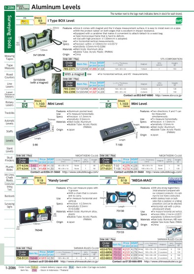 THENUMBERNEXTTOTHELOGOMARKINDICATESITEMSINSTOCKFOREACHBRAND.LENGTHTHICKNESSHEIGHTS-90SV120VMSV150VM(WITHAMAGNET)T-100LENGTHTHICKNESSHEIGHT7313373130HEIGHTLENGTHEXAMPLE22MM120MM50MM46MM20MM76048100MMSTSITYPEBOXLEVELORDERCODEITEMNO.PRICE(PERPIECE)MSRP(PERPIECE)LXHXTHICKNESS(MM)MAGNETSPQ(PIECE)WEIGHT(G)785-2371SV120VM¥1,055¥1,520120X50X221PLACE1100ORDERCODEITEMNO.PRICE(PERPIECE)MSRP(PERPIECE)LXHXTHICKNESS(MM)MAGNETSPQ(PIECE)WEIGHT(G)785-2380SV150VM¥1,389¥2,000150X50X222PLACES1130785-2398SV200VM¥1,527¥2,200200X50X222PLACES1150CONTACTUS:052-847-8880HTTP://WWW.STS-S.CO.JP/SKMINILEVELORDERCODEITEMNO.PRICE(PERPIECE)MSRP(PERPIECE)LXHXTHICKNESS(MM)MAGNETSPQ(PIECE)WEIGHT(G)377-6336S-65¥1,188¥1,10065X20X14NONE140377-6344S-90¥1,458¥1,35090X20X14NONE150CONTACTUS:0256-31-5660HTTP://WWW.SOKUTEIKOUGU.COM/SHINWA"HANDYLEVEL"ORDERCODEITEMNO.PRICE(PERPIECE)MSRP(PERPIECE)LXHXTHICKNESS(MM)MAGNETSPQ(PIECE)WEIGHT(G)756-913176048¥1,813¥2,350100X46X202687CONTACTUS:0120-666-899HTTP://WWW.SHINWASOKUTEI.CO.JP/STOCK519ITEMSSTOCK1,103ITEMSSTOCK93ITEMSORDERUNIT:1PIECESHINWARULESCO.LTDORDERUNIT:1PIECENIIGATASEIKICO.LTD.ORDERUNIT:1PIECEORDERUNIT:1PIECESTSCORPORATIONFEATURES●SINCEITCOMESWITHMAGNETANDTHEV-SHAPEMEASUREMENTSURFACE,ITISEASYTOINSTALLEVENONAPIPE.●WITHTHEPROTECTRUBBERONBOTHEDGESTHATISEXCELLENTINIMPACTRESISTANCE.●EQUIPPEDWITHACARABINERTHATMAKESITCONVENIENTTOATTACH/DETACHTOAWAISTBAG.●ITYPEMONOCOQUEFRAMETHATISHARDTODEFORM.●AVIALWITHHIGHPRECISION±1.00MM/MISADOPTED.USE●FORHORIZONTAL/VERTICALMEASUREMENTS.SPECS●PRECISION:WITHIN±1.00MM/M=±0.0573°●SENSITIVITY:0.5MM/M=0.0286°MATERIALS●MAINBODY:ALUMINUMALLOY●BUBBLETUBE:ACRYLICPLASTIC(PMMA)ORIGIN●CHINAUSE●FORHORIZONTAL/VERTICAL,AND45°MEASUREMENTS.WITHAMAGNETFEATURES●ALUMINUMPOCKETLEVEL.USE●TOMEASUREHORIZONTALLY.SPECS●PRECISION:±1.5MM/M●SENSITIVITY:0.5MM/MMATERIALS●MAINBODY:ALUMINUM●BUBBLETUBE:ACRYLICPLASTIC(PMMA)ORIGIN●JAPANFEATURES●YOUCANMEASUREPIPESWITHVGROOVE.●WITHACHAINTHATISCONVEN-IENTTOCARRY.USE●FORMEASUREHORIZONTALANDVERTICAL.SPECS●PRECISION:±2.5MM/M●SENSITIVITY:0.5MM/M=0.0286°MATERIALS●MAINBODY:ALUMINUMALLOY,PLASTIC●BUBBLETUBE:ACRYLICPLASTIC(PMMA)ORIGIN●JAPANSKMINILEVELORDERCODEITEMNO.PRICE(PERPIECE)MSRP(PERPIECE)LXHXTHICKNESS(MM)MAGNETSPQ(PIECE)WEIGHT(G)377-6557T-50¥2,376¥2,20050X30X15NONE150377-6531T-100¥2,732¥2,530100X30X15NONE1120CONTACTUS:0256-31-5660HTTP://WWW.SOKUTEIKOUGU.COM/SHINWA"MEGA-MAG"CALIBURATIONOKORDERCODEITEMNO.PRICE(PERPIECE)MSRP(PERPIECE)COLORLXHXTHICKNESS(MM)MAGNETSPQ(PIECE)WEIGHT(G)432-679273130¥2,121¥2,750WHITE100X50X302LOCATIONS6130432-680673131¥2,121¥2,750BLACK100X50X302LOCATIONS6130432-681473132¥2,314¥3,000WHITE150X50X302LOCATIONS6150432-682273133¥2,314¥3,000BLACK150X50X302LOCATIONS6150CONTACTUS:0120-666-899HTTP://WWW.SHINWASOKUTEI.CO.JP/STOCK519ITEMSSTOCK1,103ITEMSORDERUNIT:1PIECESHINWARULESCO.LTDORDERUNIT:1PIECENIIGATASEIKICO.LTD.FEATURES●TWODIRECTIONS:XANDYCANBEMEASUREDSIMULTANEOUSLY.USE●TOMEASUREHORIZONTALLY.SPECS●PRECISION:±1.5MM/M●SENSITIVITY:0.5MM/MMATERIALS●MAINBODY:ALUMINUM●BUBBLETUBE:ACRYLICPLASTIC(PMMA)ORIGIN●JAPANFEATURES●WITHULTRASTRONGMAGNETTHATIS3-FOLDATTRACTION(COMPAREDWITHOURCOMPANY'SPRODUCTS),ITISOPTI-MUMFORIRONFRAMECONSTRUCTION.●WITHSTAINLESSHOOKONBOTHSIDESTHATACARABINERORAFALLINGPREVENTIONCORDCANBEATTACHED.●HORIZONTALVIALWITHAPHOS-PHORESCENTSHEET.USE●FORMEASUREHORIZONTALANDVERTICAL.SPECS●PRECISION:WITHIN±1MM/M=±0.0573°●SENSITIVITY:0.35MM/M=0.0201°MATERIALS●MAINBODY:ALUMINUM,ABSRESIN●BUBBLETUBE:ACRYLICPLASTIC(PMMA)ORIGIN●CHINAAPPROX.2WEEKSSURVEYINGTOOLSMEASURINGTAPESTAPEMEASURESROADCOUNTERSLINELASERSLASERDISTANCEMETERSROTARYLASERSTHEODOLITESAUTOMATICLEVELSSTAFFSLEVELSSLANTLEVELSSTUDFINDERSPLUMBBOBSINKLINES,CHALKREELSCONSTRUCTIONWRITINGTOOLSBLACKBOARDSSURVEYINGSIGNSSTOCK597ITEMSALUMINUMLEVELS1-2086*0421960*1-2086ORDERCODEYELLOW…INSTANTDELIVERY(JAPANONLY)BLUE…BACKORDER(CARRIAGEEXCLUDED)ITEMNO.PINK…STOCKININDONESIA/THAILAND