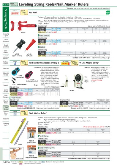 THENUMBERNEXTTOTHELOGOMARKINDICATESITEMSINSTOCKFOREACHBRAND.AT-50AT-52(SPARENEEDLE)AT-51(CALCO)EXAMPLEAFTERSTAMP1285-1(POINTSTAMP)1285-2(SUPPLEMENTARYINK)1285PL-MM77446(AUTOMATICWIND)77453(FIXEDNEEDLE)77456(HANDWIND)SUNFLAGREDREELSTOCK290ITEMSORDERCODEITEMNO.PRICE(PERSET)MSRP(PERSET)TOTALLENGTH(MM)STRINGLENGTH(M)SPQ(SET)WEIGHT(G/SET)351-4587AT-50¥1,500-180106107ORDERUNIT:1SETSHINKIMANUFACTURINGCO.LTDTAKUMI"NAILMARKERRULER"STOCK152ITEMSORDERCODEITEMNO.PRICE(PERPIECE)MSRP(PERPIECE)LXW(MM)SPQ(PIECE)WEIGHT(G)309-75611285¥6,305¥8,8001160X1004800ORDERUNIT:1PIECE(PRICEREVISIONDATE:JAN,2016)TAKUMISHINWAHANDYWHITETHREADBOBBINWINDING2STOCK519ITEMSORDERUNIT:1PIECESHINWARULESCO.LTDORDERCODEITEMNO.PRICE(PERPIECE)MSRP(PERPIECE)TYPECOLORSTRINGLENGTH(M)SPQ(PIECE)WEIGHT(G)765-208977456¥1,543¥2,000HANDWINDGREEN30665765-206277446¥1,929¥2,500AUTOMATICWINDRED15690ORDERUNIT:1BAGORDERCODEITEMNO.PRICE(PERBAG)MSRP(PERBAG)Q'TYPERBAG(PIECE)SPQ(BAG)WEIGHT(G/BAG)765-207177453¥309¥40021510CONTACTUS:0120-666-899HTTP://WWW.SHINWASOKUTEI.CO.JP/ORDERUNIT:1PIECEORDERCODEITEMNO.PRICE(PERPIECE)MSRP(PERPIECE)SPQ(PIECE)WEIGHT(G)309-75871285-2¥414¥580120CONTACTUS:0794-62-6964HTTP://WWW.TAKUMI-BRAND.CO.JP/ORDERUNIT:1PIECEORDERCODEITEMNO.PRICE(PERPIECE)MSRP(PERPIECE)SPQ(PIECE)WEIGHT(G)309-75791285-1¥422¥580120ORDERUNIT:1BAGORDERCODEITEMNO.PRICE(PERBAG)MSRP(PERBAG)ADAPTATIONMODELSQ'TYPERBAG(PIECE)SPQ(BAG)WEIGHT(G/BAG)351-4595AT-51¥330-AT-502108CONTACTUS:06-6971-6131HTTP://WWW.SUNFLAG.CO.JP/ORDERUNIT:1BAGORDERCODEITEMNO.PRICE(PERBAG)MSRP(PERBAG)ADAPTATIONMODELSQ'TYPERBAG(PIECE)SPQ(BAG)WEIGHT(G/BAG)351-4609AT-52¥386-AT-504104FEATURES●ASPARENEEDLECANBESTOREDINTHEBACKPARTOFTHEGRIP.●WITHTHEDEDICATEDSTRING(STRINGFORBAG)THATISLESSKINKING,WORKEFFICIENCYISINCREASED.USE●FORVERTICALADJUSTMENT,LEVELING,REGISTERINGININTERIOR/EXTERIORWORKSRELATINGTOBUILDINGCONSTRUCTION.SETCONTENTS●REDREELMAINBODY,DEDICATEDSTRING,CALCOX2,SPARENEEDLEX2ORIGIN●JAPANSPARENEEDLECALCOPOINTSTAMPSUPPLEMENTARYINKFEATURES●THINANDLIGHTWEIGHTCOMPACTTYPESIZETHATCANBEUSEDANYWHERE.●CANBEDISASSEMBLEDWITHOUTUSINGTOOLS,ANDNEEDLEANDTHREADREPLACEMENTISEASY.●SINCETHEDISTANCEBETWEENNEEDLESISWIDE,THEMAINBODYISSTABLEDURINGPIERCING.●WITHASAFENEEDLECOVER,WHENINUSEYOUCANPRESSTHECOVERSMOOTHLYWITHONEHAND.ORIGIN●CHINAFIXEDNEEDLEFEATURES●CANBEMARKEDATREGULARINTERVALS.●SPEEDSUPNAILDRIVINGWORK.●ACUTTERRULER.USE●FORNAILMARKINGSONINTERIORANDEXTERIORPANELS.●FOREAVESWORKSSCREWMARKING.●TONAILMARKINGTHEBOARDANDPLANK.ACCESSORIES●STAMPX10ORIGIN●JAPANTJMDESIGN"P-LINEMAGNESTRING"STOCK1,907ITEMSORDERCODEITEMNO.PRICE(PERPIECE)MSRP(PERPIECE)STRINGLENGTH(M)SPQ(PIECE)WEIGHT(G)813-4860PL-MM¥2,544¥3,770306150CONTACTUS:0120-125577HTTP://WWW.TAJIMATOOL.CO.JP/ORDERUNIT:1PIECETJMDESIGNCORP.FEATURES●REFERENCEADJUSTMENTOFLGSORIRONFRAMESSPEEDSUP.●ACCORDINGTOUSE,STRINGHEIGHTCANBEADJUSTEDWITHONETOUCHWITHINTHERANGEOF0MM,7TO50MM,100MM.USE●FORREFERENCEADJUSTMENTOFLGSORIRONFRAMES.SPECS●MANUALWINDINGORIGIN●CHINASURVEYINGTOOLSMEASURINGTAPESTAPEMEASURESROADCOUNTERSLINELASERSLASERDISTANCEMETERSROTARYLASERSTHEODOLITESAUTOMATICLEVELSSTAFFSLEVELSSLANTLEVELSSTUDFINDERSPLUMBBOBSINKLINES,CHALKREELSCONSTRUCTIONWRITINGTOOLSBLACKBOARDSSURVEYINGSIGNSSTOCK263ITEMSLEVELINGSTRINGREELS/NAILMARKERRULERS1-2138*0422623*1-2138ORDERCODEYELLOW…INSTANTDELIVERY(JAPANONLY)BLUE…BACKORDER(CARRIAGEEXCLUDED)ITEMNO.PINK…STOCKININDONESIA/THAILAND