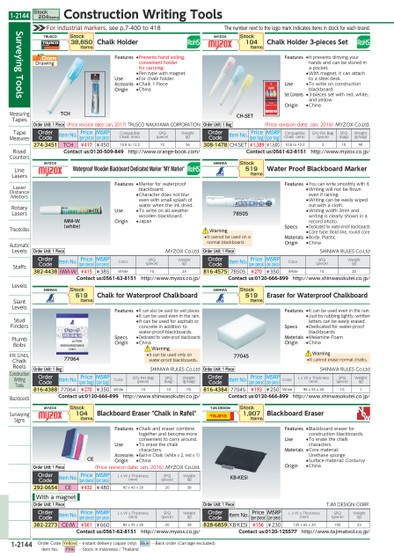 THENUMBERNEXTTOTHELOGOMARKINDICATESITEMSINSTOCKFOREACHBRAND.TCHFORINDUSTRIALMARKERS,SEEP.7-400TO418CH-SETMM-W(WHITE)785057706477045CEKB-KESISTOCK104ITEMSSHINWACHALKFORWATERPROOFCHALKBOARDORDERCODEITEMNO.PRICE(PERBAG)MSRP(PERBAG)COLORQ'TYPERBAG(PIECE)SPQ(BAG)WEIGHT(G/BAG)816-438877064¥270¥350WHITE101070CONTACTUS:0120-666-899HTTP://WWW.SHINWASOKUTEI.CO.JP/STOCK519ITEMSORDERUNIT:1BAGSHINWARULESCO.LTDSTOCK519ITEMSSTOCK1,907ITEMSORDERCODEITEMNO.PRICE(PERPIECE)MSRP(PERPIECE)COMPATIBLECHALK(MM)SPQ(PIECE)WEIGHT(G)274-3451TCH¥417¥45010.8TO12.21026CONTACTUS:0120-509-849HTTP://WWW.ORANGE-BOOK.COM/ORDERUNIT:1PIECE(PRICEREVISIONDATE:JAN,2017)TRUSCONAKAYAMACORPORATIONORDERCODEITEMNO.PRICE(PERPIECE)MSRP(PERPIECE)COLORSPQ(PIECE)WEIGHT(G)382-4438MM-W¥415¥385WHITE1025CONTACTUS:0561-62-8151HTTP://WWW.MYZOX.CO.JP/ORDERUNIT:1PIECEMYZOXCO.LTD.ORDERCODEITEMNO.PRICE(PERPIECE)MSRP(PERPIECE)LXWXTHICKNESS(MM)SPQ(PIECE)WEIGHT(G)292-0654CE¥432¥48085X45X282038ORDERCODEITEMNO.PRICE(PERPIECE)MSRP(PERPIECE)LXWXTHICKNESS(MM)SPQ(PIECE)WEIGHT(G)382-2273CE-M¥561¥66085X45X282038CONTACTUS:0561-62-8151HTTP://WWW.MYZOX.CO.JP/ORDERUNIT:1PIECEORDERUNIT:1PIECE(PRICEREVISIONDATE:JAN,2016)MYZOXCO.LTD.TRUSCOCHALKHOLDERFEATURES●ITCANALSOBEUSEDFORWETPLACES.●ITCANBEUSEDEVENINTHERAIN.●ITCANBEUSEDFORASPHALTORCONCRETEINADDITIONTOWATER-PROOFBLACKBOARDS.SPECS●DEDICATEDFORWATER-PROOFBLACKBOARDSORIGIN●CHINA●ITCANBEUSEDONLYONWATER-PROOFBLACKBOARDS.WARNING●ITCANNOTERASENORMALCHALKS.WARNINGORDERUNIT:1PIECETJMDESIGNCORP.CONTACTUS:0120-125577HTTP://WWW.TAJIMATOOL.CO.JP/STOCK38,650ITEMSMYZOXWATERPROOFWOODENBLACKBOARDDEDICATEDMARKER"MYMARKER"SHINWAWATERPROOFBLACKBOARDMARKERORDERCODEITEMNO.PRICE(PERPIECE)MSRP(PERPIECE)COLORSPQ(PIECE)WEIGHT(G)816-457578505¥270¥350WHITE1020CONTACTUS:0120-666-899HTTP://WWW.SHINWASOKUTEI.CO.JP/STOCK519ITEMSORDERUNIT:1PIECESHINWARULESCO.LTDMYZOXBLACKBOARDERASER"CHALKINRAFEL"STOCK104ITEMSORDERCODEITEMNO.PRICE(PERBAG)MSRP(PERBAG)COMPATIBLECHALK(MM)Q'TYPERBAG(PIECE)SPQ(BAG)WEIGHT(G/BAG)308-1478CH-SET¥1,389¥1,60010.8TO12.231090CONTACTUS:0561-62-8151HTTP://WWW.MYZOX.CO.JP/ORDERUNIT:1BAG(PRICEREVISIONDATE:JAN,2016)MYZOXCO.LTD.CONTACTUS:0120-666-899HTTP://WWW.SHINWASOKUTEI.CO.JP/ORDERUNIT:1PIECESHINWARULESCO.LTDORDERCODEITEMNO.PRICE(PERPIECE)MSRP(PERPIECE)LXWXTHICKNESS(MM)SPQ(PIECE)WEIGHT(G)828-6859KB-KESI¥156¥230120X65X2010025TJMDESIGNBLACKBOARDERASERORDERCODEITEMNO.PRICE(PERPIECE)MSRP(PERPIECE)COLORLXWXTHICKNESS(MM)SPQ(PIECE)WEIGHT(G)816-438477045¥193¥250WHITE98X55X30101SHINWAERASERFORWATERPROOFCHALKBOARDMYZOXCHALKHOLDER3-PIECESSETFEATURES●BLACKBOARDERASERFORCONSTRUCTIONBLACKBOARDS.USE●TOERASETHECHALKCHARACTERS.MATERIALS●COREMATERIAL:URETHANESPONGE●SURFACEMATERIAL:CORDUROYORIGIN●CHINADRAWING.COMFEATURES●PREVENTSHANDSOILING,CONVENIENTHOLDERFORCARRYING.●PENTYPEWITHMAGNET.USE●FORCHALKHOLDER.ACCESSORIES●CHALK1PIECEORIGIN●CHINAFEATURES●MARKERFORWATERPROOFBLACKBOARD.●CHARACTERDOESNOTBLUREVENWITHSMALLSPLASHOFWATERWHENTHEINKDRIED.USE●TOWRITEONALLWEATHERWOODENBLACKBOARD.ORIGIN●JAPANFEATURES●YOUCANWRITESMOOTHLYWITHIT.●WRITINGWILLNOTBEFLOWNEVENIFRAINING.●WRITINGCANBEEASILYWIPEDOUTWITHACLOTH.●WRITINGWIDTH3MMANDWRITINGISCLEARLYSHOWNINARECORDPHOTO.SPECS●DEDICATEDFORWATER-PROOFBLACKBOARDS●CORETYPE:BOLDLINE,ROUNDCOREMATERIALS●BODY:PLASTICORIGIN●CHINA●ITCANNOTBEUSEDONANORMALBLACKBOARD.WARNINGFEATURES●CHALKANDERASERCOMBINETOGETHERANDBECOMEMORECONVENIENTTOCARRYAROUND.USE●TOERASETHECHALKCHARACTERS.ACCESSORIES●BUILT-INCHALK(WHITEX2,REDX1)ORIGIN●CHINAWITHAMAGNETFEATURES●ITCANBEUSEDEVENINTHERAIN.●JUSTBYRUBBINGLIGHTLY,WRITTENLETTERSCANBEEASILYERASED.SPECS●DEDICATEDFORWATER-PROOFBLACKBOARDSMATERIALS●MELAMINEFOAMORIGIN●CHINAFEATURES●ITPREVENTSDIRTYINGYOURHANDSANDCANBESTOREDINAPOCKET.●WITHMAGNET,ITCANATTACHTOASTEELDESK.USE●TOWRITEONCONSTRUCTIONBLACKBOARD.SETCONTENTS●3-PIECESSETWITHRED,WHITE,ANDYELLOWORIGIN●CHINASURVEYINGTOOLSMEASURINGTAPESTAPEMEASURESROADCOUNTERSLINELASERSLASERDISTANCEMETERSROTARYLASERSTHEODOLITESAUTOMATICLEVELSSTAFFSLEVELSSLANTLEVELSSTUDFINDERSPLUMBBOBSINKLINES,CHALKREELSCONSTRUCTIONWRITINGTOOLSBLACKBOARDSSURVEYINGSIGNSSTOCK204ITEMSCONSTRUCTIONWRITINGTOOLS1-2144*0422792*1-2144ORDERCODEYELLOW…INSTANTDELIVERY(JAPANONLY)BLUE…BACKORDER(CARRIAGEEXCLUDED)ITEMNO.PINK…STOCKININDONESIA/THAILAND
