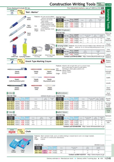PRICESDISPLAYEDINCLUDE8%TAX.FORINDUSTRIALMARKERS,SEEP.7-400TO4187830(BLUE)7831(WHITE)7832(RED)7837(REFILL/RED)7840(CARRYINGHOLDER)C801(WHITE)C803(RED)78445(BLACK)78446(RED)78447(YELLOW)78448(WHITE)78449(FLUORESCENTPINK)78462(REFILL/FLUORESCENTPINK)78463(BLACK)78465(WHITE)78464(RED)HANGINGIMAGETOABAGATTACHINGIMAGETOABELTSHINWAKNOCKTYPEMARKINGCRAYONSTOCK519ITEMSORDERUNIT:1PIECEORDERCODEITEMNO.PRICE(PERPIECE)MSRP(PERPIECE)COLORSPQ(PIECE)WEIGHT(G)816-454278463¥386¥500BLACK1017816-454378464¥386¥500RED1017816-454478465¥386¥500WHITE1017ORDERUNIT:1PIECESHINWARULESCO.LTDORDERCODEITEMNO.PRICE(PERPIECE)MSRP(PERPIECE)COLORSPQ(PIECE)WEIGHT(G)816-453078445¥231¥300BLACK1011816-453178446¥231¥300RED1011816-453278447¥231¥300YELLOW1011816-453378448¥231¥300WHITE1011816-453478449¥231¥300FLUORESCENTPINK1011MYZOXCHALKSTOCK104ITEMSORDERUNIT:1BOXMYZOXCO.LTD.ORDERCODEITEMNO.PRICE(PERBOX)MSRP(PERBOX)COLORQ'TYPERBOX(PIECE)SPQ(BOX)WEIGHT(G/BOX)308-1451C801¥247¥250WHITE101074308-1460C803¥401¥400RED101074CONTACTUS:0561-62-8151HTTP://WWW.MYZOX.CO.JP/TAKUMI"BUIL:MARKER"STOCK152ITEMSORDERUNIT:1PIECEORDERCODEITEMNO.PRICE(PERPIECE)MSRP(PERPIECE)SPQ(PIECE)WEIGHT(G)837-07487840¥421¥6005105CONTACTUS:0794-62-6964HTTP://WWW.TAKUMI-BRAND.CO.JP/ORDERUNIT:1BOXORDERCODEITEMNO.PRICE(PERBOX)MSRP(PERBOX)COLORQ'TYPERBOX(PIECE)SPQ(PIECE)WEIGHT(G/BOX)837-07457835¥562¥800BLUE10582837-07467836¥562¥800WHITE10582837-07477837¥562¥800RED10582ORDERUNIT:1PIECETAKUMIORDERCODEITEMNO.PRICE(PERPIECE)MSRP(PERPIECE)COLORSPQ(PIECE)WEIGHT(G)837-07427830¥562¥800BLUE537837-07437831¥562¥800WHITE537837-07447832¥562¥800RED537FEATURES●HANDSWILLNOTGETDIRTYASITISAKNOCKTYPE.●ITISAPENTYPESOEASYTOWRITELETTERS.USE●WRITINGONSTEEL,GLASS,PLASTICSETC.MATERIALS●BODY:PLASTIC●CORE:CRAYONORIGIN●CHINA4.0MM7.0MMFEATURES●RAINRESISTANTCHALK,WORRYONLETTERSFADINGORERASEDDUETORAINISNOLONGERNEEDED.USE●TOWRITEONCONSTRUCTIONBLACKBOARD.ORIGIN●JAPANFEATURES●ACORECANBEREFILLEDWITHOUTREMOVINGACAP●EASY-TO-USEKNOCKTYPEHOLDER●HEAT-RESISTANTANDWATER-RESISTANTCHALKUSE●WRITINGTOOLFORBUILDINGCONSTRUCTION.SPECS●COREDIAMETER:5MMORIGIN●CHINAFEATURES●YOUCANSELECT2-WAYUSEFORHANGINGTOABAGORATTACHINGTOABELT.SPECS●BODYSIZE:143X62X40MM(EXCLUDINGFASTENINGBRACKETTOABELT)ORDERUNIT:1BAGORDERCODEITEMNO.PRICE(PERBAG)MSRP(PERBAG)COLORQ'TYPERBAG(PIECE)SPQ(PIECE)WEIGHT(G)816-454578466¥309¥400BLACK21018816-454678467¥309¥400RED21018816-454778469¥309¥400WHITE21018CONTACTUS:0120-666-899HTTP://WWW.SHINWASOKUTEI.CO.JP/ORDERUNIT:1BAGORDERCODEITEMNO.PRICE(PERBAG)MSRP(PERBAG)COLORQ'TYPERBAG(PIECE)SPQ(BAG)WEIGHT(G/BAG)816-453778458¥193¥250BLACK41010.2816-453878459¥193¥250RED41010.2816-453978460¥193¥250YELLOW41010.2816-454078461¥193¥250WHITE41010.2816-454178462¥193¥250FLUORESCENTPINK41010.2REFILL(7.0MM)REFILL(4.0MM)REFILL(10PIECES)CARRYINGHOLDERSURVEYINGTOOLSMEASURINGTAPESTAPEMEASURESROADCOUNTERSLINELASERSLASERDISTANCEMETERSROTARYLASERSTHEODOLITESAUTOMATICLEVELSSTAFFSLEVELSSLANTLEVELSSTUDFINDERSPLUMBBOBSINKLINES,CHALKREELSCONSTRUCTIONWRITINGTOOLSBLACKBOARDSSURVEYINGSIGNSCONSTRUCTIONWRITINGTOOLSSTOCK204ITEMS1-2145*0422756*1-2145DELIVERYESTIMATE★…MANUFACTURERSTOCK★…DELIVERYWITHIN7WORKINGDAYS★…ASK